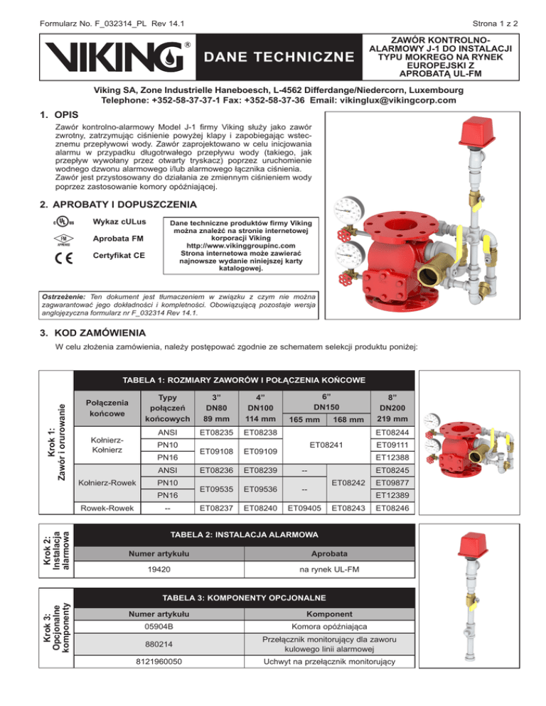 Formularz No. F_032314_PL Rev 14.1 Strona 1 z 2 DANE TECHNICZNE ZAWÓR KONTROLNOALARMOWY J-1 DO INSTALACJI TYPU MOKREGO NA RYNEK EUROPEJSKI Z APROBATĄ UL-FM Viking SA, Zone Industrielle Haneboesch, L-4562 Differdange/Niedercorn, Luxembourg Telephone: +352-58-37-37-1 Fax: +352-58-37-36 Email: [email protected] 1. OPIS Zawór kontrolno-alarmowy Model J-1 firmy Viking służy jako zawór zwrotny, zatrzymując ciśnienie powyżej klapy i zapobiegając wstecznemu przepływowi wody. Zawór zaprojektowano w celu inicjowania alarmu w przypadku długotrwałego przepływu wody (takiego, jak przepływ wywołany przez otwarty tryskacz) poprzez uruchomienie wodnego dzwonu alarmowego i/lub alarmowego łącznika ciśnienia. Zawór jest przystosowany do działania ze zmiennym ciśnieniem wody poprzez zastosowanie komory opóźniającej. 2. APROBATY I DOPUSZCZENIA Wykaz cULus Aprobata FM Certyfikat CE Dane techniczne produktów firmy Viking można znaleźć na stronie internetowej korporacji Viking http://www.vikinggroupinc.com Strona internetowa może zawierać najnowsze wydanie niniejszej karty katalogowej. Ostrzeżenie: Ten dokument jest tłumaczeniem w związku z czym nie można zagwarantować jego dokładności i kompletności. Obowiązującą pozostaje wersja anglojęzyczna formularz nr F_032314 Rev 14.1. 3. KOD ZAMÓWIENIA W celu złożenia zamówienia, należy postępować zgodnie ze schematem selekcji produktu poniżej: Krok 1: Zawór i orurowanie TABELA 1: ROZMIARY ZAWORÓW I POŁĄCZENIA KOŃCOWE Połączenia końcowe Typy połączeń końcowych 3” DN80 89 mm 4” DN100 114 mm ANSI ET08235 ET08238 ET09108 ET09109 ET08236 ET08239 KołnierzKołnierz PN10 Kołnierz-Rowek PN10 PN16 ANSI PN16 Krok 3: Opcjonalne komponenty Krok 2: Instalacja alarmowa Rowek-Rowek -- 6” DN150 165 mm 168 mm 8” DN200 219 mm ET08244 ET08241 ET09111 ET12388 -- ET08245 ET08242 ET09535 ET09536 -- ET08237 ET08240 ET09405 ET09877 ET12389 ET08243 ET08246 TABELA 2: INSTALACJA ALARMOWA Numer artykułu Aprobata 19420 na rynek UL-FM TABELA 3: KOMPONENTY OPCJONALNE Numer artykułu Komponent 05904B Komora opóźniająca 880214 Przełącznik monitorujący dla zaworu kulowego linii alarmowej 8121960050 Uchwyt na przełącznik monitorujący Formularz No. F_032314_PL Rev 14.1 Strona 2 z 2 ZAWÓR KONTROLNOALARMOWY J-1 DO INSTALACJI TYPU MOKREGO NA RYNEK EUROPEJSKI Z APROBATĄ UL-FM DANE TECHNICZNE Viking SA, Zone Industrielle Haneboesch, L-4562 Differdange/Niedercorn, Luxembourg Telephone: +352-58-37-37-1 Fax: +352-58-37-36 Email: [email protected] 4. DIMENSIONS Rozmiar A B C D E F G H I 3” DN80 258.8 184.2 220.0 209.5 261.3 401.3 190.9 158.5 130.2 4” DN100 269.9 187.3 241.0 221.6 282.3 391.4 192.4 161.1 180.2 6” DN150 339.7 257.2 243.2 244.4 284.5 337.8 246.1 185.9 180.2 8” DN200 431.8 211.1 285.7 269.8 327.0 275.9 169.9 211.3 180.2 Wszystkie wymiary podane w przybliżeniu. 5. MONTAŻ 1. Przymocować manometry wraz z zaworami odcinającymi do zaworu (1) 2. Przymocować orurowanie podstawowe do zaworu poprzez dokręcenie trzech złączek (2) 3. Przymocować instalację alarmową do orurowania podstawowego poprzez dokręcenie złączki (3) 4. Jeśli wymagana jest komora opóźniająca, należy usunąć reduktor ½” x ¾” z linii alarmowej (4) i zamontować komorę opóźniającą. Reduktor został zamontowany z użyciem taśmy teflonowej w celu zapewnienia łatwego usunięcia. 4 1 2 3