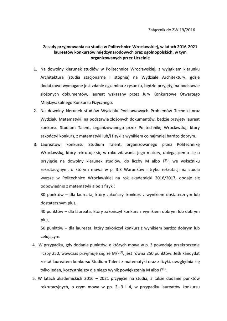 Załącznik do ZW 19/2016 Zasady przyjmowania na studia w Politechnice Wrocławskiej, w latach 2016-2021 laureatów konkursów międzynarodowych oraz ogólnopolskich, w tym organizowanych przez Uczelnię 1. Na dowolny kierunek studiów w Politechnice Wrocławskiej, z wyjątkiem kierunku Architektura (studia stacjonarne I stopnia) na Wydziale Architektury, gdzie dodatkowo wymagane jest zdanie egzaminu z rysunku, będzie przyjęty, na podstawie złożonych dokumentów, laureat wskazany przez Jury Konkursowe Otwartego Międzyszkolnego Konkursu Fizycznego. 2. Na dowolny kierunek studiów Wydziału Podstawowych Problemów Techniki oraz Wydziału Matematyki, na podstawie złożonych dokumentów, będzie przyjęty laureat konkursu Studium Talent, organizowanego przez Politechnikę Wrocławską, który zakończył konkurs, z matematyki lub/i fizyki z wynikiem co najmniej bardzo dobrym. 3. Laureatowi konkursu Studium Talent, organizowanego przez Politechnikę Wrocławską, który rekrutuje się w roku zdawania jego matury, ubiegającemu się o przyjęcie na dowolny kierunek studiów, do liczby M albo F(1), we wskaźniku rekrutacyjnym, o którym mowa w p. 3.3 Warunków i trybu rekrutacji na studia wyższe w Politechnice Wrocławskiej na rok akademicki 2016/2017, dodaje się odpowiednio z matematyki albo z fizyki: 30 punktów – dla laureata, który zakończył konkurs z wynikiem dostatecznym lub dostatecznym plus, 40 punktów – dla laureata, który zakończył konkurs z wynikiem dobrym lub dobrym plus, 50 punktów – dla laureata, który zakończył konkurs z wynikiem bardzo dobrym lub celującym. 4. W przypadku, gdy dodanie punktów, o których mowa w p. 3 powoduje przekroczenie liczby 250, wówczas przyjmuje się, że M/F(1), jest równa 250 punktów. Jeśli kandydat został laureatem konkursu Studium Talent z matematyki oraz z fizyki, uwzględnia się tylko jeden, korzystniejszy dla niego wynik powiększenia M albo F(1). 5. W latach akademickich 2016 – 2021 przyjęcie na studia, a także dodanie punktów rekrutacyjnych, o czym mowa w pp. 2, 3 i 4, w przypadku laureatów konkursu Studium Talent, jest możliwe tylko jeden raz i tylko w tej rekrutacji, która odbywa się w roku uzyskania, przez laureata i kandydata na studia, świadectwa maturalnego, przy czym podstawą może być wynik konkursu uzyskany zarówno w roku zdawania egzaminu maturalnego, jak i w latach wcześniejszych. 6. Na dowolny kierunek studiów Wydziału Podstawowych Problemów Techniki oraz Wydziału Matematyki, na podstawie złożonych dokumentów, będzie przyjęty laureat w kategorii L1 (licealiści) finału krajowego konkursu Mistrzostwa Polski w Grach Matematycznych i Logicznych, organizowanego przez Politechnikę Wrocławską.