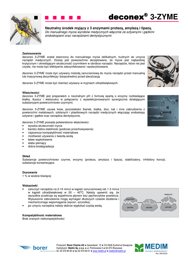 ■ ■ ■ ■ ■ ■ deconex deconex® 3-ZYME Neutralny środek myjący z 3 enzymami protezą, amylazą i lipazą. Do manualnego mycia wyrobów medycznych włącznie ze sztywnymi i giętkimi endoskopami oraz narzędziami dentystycznymi. Zastosowanie deconex 3-ZYME został stworzony do manualnego mycia delikatnych, trudnych do umycia narzędzi medycznych. Dzisiaj jest powszechnie akceptowane, że mycie jest najbardziej krytycznym i określającym skuteczność czynnikiem w obróbce narzędzi. Narzędzie, które nie jest czyste, nie może być efektywnie zdezynfekowane i wysterylizowane. deconex 3-ZYME może być używany metodą zanurzeniową do mycia narzędzi przed manualną lub maszynową dezynfekcją i bezpośrednio przed sterylizacją deconex 3-ZYME może być również używany w myjniach ultradźwiękowych. Właściwości deconex 3-ZYME jest preparatem o neutralnym pH z formułą opartą o enzymy rozkładające białka, tłuszcz i wielocukry w połączeniu z wyselekcjonowanymi synergicznie działającymi substancjami powierzchniowo czynnymi. deconex 3-ZYME usuwa krew, pozostałości tkanek, białka, śluz, kał i inne zabrudzenia z powierzchni metalowych, szklanych i plastikowych narzędzi medycznych włączając endoskopy sztywne i giętkie oraz narzędzia dentystyczne. deconex 3-ZYME posiada potwierdzone właściwości: • wysoka skuteczność mycia • bardzo dobra stabilność (podczas przechowywania) • najszersza kompatybilność materiałowa • możliwość używania z twardą wodą • łatwe wypłukiwanie • słabo pieniący • dobra biodegradacja Skład Substancje powierzchniowo czynne, enzymy (proteza, amylaza i lipaza), stabilizatory, inhibitory korozji, substancje konserwujące. Dozowanie 1 % w wodzie bieżącej Wskazówki • zanurzyć narzędzia na 2-10 minut w kąpieli zanurzeniowej lub 1-3 minut o w kąpieli ultradźwiękowej w 20 – 40 C. Należy upewnić się, że wszystkie przekroje są wypełnione płynem bez pęcherzyków powietrza. Wysuszone zabrudzenia mogą wymagać dłuższych czasów działania i mechanicznego wspomagania (wycior, szczotka), • po umyciu narzędzia należy dobrze wypłukać czystą wodą. Kompatybilność materiałowa Brak znanych niekompatybilności Producent: Borer Chemie AG ● Gewerbestr. 13 ● CH-4528 Zuchwil ● Szwajcaria Dystrybutor: Medim Sp. z o.o. ● ul. Piotrkowska 5 ● 02-375 Warszawa tel. 22 570 90 00 ● fax 22 570 90 01 ● www.medim.pl ● [email protected] Rev. 2007/04/23 ■ ■ ■ ■ ■ ■ Dane fizyko-chemiczne pH gęstość wygląd deconex deconex® 3-ZYME 1% roztwór w wodzie demi koncentrat koncentrat około 8.5 1.06 g/ml przezroczysty, ciemnożółty płyn Dostępność Proszę pytać lokalnego dystrybutora o dostępne wielkości opakowań. Pojemniki, zakrętki i etykiety są wykonane z polietylenu podlegającemu recyklingowi. Są dostępne urządzenia dozujące, jak: pompki, dozowniki miarki, itp. Dodatkowe informacje Informacje dotyczące bezpieczeństwa pracy, przechowywania, usuwania odpadów znajdują się w karcie charakterystyki substancji niebezpiecznej. Proszę skorzystać z naszego know-how ! Proszę się z nami skontaktować, aby zastosować nasze produkty do Państwa specyficznych zastosowań. Wszystkie powyższe informacje są oparte na naszej aktualnej wiedzy i nie mogą stanowić zabezpieczenia specyficznych właściwości produktu. Producent: Borer Chemie AG ● Gewerbestr. 13 ● CH-4528 Zuchwil ● Szwajcaria Dystrybutor: Medim Sp. z o.o. ● ul. Piotrkowska 5 ● 02-375 Warszawa tel. 22 570 90 00 ● fax 22 570 90 01 ● www.medim.pl ● [email protected] Rev. 2007/04/23