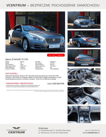 Jaguar XJ SalonPL FV 23% Marka: Model: Rok Produkcji: Pojemność silnika : Kolor Nadwozia: Skrzynia biegów: Jaguar XJ 2013 2993 cm3 Srebrny Automat Przebieg : Moc silnika : Kolor Wnętrza: Rodzaj nadwozia: Ilość drzwi: Rodzaj paliwa: 34000 km 275 KM Beżowy Limuzyna 4/5 Olej napędowy OPIS POJAZDU: Dokument sprzedaży: Faktura VAT 23% Data pierwszej rejestracji: 05.03.2013 Rok produkcji: 2013 Salon PL Przebieg: 34000 km Samochód w ciągłej eksploatacji, w razie zainteresowania prosimy o kontakt z doradcą. There are no features available FINANSOWANIE I UBEZPIECZENIA: Cena: 209 000 PLN Przykładowa rata miesięczna, wpłata 20%, okres leasingu/kredytu 48 miesięcy, 10% wykupu. Rata leasingu jest wartością netto bez vat. Niniejsza treść nie stanowi oferty w rozumieniu przepisów Kodeksu Cywilnego oraz opisu towaru ani zapewnienia w rozumieniu art. 4 Ustawy z dnia 27 lipca 2002r o szczególnych warunkach sprzedaży konsumenckiej. Powered by TCPDF (www.tcpdf.org)