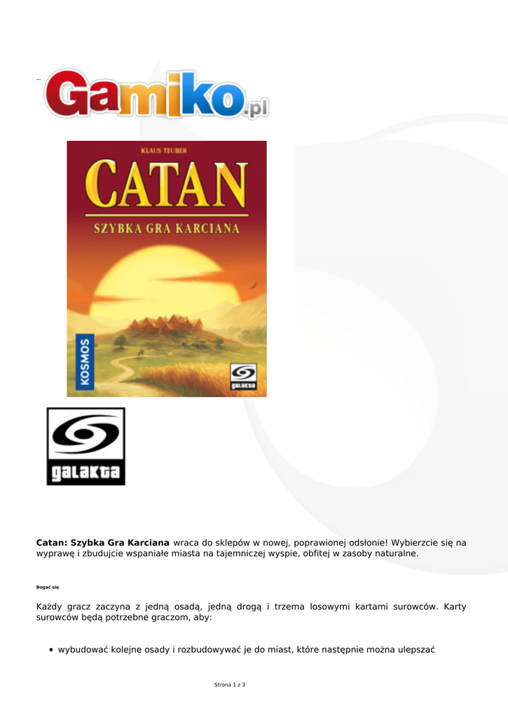 Catan: Szybka Gra Karciana wraca do sklepów w nowej, poprawionej odsłonie! Wybierzcie się na wyprawę i zbudujcie wspaniałe miasta na tajemniczej wyspie, obfitej w zasoby naturalne. Bogać się Każdy gracz zaczyna z jedną osadą, jedną drogą i trzema losowymi kartami surowców. Karty surowców będą potrzebne graczom, aby: wybudować kolejne osady i rozbudowywać je do miast, które następnie można ulepszać Strona 1 z 3 wytyczać nowe drogi rekrutować rycerzy Surowce można pozyskiwać na kilka sposobów, w tym rozbudowując osady do miast, wymieniając się z innymi graczami oraz po prostu dobierając dwie karty na koniec rundy (więcej, jeśli gracz ma rycerzy). Handluj Aby prowadzić wymianę surowców z innymi graczami, należy wybudować drogi. Za każdą aktywną drogę, która leży przed graczem, może on wymienić jedną kartę z talią, z rynkiem lub z innym graczem. Nie jest to jednak zwykła wymiana - w tej transakcji gracz posiadający drogę ma przewagę - losuje z zakrytej ręki wybranego przez siebie przeciwnika maksymalnie tyle kart surowców, ile ma przed sobą dróg. Następnie oddaje mu taką samą liczbę kart. W ten sposób może oddać nawet te karty, które mu zabrał. Buduj Ostatecznym celem gry, jest zebranie dziesięciu punktów zwycięstwa. Gracz, który podczas swojej kolejki zgromadzi dziesięć punktów, wygrywa grę i zostaje najlepszym osadnikiem. Gracze zdobywają punkty za budowanie dróg, osad, rozwijanie miast i rekrutowanie rycerzy. Aby łatwo można było policzyć punkty w każdej turze, na kartach są one zaznaczone symbolem wschodzącego słońca, znanego z okładki gry Catan. Wygrywaj Jeśli szukasz szybkiej, przyjemnej gry, w którą możesz zagrać z każdym - właśnie ją znalazłeś. Przyjazne zasady, piękne grafiki i ciekawy system gry zapewni Wam wiele miłych doświadczeń. Wiek 10 + Liczba graczy 2 Czas gry ok. 75 - 90 minut Strona 2 z 3 Instrukcja polska Wydanie polskie Producent Galakta Projektant Klaus Teuber Strona 3 z 3