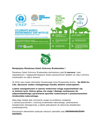 Świętujmy Światowy Dzień Ochrony Środowiska ! Światowy Dzień Ochrony Środowiska obchodzony jest 5 czerwca i jest największym i najpopularniejszym dniem pozytywnych działań na rzecz ochrony środowiska na całym świecie. W 2016 roku hasło obchodów Światowego Dnia Środowiska brzmi: Go Wild for Life. Sprzeciw wobec nielegalnego handlu dzikimi zwierzętami. Ludzie zaangażowani w sporty motorowe mogą wypowiedzieć się w imieniu tych, którzy głosu nie mają i dlatego zachęcamy do odpowiedzialnego uprawiania sportów motorowych z poszanowaniem środowiska naturalnego. Ideą tego święta jest zwrócenie uwagi na problemy związane z zanieczyszczeniem i ochroną środowiska naturalnego, podnoszenie świadomości ekologicznej, a także pobudzenie do aktywnej działalności proekologicznej. Kluczowym elementem podczas naszych zawodów jest ZRÓWNOWAŻONY ROZWÓJ. Zrównoważony rozwój jest to taki rozwój, który zapewnia zaspokojenie potrzeb obecnych pokoleń, nie przekreślając możliwości zaspokojenia potrzeb pokoleń następnych. A zatem niezbędna jest zmiana naszych przyzwyczajeń i odnoszenia się do organizacji zawodów w sportach motorowych. Pokażmy, że nie jest nam obojętne, w jakim środowisku uprawiamy naszą ulubioną dyscyplinę sportu! Zachęcamy organizatorów zawodów, imprez motorowych - zwłaszcza 5 czerwca – ale też w całym miesiącu do podejmowania i zgłaszanie inicjatyw związanych z ochroną środowiska. Zaproście do współpracy znanych ludzi , celebrytów, którzy zechcą wraz z Wami popularyzować idee poszanowania środowiska naturalnego. Troska o przyrodę to nie tylko wymierne korzyści dla środowiska, ale także dla portfela. Oszczędzając prąd, wodę, oszczędzasz swoje pieniądze. Pomyślcie Państwo jak niewielkim wysiłkiem możemy dużo zdziałać, żeby uświetnić nasze imprezy motorowe i nie niszczyć tego, co mamy.