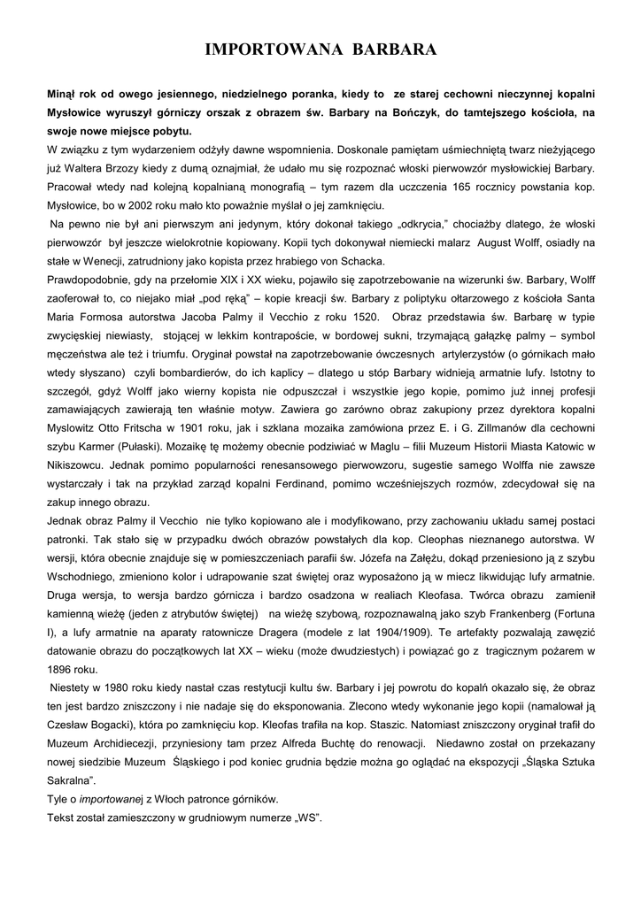IMPORTOWANA BARBARA Minął rok od owego jesiennego, niedzielnego poranka, kiedy to ze starej cechowni nieczynnej kopalni Mysłowice wyruszył górniczy orszak z obrazem św. Barbary na Bończyk, do tamtejszego kościoła, na swoje nowe miejsce pobytu. W związku z tym wydarzeniem odżyły dawne wspomnienia. Doskonale pamiętam uśmiechniętą twarz nieżyjącego już Waltera Brzozy kiedy z dumą oznajmiał, że udało mu się rozpoznać włoski pierwowzór mysłowickiej Barbary. Pracował wtedy nad kolejną kopalnianą monografią – tym razem dla uczczenia 165 rocznicy powstania kop. Mysłowice, bo w 2002 roku mało kto poważnie myślał o jej zamknięciu. Na pewno nie był ani pierwszym ani jedynym, który dokonał takiego „odkrycia,” chociażby dlatego, że włoski pierwowzór był jeszcze wielokrotnie kopiowany. Kopii tych dokonywał niemiecki malarz August Wolff, osiadły na stałe w Wenecji, zatrudniony jako kopista przez hrabiego von Schacka. Prawdopodobnie, gdy na przełomie XIX i XX wieku, pojawiło się zapotrzebowanie na wizerunki św. Barbary, Wolff zaoferował to, co niejako miał „pod ręką” – kopie kreacji św. Barbary z poliptyku ołtarzowego z kościoła Santa Maria Formosa autorstwa Jacoba Palmy il Vecchio z roku 1520. Obraz przedstawia św. Barbarę w typie zwycięskiej niewiasty, stojącej w lekkim kontrapoście, w bordowej sukni, trzymającą gałązkę palmy – symbol męczeństwa ale też i triumfu. Oryginał powstał na zapotrzebowanie ówczesnych artylerzystów (o górnikach mało wtedy słyszano) czyli bombardierów, do ich kaplicy – dlatego u stóp Barbary widnieją armatnie lufy. Istotny to szczegół, gdyż Wolff jako wierny kopista nie odpuszczał i wszystkie jego kopie, pomimo już innej profesji zamawiających zawierają ten właśnie motyw. Zawiera go zarówno obraz zakupiony przez dyrektora kopalni Myslowitz Otto Fritscha w 1901 roku, jak i szklana mozaika zamówiona przez E. i G. Zillmanów dla cechowni szybu Karmer (Pułaski). Mozaikę tę możemy obecnie podziwiać w Maglu – filii Muzeum Historii Miasta Katowic w Nikiszowcu. Jednak pomimo popularności renesansowego pierwowzoru, sugestie samego Wolffa nie zawsze wystarczały i tak na przykład zarząd kopalni Ferdinand, pomimo wcześniejszych rozmów, zdecydował się na zakup innego obrazu. Jednak obraz Palmy il Vecchio nie tylko kopiowano ale i modyfikowano, przy zachowaniu układu samej postaci patronki. Tak stało się w przypadku dwóch obrazów powstałych dla kop. Cleophas nieznanego autorstwa. W wersji, która obecnie znajduje się w pomieszczeniach parafii św. Józefa na Załężu, dokąd przeniesiono ją z szybu Wschodniego, zmieniono kolor i udrapowanie szat świętej oraz wyposażono ją w miecz likwidując lufy armatnie. Druga wersja, to wersja bardzo górnicza i bardzo osadzona w realiach Kleofasa. Twórca obrazu kamienną wieżę (jeden z atrybutów świętej) zamienił na wieżę szybową, rozpoznawalną jako szyb Frankenberg (Fortuna I), a lufy armatnie na aparaty ratownicze Dragera (modele z lat 1904/1909). Te artefakty pozwalają zawęzić datowanie obrazu do początkowych lat XX – wieku (może dwudziestych) i powiązać go z tragicznym pożarem w 1896 roku. Niestety w 1980 roku kiedy nastał czas restytucji kultu św. Barbary i jej powrotu do kopalń okazało się, że obraz ten jest bardzo zniszczony i nie nadaje się do eksponowania. Zlecono wtedy wykonanie jego kopii (namalował ją Czesław Bogacki), która po zamknięciu kop. Kleofas trafiła na kop. Staszic. Natomiast zniszczony oryginał trafił do Muzeum Archidiecezji, przyniesiony tam przez Alfreda Buchtę do renowacji. Niedawno został on przekazany nowej siedzibie Muzeum Śląskiego i pod koniec grudnia będzie można go oglądać na ekspozycji „Śląska Sztuka Sakralna”. Tyle o importowanej z Włoch patronce górników. Tekst został zamieszczony w grudniowym numerze „WS”. Wbrew wcześniejszym obawom autorowi udało się zlokalizować miejsca, w których obecnie znajdują się wszystkie trzy obrazy św. Barbary z kopalni Kleofas, wzorowane lub nawiązujące do oryginału z Wenecji. Tymi miejscami są: parafia św. Józefa na Załężu, pomieszczenia Związku Zawodowego Ratowników Górniczych KWK Murcki – Staszic (kopia Cz. Bogackiego), oraz nowa siedziba Muzeum Śląskiego (przed wejściem do galerii „Śląska Sztuka Sakralna” otwartej 20.XII.2015). Czwarty obraz z kopalni Kleofas przeniesiony został - tym razem z honorami do kościoła Podwyższenia Krzyża Św. i św. Huberta na osiedlu Witosa. Autor Aleksander Zembok Członek Bractwa Gwarków