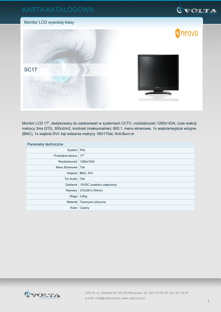 KARTA KATALOGOWA Monitor LCD wysokiej klasy SC17 Monitor LCD 17", dedykowany do zastosowań w systemach CCTV, rozdzielczość 1280x1024, czas reakcji matrycy 3ms GTG, 300cd/m2, kontrast (maksymalnie): 800:1, menu ekranowe, 1x wejście/wyjście wizyjne (BNC), 1x wejście DVI; kąt widzenia matrycy 160/170st; Anti-Burn-in Parametry techniczne System PAL Przekątna ekranu 17" Rozdzielczość 1280x1024 Menu Ekranowe Tak Wejście BNC, DVI Tor Audio Tak Zasilanie 12VDC (zasilacz załączony) Wymiary 372x361x164mm Waga 3,6kg Materiał Tworzywo sztuczne Kolor Czarny VOLTA, ul. Jutrzenki 94, 02-230 Warszawa, tel. 022 572 90 20, 022 331 33 00 e-mail: [email protected], www.volta.com.pl 1
