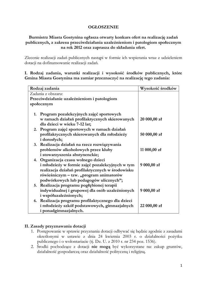 OGŁOSZENIE Burmistrz Miasta Gostynina ogłasza otwarty konkurs ofert na realizację zadań publicznych, z zakresu przeciwdziałania uzależnieniom i patologiom społecznym na rok 2012 oraz zaprasza do składania ofert. Zlecenie realizacji zadań publicznych nastąpi w formie ich wspierania wraz z udzieleniem dotacji na dofinansowanie realizacji zadań. I. Rodzaj zadania, warunki realizacji i wysokość środków publicznych, które Gmina Miasta Gostynina ma zamiar przeznaczyć na realizację tego zadania: Rodzaj zadania Zadania z obszaru: Przeciwdziałanie uzależnieniom i patologiom społecznym Wysokość środków 1. Program pozalekcyjnych zajęć sportowych 2. 3. 4. 5. 6. w ramach działań profilaktycznych skierowanych dla dzieci w wieku 7-12 lat; Program zajęć sportowych w ramach działań profilaktycznych skierowanych dla młodzieży i dorosłych; Realizacja działań na rzecz rozwiązywania problemów alkoholowych przez kluby i stowarzyszenia abstynenckie; Organizacja czasu wolnego dzieci i młodzieży w formie zajęć pozalekcyjnych w tym realizacja działań profilaktycznych w środowisku rówieśniczym – tzw. „program animatorów podwórkowych lub pedagogów ulicznych”; Realizacja programu pogłębionej terapii indywidualnej i grupowej dla osób uzależnionych i współuzależnionych; Realizacja programu profilaktycznego dla dzieci i młodzieży szkół podstawowych, gimnazjalnych i ponadgimnazjalnych. 20 000,00 zł 50 000,00 zł 11 000,00 zł 9 000,00 zł 9 000,00 zł 22 000,00 zł II. Zasady przyznawania dotacji 1. Postępowanie w sprawie przyznania dotacji odbywać się będzie zgodnie z zasadami określonymi w ustawie z dnia 24 kwietnia 2003 r. o działalności pożytku publicznego i o wolontariacie (tj. Dz. U. z 2010 r. nr 234 poz. 1536). 2. Środki pochodzące z dotacji nie mogą być wykorzystane na: zakup gruntów, działalność gospodarczą oraz działalność polityczną i religijną. 1 III. Termin realizacji zadań Zadania muszą być realizowane w roku 2012 z zastrzeżeniem, iż szczegółowe terminy wykonania zadania zostaną określone w umowach. IV. Warunki realizacji zadań, o których mowa w części I. 1. Realizacja zadania, o którym mowa w części I pkt 1 powinna polegać na prowadzeniu pozalekcyjnych zajęć sportowych, które nie mogą stanowić jedynie samodzielnej strategii profilaktycznej, lecz będą integralnym elementem programu profilaktycznego. Odbiorcami programu powinna być szersza grupa dzieci bez względu na stopień indywidualnego ryzyka występowania problemów alkoholowych. Zadanie to powinno obejmować: prowadzenie zajęć sportowych poprzedzonych spisaniem kontraktu z uczestnikami programu i zobowiązanie ich do przestrzegania regulaminu np.: zakaz używek, przeklinania, reguły fair-play itp. trening umiejętności życiowych poprzez uczenie rozwiązywania konfliktów, gry fair-play, radzenia sobie z trudnymi emocjami, ponoszenia konsekwencji decyzji, komunikacji w grupie. Rekomendowane jest objęcie treningiem dzieci z grup ryzyka; współpracę z rodzicami poprzez angażowanie ich do udziału w zawodach razem z dziećmi, oraz umożliwienie im podejmowania i realizowania własnych pomysłów dotyczących pozalekcyjnych zajęć sportowych. 2. Realizacja zadania, o którym mowa w części I pkt 2 powinna polegać na prowadzeniu zajęć sportowych, które stanowią integralny element programu profilaktycznego adresowanego do młodzieży i dorosłych bez względu na stopień indywidualnego ryzyka występowania problemów alkoholowych. Celem programu profilaktycznego powinno być zmniejszenie lub eliminowanie czynników ryzyka sprzyjających rozwojowi problemów uzależnień m.in. poprzez wdrażanie programu opóźniania inicjacji alkoholowej i nikotynowej adresowanej do młodzieży wchodzącej w okres eksperymentowania z substancjami psychoaktywnymi. Zajęcia sportowe powinny odwoływać się do strategii profilaktycznych np.: „prawdziwy sportowiec prowadzi zdrowy styl życia, nie pije, nie pali, nie używa narkotyków, sterydów”. Zaleca się, aby uczestnicy zajęć podpisali kontrakt, który zobowiązuje ich do przestrzegania regulaminu np.: zakaz używek, przeklinania, reguły fair-play itp. 2 Osoby prowadzące zajęcia powinny mieć odpowiednie kompetencje merytoryczne z zakresu zasad pracy z młodzieżą – również z grup ryzyka, oraz powinny być dobrym przykładem dla odbiorców programu, aby przekaz profilaktyczny był zgodny z ich rzeczywistymi zachowaniami. Przyznana dotacja na realizację powyższego zadania może być wykorzystana na: zatrudnienie animatorów prowadzących działania sportowe i edukacyjno-profilaktyczne, zakupy sprzętu sportowego, nagród i pucharów, wyżywienie, noclegi, koszty sędziowania, transport, usługi medyczne, opłaty licencyjne, wynajem obiektów sportowych. 3. Realizacja zadania, o którym mowa w części I pkt 3 powinna polegać na działaniach z zakresu integracji społecznej osób uzależnionych i współuzależnionych oraz zagrożonych wykluczeniem społecznym, promowaniu abstynencji i trzeźwego stylu życia, działalności rehabilitacyjnej, interwencyjnej i kulturalno-towarzyskiej. Zadanie powinno obejmować: działalność rehabilitacyjną kierowaną dla osób uzależnionych po zakończeniu leczenia oraz ich rodzin, będących członkami klubu (stowarzyszenia). Preferowane jest: prowadzenie warsztatów komunikacji małżeńskiej, treningu asertywności, treningu radzenia sobie ze stresem, grup wsparcia dla osób współuzależnionych i ofiar przemocy. Osoby prowadzące działania edukacyjno-profilaktyczne i rehabilitacyjne powinny wykazać się odpowiednimi kwalifikacjami uprawniającymi ich do prowadzenia działalności edukacyjnej, treningowej i warsztatowej; organizację integracyjnych turniejów sportowych, wycieczek i imprez kulturalno-towarzyskich o charakterze integracyjnym ze środowiskiem lokalnym. 4. Realizacja zadania, o którym mowa w części I pkt 4 powinna p