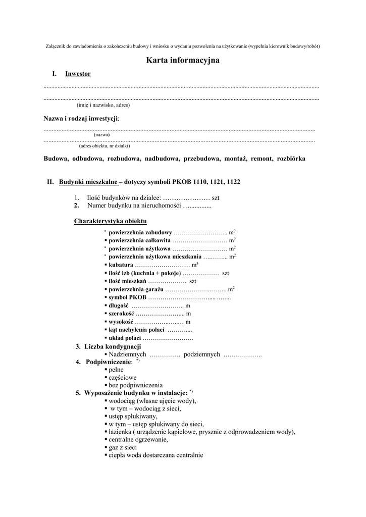 Załącznik do zawiadomienia o zakończeniu budowy i wniosku o wydaniu pozwolenia na użytkowanie (wypełnia kierownik budowy/robót) Karta informacyjna I. Inwestor …………………………………………………….…………………………..………………………………………………………………………… ……………………….…………………………………………………….……………………………………………………………………………. (imię i nazwisko, adres) Nazwa i rodzaj inwestycji: …………………………………………………………………………………………………………………………………………………. (nazwa) …………………………………………………….…………………………………………………………………………………………… (adres obiektu, nr działki) Budowa, odbudowa, rozbudowa, nadbudowa, przebudowa, montaż, remont, rozbiórka II. Budynki mieszkalne – dotyczy symboli PKOB 1110, 1121, 1122 1. 2. Ilość budynków na działce: ………………… szt Numer budynku na nieruchomośći …............. Charakterystyka obiektu powierzchnia zabudowy ………………….….. m2 powierzchnia całkowita ……………………… m2 powierzchnia użytkowa ……………………… m2 powierzchnia użytkowa mieszkania ….……... m2 kubatura ……………………… m3 ilość izb (kuchnia + pokoje) ……………… szt ilość mieszkań ………………. szt powierzchnia garażu …………………..…….. m2 symbol PKOB ………………………….... ..…... długość …………………….. m szerokość ………………….... m wysokość ……………..…..… m kąt nachylenia połaci ……….... układ połaci ……………………. 3. Liczba kondygnacji Nadziemnych …………… podziemnych ………………. 4. Podpiwniczenie: *) pełne częściowe bez podpiwniczenia 5. Wyposażenie budynku w instalacje: *) wodociąg (własne ujęcie wody), w tym – wodociąg z sieci, ustęp spłukiwany, w tym – ustęp spłukiwany do sieci, łazienka ( urządzenie kąpielowe, prysznic z odprowadzeniem wody), centralne ogrzewanie, gaz z sieci ciepła woda dostarczana centralnie 6. Sposób ogrzewania budynku * z sieci cieplnej gazowe olejowe elektryczne nowoczesne na paliwo stałe z automatycznym podawaniem paliwa z wykorzystaniem biomasy tradycyjne węglowe alternatywne lub odnawialne źródło ciepła, np. kolektor słoneczny, pompa ciepła lub inne (podać jakie) ………………………………………………………………………………. 7. Technologia wznoszenia: *) tradycyjna udoskonalona wielopłytowa wielkoblokowa monolityczna szkieletowo – drewniana inna 8. Lokale wbudowane, niemieszkalne w budynkach mieszkalnych jednorodzinnych Jakie ……………………. Powierzchnia użytkowa ……………… m2 9. Ilość mieszkań wg liczby izb (dotyczy budynków wielorodzinnych) jednoizbowe …………………………………………… dwuizbowe …………………………………………….. trzyizbowe ……………………………………………... czteroizbowe …………………………………………... pięcioizbowe …………………………………………... sześcioizbowe i więcej ………………………………… 10. Formy budownictwa: *) indywidualne zrealizowane z przeznaczeniem innym niż sprzedaż i wynajem indywidualne zrealizowane z przeznaczeniem na sprzedaż i wynajem społeczne przeznaczeniem na sprzedaż i wynajem (nie dotyczy indywidualnych) komunalne społeczno-czynszowe zakładowe III. Budynki inne - Główne przeznaczenie budynku - Dotyczy symboli PKOB od 1130 do 1274 Charakterystyka obiektu powierzchnia zabudowy………………………………. m2 powierzchnia użytkowa……………………………….. m2 kubatura……………………………………………….. m3 liczba kondygnacji nadziemnych……………………… pojemność…………………………………………........ m3 (zbiorniki) liczna miejsc noclegowych……………………………… długość…………………………………………………… m szerokość…………………………………………………. m wysokość…………………………………………………..m układ połaci………………………………………………… kąt nachylenia połaci……………………………………….. technologia wznoszenia…………………………………….. sposób ogrzewania budynku………………………………. IV. Obiekty inżynierii lądowej i wodnej Budowle - Dotyczy symboli PKOB 2151, 2152, 2153, 2222, 2223, 2301, 2302, 2303, 2304 , 2420 kubatura ………………….. m3 pojemność ……………….. m3 długość ................................ m szerokość ..…...…...…........ m wysokość ……..…..…........ m powierzchnia zbudowy………….…….m2 - Technologia budowy …………………. Drogi kołowe - Dotyczy symboli PKOB 2111, 2112, 2130 klasa drogi …………………… długość ………………………. m szerokość …………………….. m światło (skrajnia) …………..... m - Rodzaje nawierzchni dróg ……………………… Obiekty mostowe- Dotyczy symboli PKOB 2141, 2142 klasa drogi ……………………. długość ……………………….. m szerokość …………………….. m światło (skrajnia) …………….. m Rodzaje konstrukcji obiektu mostowego ……………………… Rurociągi, przewody, linie i sieci- Dotyczy symboli PKOB 2211, 2212, 2213, 2214 2221, 2222, 2223, 2224 2301 długość …………………….. m średnica …………………… mm napięcie ………………… .... kV Obiekty budowlane nie wymienione w pkt. II – IV - Np. symbol PKO