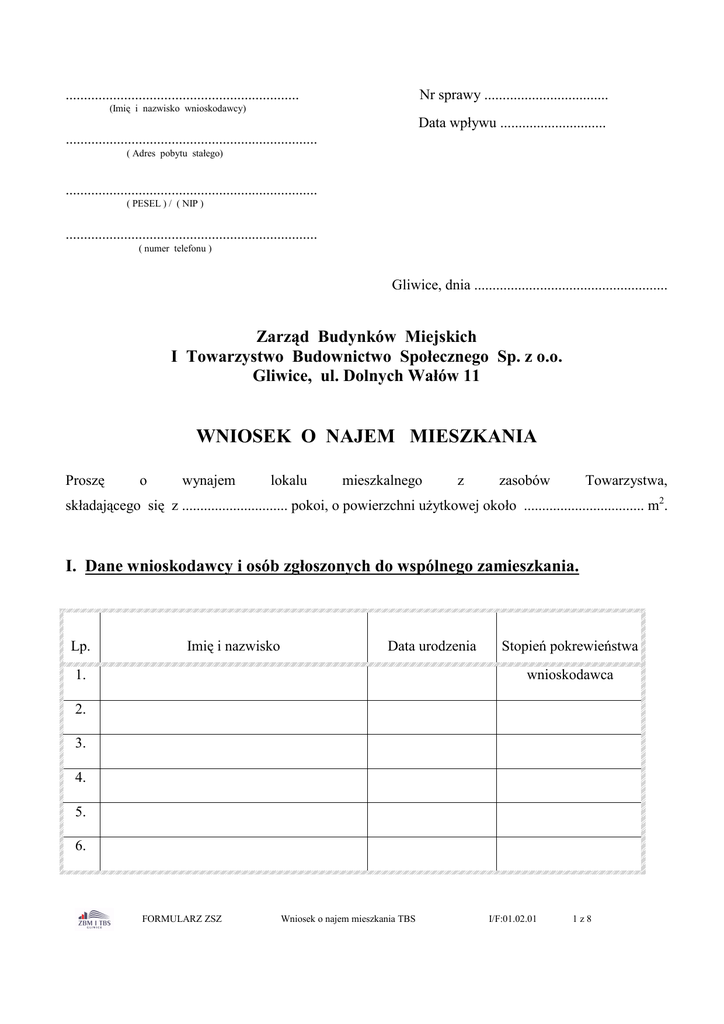 ................................................................ Nr sprawy .................................. (Imię i nazwisko wnioskodawcy) Data wpływu ............................. ..................................................................... ( Adres pobytu stałego) ..................................................................... ( PESEL ) / ( NIP ) ..................................................................... ( numer telefonu ) Gliwice, dnia ..................................................... Zarząd Budynków Miejskich I Towarzystwo Budownictwo Społecznego Sp. z o.o. Gliwice, ul. Dolnych Wałów 11 WNIOSEK O NAJEM MIESZKANIA Proszę o wynajem lokalu mieszkalnego z zasobów Towarzystwa, składającego się z ............................. pokoi, o powierzchni użytkowej około ................................. m2. I. Dane wnioskodawcy i osób zgłoszonych do wspólnego zamieszkania. Lp. Imię i nazwisko Data urodzenia 1. Stopień pokrewieństwa wnioskodawca 2. 3. 4. 5. 6. FORMULARZ ZSZ Wniosek o najem mieszkania TBS I/F:01.02.01 1z8 II. Dane dotyczące miejsca pobytu stałego wnioskodawcy 1. Zajmowane mieszkanie jest lokalem: kwaterunkowym, zakładowym, spółdzielczym, inne:....................................................................................................................................................... 2. Najemcą / Właścicielem jest: .................................................................................................... stopień pokrewieństwa względem wnioskodawcy .......................................................................... 3. W obecnie zajmowanym mieszkaniu razem z wnioskodawcą mieszkają następujące osoby: (stopień pokrewieństwa względem wnioskodawcy) Lp. Imię i nazwisko Data urodzenia Stopień pokrewieństwa Data zameldowania 1. 2. 3. 4. 5. 6. 4. Mieszkanie składa się z ............... pokoi o powierzchni mieszkalnej ........................ m2, oraz o powierzchni użytkowej ................... m2 5. Na jedną osobę przypada ...................... m2 powierzchni mieszkalnej. 6. Za zajmowane mieszkanie opłaty miesięczne wynoszą około .................... zł. z czego czynsz .......................... zł. 7. Wysokość zaległości w opłatach mieszkaniowych wynosi ......................................................... zł. za okres ............................................................................................................................................. Dane w pkt. II. 1-7 potwierdza właściciel lub zarządca budynku. .................................................................... data, podpis, pieczęć FORMULARZ ZSZ Wniosek o najem mieszkania TBS I/F:01.02.01 2z8 III. Dodatkowe uzasadnienie wniosku: ............................................................................................................................................. ............................................................................................................................................. ............................................................................................................................................. ............................................................................................................................................. ............................................................................................................................................. ............................................................................................................................................. ............................................................................................................................................. ............................................................................................................................................. ................................. (uzasadnienie potwierdzić zaświadczeniami stosownych instytucji) ................................................................... numer dowodu osobistego .............................................................. podpis wnioskodawcy Oświadczam, że znane mi są przepisy Ustawy z dnia 26.10.1995 r. o niektórych formach popierania budownictwa mieszkaniowego (Dziennik Ustaw Nr 133 poz. 654 z późniejszymi zmianami) oraz regulaminu wynajmowania mieszkań w zasobach Zarządu Budynków Miejskich I Towarzystwo Budownictwa Społecznego Sp z o.o. w Gliwicach. Do wniosku należy dołączyć: 1. Deklarację o wysokości dochodów (członków z zaświadczeniami potwierdzającymi ich wysokości. gospodarstwa domowego) wraz 2. Oświadczenie o braku tytułu prawnego o innego lokalu mieszkalnego wnioskodawcy i osób zgłoszonych do wspólnego zamieszkania. 3. Zaświadczenie o zameldowaniu z Urzędu Gminy. Uwaga: Kolejność złożenia wniosku nie jest kryterium do przyznania mieszkania do wynajęcia. .................................................................................. (data i podpis przyjmującego) FORMULARZ ZSZ Wniosek o najem mieszkania TBS I/F:01.02.01 3z8 Opinia i uwagi Komisji Mieszkaniowej: ............................................................................................................................................. ............................................................................................................................................. ............................................................................................................................................. ........................................................................................................................................... ............................................................................................................................................. ........................................................................................................................