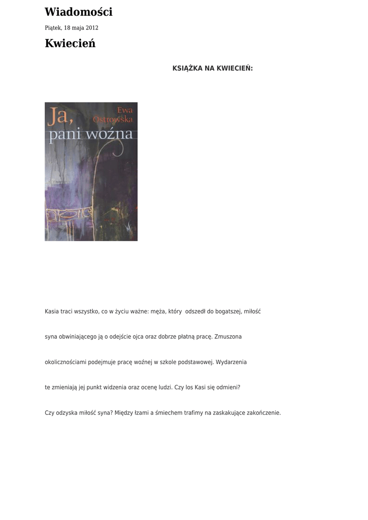 Wiadomości Piątek, 18 maja 2012 Kwiecień KSIĄŻKA NA KWIECIEŃ: Kasia traci wszystko, co w życiu ważne: męża, który odszedł do bogatszej, miłość syna obwiniającego ją o odejście ojca oraz dobrze płatną pracę. Zmuszona okolicznościami podejmuje pracę woźnej w szkole podstawowej. Wydarzenia te zmieniają jej punkt widzenia oraz ocenę ludzi. Czy los Kasi się odmieni? Czy odzyska miłość syna? Między łzami a śmiechem trafimy na zaskakujące zakończenie.