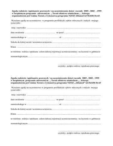 Zgoda rodziców /opiekunów prawnych / na uczestniczenie dzieci rocznik 2005 , 2002 , 1999 w bezpłatnym programie zdrowotnym „ Toruń olśniewa uśmiechem „ , którego organizatorem jest Gmina Toruń a wykonawcą programu NZOZ Alfamed tel 56/658-56-65 Wyrażam zgodę na uczestnictwo w programie profilaktyki zębów mlecznych i stałych mojego syna/córki : imię i nazwisko .................................................................................................................................. data urodzenia …................................................. nr pesel …........................................................... zamieszkałego w ….................................................... ul. …............................................................. Szkoła do której uczeń /uczennica uczęszcza....................................................................................... Klasa …................................................................................................................................................. nr telefonu rodzica /opiekuna celem dalszej rejestracji ucznia/uczennicy na leczenie w gabinecie stomatologicznym................................................................................................................................. …...................................................................... czytelny podpis rodzica /opiekuna prawnego Zgoda rodziców /opiekunów prawnych / na uczestniczenie dzieci rocznik 2005 , 2002 , 1999 w bezpłatnym programie zdrowotnym „ Toruń olśniewa uśmiechem „ , którego organizatorem jest Gmina Toruń a wykonawcą programu NZOZ „Alfamed” tel.56/658-56-65 Wyrażam zgodę na uczestnictwo w programie profilaktyki zębów mlecznych i stałych mojego syna/córki : imię i nazwisko .................................................................................................................................. data urodzenia …................................................. nr pesel …........................................................... zamieszkałego w ….................................................... ul. …............................................................. Szkoła do której uczeń /uczennica uczęszcza....................................................................................... Klasa …................................................................................................................................................. nr telefonu rodzica /opiekuna celem dalszej rejestracji ucznia/uczennicy na leczenie w gabinecie stomatologicznym................................................................................................................................. …...................................................................... czytelny podpis rodzica /opiekuna prawnego Profilaktyka wtórna - wykaz procedur możliwych do wykonania w ramach programu Dzieci i młodzież 11,14,17 -letnie / roczniki 2005, 2002, 1999 / – – – – – – – – kontrolne badanie stomatologiczne,ocena poziomu higieny,stanu przyzębia zgryzu, indywidualny instruktaż w zakresie higieny jamy ustnej i zasad prawidłowego odżywiania przekazywanie na piśmie informacji dla rodziców o stanie uzębienia , lakowanie pierwszych zębów trzonowych stałych u dzieci u których ten zabieg nie został wykonany w ramach refundacji NFZ przed ukończeniem 7 r .ż /w tym lakowanie poszerzone i lakowanie uzupełniające w przypadku częściowej lub całkowitej utraty laku /, lakowanie zębów przedtrzonowych , lakowanie drugich zębów trzonowych stałych u dzieci / w tym lakowanie poszerzone / , opracowanie ubytku i założenie wypełnienia stałego po wyleczeniu próchnicy ujawnionej w trakcie przygotowania zębów do lakowania poszerzonego – próchnica średnia / w odniesieniu do zębów pierwszych trzonowych i zębów przedtrzonowych / -leczenie jednoetapowe /jedna wizyta/ usuwanie płytki bakteryjnej według potrzeb w obrębie całej jamy ustnej , Profilaktyka wtórna Dzieci i młodzież 11,14,17 -letnie /roczniki 2005, 2002, 1999 / – – – – – – – – kontrolne badanie stomatologiczne,ocena poziomu higieny,stanu przyzębia zgryzu, indywidualny instruktaż w zakresie higieny jamy ustnej i zasad prawidłowego odżywiania przekazywanie na piśmie informacji dla rodziców o stanie uzębienia , lakowanie pierwszych zębów trzonowych stałych u dzieci u których ten zabieg nie został wykonany w ramach refundacji NFZ przed ukończeniem 7 r .ż /w tym lakowanie poszerzone i lakowanie uzupełniające w przypadku częściowej lub całkowitej utraty laku /, lakowanie zębów przedtrzonowych , lakowanie drugich zębów trzonowych stałych u dzieci / w tym lakowanie poszerzone / , opracowanie ubytku i założenie wypełnienia stałego po wyleczeniu próchnicy ujawnionej w trakcie przygotowania zębów do lakowania poszerzonego – próchnica średnia / w odniesieniu do zębów pierwszych trzonowych i zębów przedtrzonowych / -leczenie jednoetapowe /jedna wizyta/ usuwanie płytki bakteryjnej według potrzeb w obrębie całej jamy ustnej ,