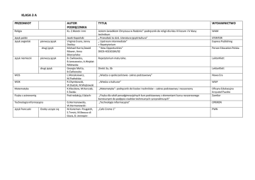 KLASA 3 A PRZEDMIOT AUTOR PODRĘCZNIKA TYTUŁ WYDAWNICTWO Religia Ks. Z.Marek i inni Jestem świadkiem Chrystusa w Rodzinie”-podręcznik do religii dla klas III liceum i IV klasy technikum „ Przeszłośd to dziś. Literatura-język-kultura” „ Upstream intermediate” + Repetytorium “ New Opportunities” DKOS-40150184/02 WAM Repetytorium maturalne. LektorKlett Direkt 3a, 3b LektorKlett „Wiedza o społeczeostwie- zakres podstawowy” Nowa Era „Wiedza o kulturze” WSiP „Matematyka”- podręcznik do liceów i techników – zakres podstawowy i rozszerzony Oficyna Edukacyjna Krzysztof Pazdro ZamKor Język polski Język angielski pierwszy język drugi język Język niemiecki pierwszy język drugi język WOS WOK Matematyka Fizyka z astronomią Technologia informacyjna Język francuski Osoby uczące się Jacek Kopcioski Virginia Evans, Jenny DooleyMichael Harris,Dawid Mower, Anna SikorzyoskaB. Dwikowska, B.Jaroszewicz, A.WojdatNiklewska Georgio Motta, B.Dwikowska L.Moryksiewicz, M.PacholskaR.Chymkowski, W.Dudzik, M.Wojtowski K.Kłaczkow, M.Kurczab, E.ŚwidaPod redakcją J.SalachG.Hermanowska, W.HermanowskiM.Kaneman- Pougatch, S.Trevisi, M.Beacco di Giura, D. Jennepin- „Fizyka dla szkół ponadgimnazjalnych kurs podstawowy z elementami kursu rozszerzonego koniecznymi do podjęcia studiów technicznych i przyrodniczych” „Technologia informacyjna” „Cafe Creme 1” STENTOR Express Publishing Person Education Polska OPERON PWN KLASA 3 B PRZEDMIOT AUTOR PODRĘCZNIKA TYTUŁ WYDAWNICTWO Religia Ks. Z.Marek i inni Jestem świadkiem Chrystusa w Rodzinie”-podręcznik do religii dla klas III liceum i IV klasy technikum „ Przeszłośd to dziś. Literatura-język-kultura” „ Upstream intermediate” WAM “ New Opportunities” DKOS-40150184/02 Person Education Polska Repetytorium maturalne. LektorKlett Direkt 3a,3b LektorKlett „Wiedza o społeczeostwie- zakres podstawowy” Nowa Era „Wiedza o kulturze” WSiP „Matematyka”- podręcznik do liceów i techników – zakres podstawowy i rozszerzony „Geografia fizyczna- zakres rozszerzony” „ Geografia społeczno- ekonomiczna” Oficyna Edukacyjna Krzysztof Pazdro PWN PWN „Cafe Creme 1” PWN Język polski Język angielski pierwszy język drugi język Język niemiecki pierwszy język drugi język WOS WOK Matematyka Geografia Język francuski Osoby uczące się Jacek Kopcioski Virginia Evans, Jenny DooleyMichael Harris,Dawid Mower, Anna SikorzyoskaBeata Dwikowska, Beata Jaroszewicz, Anna Wojdat-Niklewska Georgio Motta, B.Dwikowska L.Moryksiewicz, M.PacholskaR.Chymkowski, W.Dudzik, M.Wojtowski K.Kłaczkow, M.Kurczab, E.ŚwidaP.Czubla, E. Papieska J.Kop, M.Kucharska, E.Szkarłat M.Kaneman- Pougatch, S.Trevisi, M.Beacco di Giura, D. Jennepin- STENTOR Express Publishing KLASA 3 C PRZEDMIOT AUTOR PODRĘCZNIKA TYTUŁ WYDAWNICTWO Religia Ks. Z.Marek i inni Jestem świadkiem Chrystusa w Rodzinie”-podręcznik do religii dla klas III liceum i IV klasy technikum „ Przeszłośd to dziś. Literatura-język-kultura” „ Upstream intermediate” “ New Opportunities” DKOS-40150184/02 Repetytorium maturalne. WAM Direkt 3a, 3b „Wiedza o kulturze” LektorKlett WSiP “ Matematyka”- Podręcznik dla liceum i technikum. Poznad zrozumied- zakres podstawowy i rozszerzony „Fizyka dla szkół ponadgimnazjalnych kurs podstawowy z elementami kursu rozszerzonego koniecznymi do podjęcia studiów technicznych i przyrodniczych” „Chemia cz.1,2,3” „Biologia 3” WSiP „Cafe Creme 1” PWN Język polski Język angielski Matematyka Jacek Kopcioski Virginia Evans, Jenny DooleyMichael Harris,Dawid Mower, Anna SikorzyoskaBeata Dwikowska, Beata Jaroszewicz, Anna WojdatNiklewska Georgio Motta, B.Dwikowska R.Chymkowski, W.Dudzik, M.Wojtowski A.Przychoda, Zygmunt Łaszczyk- Fizyka z astronomią Pod redakcją J.Salach- Chemia Biologia Z.Kluz,M.PóźniczekJ.Balerstet,E.Bartnik,E.Holak, W.Lewioski M.Kaneman- Pougatch, S.Trevisi, M.Beacco di Giura, D. Jennepin- Język niemiecki pierwszy język drugi język pierwszy język drugi język WOK Język francuski Osoby uczące się STENTOR Express Publishing Person Education Polska LektorKlett ZamKor ZamKor OPERON KLASA 3 D PRZEDMIOT AUTOR PODRĘCZNIKA TYTUŁ WYDAWNICTWO Religia Ks. Z.Marek i inni WAM Język polski Jacek Kopcioski Jestem świadkiem Chrystusa w Rodzinie”-podręcznik do religii dla klas III liceum i IV klasy technikum „ Przeszłośd to dziś. Literatura-język-kultura” Virginia Evans, Jenny DooleyMichael Harris,Dawid Mower, Anna SikorzyoskaBeata Dwikowska, Beata Jaroszewicz, Anna Wojdat-Niklewska Georgio Motta, B.Dwikowska M.Kaneman- Pougatch, S.Trevisi, M.Beacco di Giura, D. Jennepin- „ Upstream intermediate” Express Publishing “ New Opportunities” DKOS-40150184/02 Person Education Polska . Repetytorium maturalne. Pearson Longmann Direkt 3a, 3b LektorKlett „Cafe Creme 1” PWN R.Śniegocki A.Przychoda, Zygmunt ŁaszczykL.Moryksiewicz M.PacholskaR.Chymkowski, W.Dudzik, M.Wojtowski „Historia. Burzliwy wiek XX” “ Matematyka”- Podręcznik dla liceum i technikum. Poznad zrozumied- zakres podstawowy i rozszerzony „Wiedza o społeczeostwie- zakres rozszerzony” Nowa Era WSiP „Wiedza o kulturze” WSiP Język angielski pierwszy język drugi język Język niemiecki pierwszy język drugi język Język francuski Historia Matematyka WOS WOK STENTOR Nowa Era KLASA 3 E PRZEDMIOT AUTOR PODRĘCZNIKA TYTUŁ WYDAWNICTWO Religia Ks. Z.Marek i inni Jestem świadkiem Chrystusa w Rodzinie”-podręcznik do religii dla klas III liceum i IV klasy technikum „ Przeszłośd to dziś. Literatura-język-kultura” Repetytorium maturalne „Express publishing” WAM Direkt 3a, 3b LektorKlett „Wiedza o społeczeostwie- zakres podstawowy” Nowa Era „Wiedza o kulturze” WSiP „Matematyka”- podręcznik do liceów i techników – zakres podstawowy i rozszerzony Oficyna Edukacyjna Krzysztof Pazdro PWN Język polski Język angielski poziom rozszerzony Język niemiecki drug