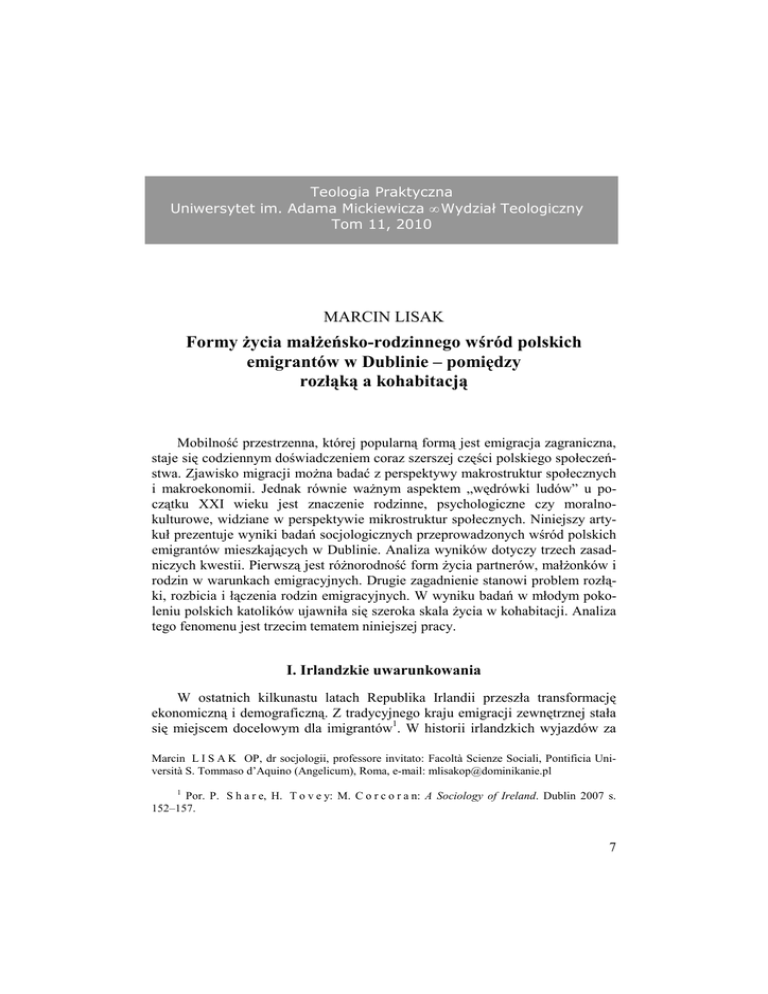 Teologia Praktyczna Uniwersytet im. Adama Mickiewicza • Wydział Teologiczny Tom 11, 2010 MARCIN LISAK Formy Ŝycia małŜeńsko-rodzinnego wśród polskich emigrantów w Dublinie – pomiędzy rozłąką a kohabitacją Mobilność przestrzenna, której popularną formą jest emigracja zagraniczna, staje się codziennym doświadczeniem coraz szerszej części polskiego społeczeństwa. Zjawisko migracji moŜna badać z perspektywy makrostruktur społecznych i makroekonomii. Jednak równie waŜnym aspektem „wędrówki ludów” u początku XXI wieku jest znaczenie rodzinne, psychologiczne czy moralnokulturowe, widziane w perspektywie mikrostruktur społecznych. Niniejszy artykuł prezentuje wyniki badań socjologicznych przeprowadzonych wśród polskich emigrantów mieszkających w Dublinie. Analiza wyników dotyczy trzech zasadniczych kwestii. Pierwszą jest róŜnorodność form Ŝycia partnerów, małŜonków i rodzin w warunkach emigracyjnych. Drugie zagadnienie stanowi problem rozłąki, rozbicia i łączenia rodzin emigracyjnych. W wyniku badań w młodym pokoleniu polskich katolików ujawniła się szeroka skala Ŝycia w kohabitacji. Analiza tego fenomenu jest trzecim tematem niniejszej pracy. I. Irlandzkie uwarunkowania W ostatnich kilkunastu latach Republika Irlandii przeszła transformację ekonomiczną i demograficzną. Z tradycyjnego kraju emigracji zewnętrznej stała się miejscem docelowym dla imigrantów1. W historii irlandzkich wyjazdów za Marcin L I S A K OP, dr socjologii, professore invitato: Facoltà Scienze Sociali, Pontificia Università S. Tommaso d’Aquino (Angelicum), Roma, e-mail: [email protected] 1 Por. P. S h a r e, H. T o v e y: M. C o r c o r a n: A Sociology of Ireland. Dublin 2007 s. 152–157. 7 chlebem czynnikiem wypychającym (push factor) była przede wszystkim ekonomia. Po gospodarczym skoku celtyckiego tygrysa na przełomie XX i XXI w., czynnik ekonomiczny stał się motorem przyciągającym (pull factor) migrantów2. W dobie kryzysu ekonomicznego, który począwszy od 2008 r. mocno dotknął gospodarkę Irlandii, ponownie odwrócił się kierunek strumienia migracyjnego3. Szacunkowe dane demograficzne wskazują, Ŝe od 2009 r. mamy do czynienia z ujemnym bilansem migracyjnym4. Znowu więcej osób emigruje z Irlandii niŜ do niej imigruje5. Jedną z najbardziej licznych grup etnicznych wśród imigrantów są Polacy. W porównaniu z kulminacją fali emigracji do Irlandii w latach 2006–2007, w ostatnich dwóch latach napływ migrantów z Polski zdecydowanie się zatrzymał6. Nie oznacza to jednak, Ŝe migranci masowo wrócili do macierzystego kraju albo przenieśli się z Irlandii w inne miejsce. Brakuje danych empirycznych, które potwierdzałyby obiegowe opinie na temat exodusu większości imigrantów. Wręcz przeciwnie, wyniki kilku fokusowych badań wskazują, Ŝe wielu imigrantów pozostaje na wyspie, kierując się strategią przeczekania kryzysu ekonomicznego7 oraz strategią „zamierzonej nieprzewidywalności”8. O kierunku i strategii migracji decydują w przypadku poakcesyjnych przepływów ludności w Europie 2 Por. M. P h a d r a i g, B. H i l l i a r: Socio-economic Change in Ireland since the 1980s: The Tiger, the Transnational Corporations and the Peace Dividend. W: B. H i l l i a r d, M. P h a d r a i g (red.): Changing Ireland in International Comparison. Dublin 2007 s. 1–22; A. B a r r e n, A. B e r g i n: The economic contribution of immigrants in Ireland. W: B. F a n n i n g (red.): Immigration and social change in the Republic of Ireland. Manchester 2007 s. 63–83. 3 Por. A. B a r r e t t, I. K e a r n e y, J. G o g g i n: Quarterly Economic Commentary: Spring 2009. Economic and Social Research Institute: Dublin 2009. 4 Por. E. R u h s, E. Q u i n n: Ireland: from Rapid Immigration to Recession. Centre on Migration, Policy and Society (COMPAS) Oxford University, Economic and Social Research Institute, Dublin, wrzesień 2009 [dostępny w: http://www.migrationinformation.org/Feature/display.cf m?ID=740 (30.10.2010)]. 5 W roku 2009 saldo migracyjne (ujemne) szacowane jest na – 7,8 tys., a w 2010 na – 34,5 tys. Tymczasem w latach 1996–2008 nieprzerwanie było ono dodatnie – por. Central Statistics Office Ireland: Population and Migration Estimates April 2010. Dublin–Cork 21.09.2010 s. 1–2. 6 Od stycznia 2000 r. do września 2010 w Irlandii zarejestrowało się (otrzymało numer socjalno-podatkowy) 338.285 polskich obywateli. Przy czym aŜ 82,4% procent spośród nich uczyniło to w ciągu 4 lat w okresie maj 2004–kwiecień 2008. W roku 2010 liczba rejestracji Polaków znacznie spadła. Ale i tak w pierwszych 9 miesiącach roku uczyniło to blisko 7 tys. osób, co stanowi najwyŜszą wartość wśród imigracyjnych nacji. Dane zostały opracowane na podstawie wykazów statystycznych irlandzkiego ministerstwa do spraw społecznych [dostępne w: http://www.welfare.ie/EN/Topics/PPSN/Pages/ppsstat.aspx (30.10.2010)]. 7 Por. T. K r i n g s, A. B o b e k, E. M o r i a r t y, J. S a l a m o n s k a, J. W i c k h a m: Migration and Recession: Polish Migrants in Post-Celtic Tiger Ireland. „Sociological Research Online”. R. 2009 nr 14(2/3). 8 Por. S. D r i n k w a t e r, J. E a d e , M. G a r a p i c h: Class and Ethnicity: Polish Migrants in London. Economic and Social Research Council End of Award. Raport z badań. Surrey 2007. 8 dalej głównie czynniki ekonomiczne. Jednak w niniejszym artykule zajmuję się migracją w wymiarze mikrostruktur społecznych, poddając analizie formy Ŝycia partnerskiego, małŜeńskiego i rodzinnego polskich emigrantów. II. Metoda badawcza W coraz szerszym zakresie mamy dziś do czynienia z masowym, szybkim i właściwie niekontrolowanym przepływem ludności i informacji, co powoduje, Ŝe demografowie są bezsilni wobec zagadnienia oszacowania rozmiarów i liczebności migrantów. Z socjologicznego punktu widzenia kohorta imigrantów w kraju, w którym nie ma ścisłej kontrol