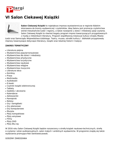 VI Salon Ciekawej Książki Salon Ciekawej Książki to największa impreza wystawiennicza w regionie łódzkim skierowana do branży wydawniczej i czytelników. Ideą Salonu jest promocja czytelnictwa wśród mieszkańców Łodzi i regionu, a także rozwijanie u dzieci i młodzieży pasji czytania. Salon Ciekawej Książki to również bogaty program imprez towarzyszących przygotowanych z myślą o miłośnikach literatury. Program współtworzą instytucje kultury Urzędu Miasta Łodzi oraz Samorządu Województwa Łódzkiego. Teatry, muzea, ośrodki kultury i biblioteki przygotowały imprezy towarzyszące dotyczące literatury, książki oraz lokalnej historii i tradycji. ZAKRES TEMATYCZNY ● ● ● ● ● ● ● ● ● ● ● ● ● ● ● ● ● ● ● ● ● ● ● ● ● ● ● ● ● ● Literatura piękna Wydawnictwa popularnonaukowe Wydawnictwa dla dzieci i młodzieży Wydawnictwa artystyczne Wydawnictwa turystyczne Wydawnictwa naukowe Wydawnictwa religijne Wydawnictwa muzyczne Literatura obca Komiksy Prasa Multimedia Audiobooki E-booki Czytniki książki elektronicznej Tablety Gadżety i akcesoria Kalendarze Adresowniki Pamiętniki Notesy Gry i łamigłówki Gry planszowe Gry komputerowe Muzyka Płyty kompaktowe Płyty winylowe Filmy Płyty DVD Płyty Blu-ray W 2016 roku Salon Ciekawej Książki będzie rozszerzony o strefę książek naukowo-technicznych, strefę e-czytania i sztuk audiowizualnych, salon małych i ambitnych wydawnictw. W programie znajdą się także wydarzenia promujące Rok Sienkiewiczowski. GODZINY ZWIEDZANIA ● ● ● 18.11.2016 - od 10:00 do 18:00 19.11.2016 - od 10:00 do 18:00 20.11.2016 - od 10:00 do 17:00 Miejsce targów Łódź Skorupki 21 Organizator Międzynarodowe Targi Łódzkie Łódź Skorupki 211 42 636 29 83 www.targi.lodz.pl [email protected]