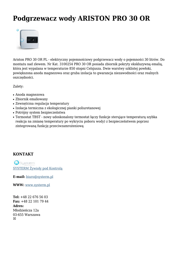 Podgrzewacz wody ARISTON PRO 30 OR Ariston PRO 30 OR PL - elektryczny pojemnościowy podgrzewacz wody o pojemności 30 litrów. Do montażu nad zlewem. Nr Kat. 3100254 PRO 30 OR posiada zbiornik pokryty ekskluzywną emalią, która jest wypalana w temperaturze 850 stopni Celsjusza. Dwie warstwy szklistej powłoki, powiększona anoda magnezowa oraz gruba izolacja to gwarancja niezawodności oraz realnych oszczędności. Zalety: ● ● ● ● ● ● Anoda magnezowa Zbiornik emaliowany Zewnętrzna regulacja temperatury Izolacja termiczna z ekologicznej pianki poliuretanowej Potrójny system bezpieczeństwa Termostat TBST - nowy udoskonalony termostat łączy funkcje sterujące temperaturą szybka reakcja na zmianę temperatury po wykryciu poboru wody) z bezpieczeństwem poprzez zintegrowaną funkcję przeciwzamrożeniową KONTAKT SYSTERM Żywioły pod Kontrolą E-mail: [email protected] WWW: www.systerm.pl Tel: +48 22 676 56 03 Fax: +48 22 101 79 44 Adres: Młodzieńcza 12a 03-655 Warszawa
