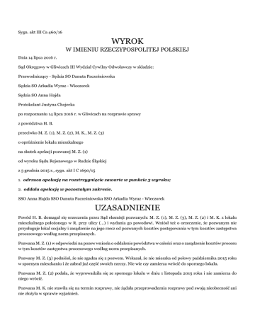 Sygn. akt III Ca 460/16 WYROK W IMIENIU RZECZYPOSPOLITEJ POLSKIEJ Dnia 14 lipca 2016 r. Sąd Okręgowy w Gliwicach III Wydział Cywilny Odwoławczy w składzie: Przewodniczący - Sędzia SO Danuta Pacześniowska Sędzia SO Arkadia Wyraz - Wieczorek Sędzia SO Anna Hajda Protokolant Justyna Chojecka po rozpoznaniu 14 lipca 2016 r. w Gliwicach na rozprawie sprawy z powództwa H. B. przeciwko M. Z. (1), M. Z. (2), M. K., M. Z. (3) o opróżnienie lokalu mieszkalnego na skutek apelacji pozwanej M. Z. (1) od wyroku Sądu Rejonowego w Rudzie Śląskiej z 3 grudnia 2015 r., sygn. akt I C 1690/15 1. odrzuca apelację na rozstrzygnięcie zawarte w punkcie 3 wyroku; 2. oddala apelację w pozostałym zakresie. SSO Anna Hajda SSO Danuta Pacześniowska SSO Arkadia Wyraz - Wieczorek UZASADNIENIE Powód H. B. domagał się orzeczenia przez Sąd eksmisji pozwanych: M. Z. (1), M. Z. (3), M. Z. (2) i M. K. z lokalu mieszkalnego położonego w R. przy ulicy (...) i wydania go powodowi. Wniósł też o orzeczenie, że pozwanym nie przysługuje lokal socjalny i zasądzenie na jego rzecz od pozwanych kosztów postępowania w tym kosztów zastępstwa procesowego według norm przepisanych. Pozwana M. Z. (1) w odpowiedzi na pozew wniosła o oddalenie powództwa w całości oraz o zasądzenie kosztów procesu w tym kosztów zastępstwa procesowego według norm przepisanych. Pozwany M. Z. (3) podniósł, że nie zgadza się z pozwem. Wskazał, że nie mieszka od połowy października 2015 roku w spornym mieszkaniu i że zabrał już część swoich rzeczy. Nie wie czy zamierza wrócić do spornego lokalu. Pozwana M. Z. (2) podała, że wyprowadziła się ze spornego lokalu w dniu 1 listopada 2015 roku i nie zamierza do niego wrócić. Pozwana M. K. nie stawiła się na termin rozprawy, nie żądała przeprowadzenia rozprawy pod swoją nieobecność ani nie złożyła w sprawie wyjaśnień. Wyrokiem z dnia 3 grudnia 2015 roku sąd Rejonowy w Rudzie Śląskiej w punkcie pierwszym nakazał pozwanym M. Z. (3), M. Z. (1) i M. K. opróżnienie i opuszczenie lokalu mieszkalnego położonego w R. przy ulicy (...) i wydanie go powodowi H. B. w stanie wolnym od osób i rzeczy. Rozstrzygnięciem zawartym w punkcie drugim ustalił Sąd Rejonowy, iż pozwanym nie przysługuje uprawnienie do otrzymania lokalu socjalnego od Gminy R.. W punkcie trzecim wyroku powództwo w stosunku do pozwanej M. Z. (2) zostało oddalone. W punkcie czwartym zasądzono solidarnie od pozwanych M. Z. (3), M. Z. (1) i M. K. na rzecz powoda kwotę 337 złotych tytułem zwrotu kosztów procesu. Podstawą tej treści rozstrzygnięcia były następujące ustalenia faktyczne poczynione przez Sąd Rejonowy. Lokal mieszkalny położony w R. przy ulicy (...) stanowi własność powoda. W dniu 29 maja 2014 roku powód zwarł z pozwaną M. Z. (1) umowę najmu w/w lokalu na czas nieokreślony. Do zamieszkania z najemcą uprawnieni byli pozostali pozwani. Najemca zobowiązany był użytkować lokal z dbałością o jego stan sanitarny i techniczny. Ponadto najemca zobowiązał się płacić wynajmującemu miesięczny czynsz w kwocie 1.000 zł w terminie do dnia 15 każdego miesiąca z góry. Brak wpłaty za najem mieszkania miał skutkować rozwiązaniem umowy najmu (§ 6 umowy). Strony ustaliły, że zaleganie przez najemcę z zapłatą czynszu za dwa kolejne okresy płatności lub używanie przedmiotu najmu w sposób sprzeczny z umową lub przeznaczeniem będzie podstawą do wypowiedzenia umowy w trybie natychmiastowym, bez zachowania terminu wypowiedzenia (§ 8 umowy). Poza tym najemca zobowiązał się do pokrycia kosztów eksploatacji mieszkania w tym m.in. opłat za wywóz śmieci oraz połowy opłat za wodę. Stan techniczny budynku był znany pozwanym przed podpisaniem umowy. Od lipca do połowy sierpnia pozwani byli jedynymi osobami zamieszkującymi budynek. Pozwani niewłaściwie korzystali z urządzeń sanitarnych tj. wrzucali do kanalizacji włókniste chusteczki, tampony higieniczne oraz patyczki do uszu, powodując parokrotne zapchanie kanalizacji. Na skutek zapchania kanalizacji doszło do zalania piwnicy oraz znajdujących się w niej rzeczy fekaliami. W zimie 2014 roku w piwnicy, w której znajdował się piec ogrzewający budynek zalegało kilkanaście centymetrów nieczystości. Pozwani zgłosili awarię powodowi. Powód dokonał naprawy we własnym zakresie oraz za pomocą firmy, zajmującej się udrażnianiem kanalizacji. Po drugiej próbie udrażniania powód zwrócił się do pozwanej o należyte użytkowanie kanalizacji. Pismem z dnia 4 października 2014 roku powód wysłał do pozwanej upomnienie w związku z niewywiązywaniem się najemcy z obowiązków umowy i powtarzającym się działaniem na szkodę wynajmującego.Powód zobowiązał się ustnie, że udostępni pozwanym piwnicę, jednakże dostęp ten był ograniczony przez pozostawione tam przez powoda rzeczy oraz – w późniejszym okresie - zalegające fekalia. W okresie grzewczym, aby palić w piecu pozwany M. Z. (3) musiał schodzić do piwnicy w kaloszach i szaliku, zawiązanym na twarzy. Pozwana zalegała z zapłatą za czynsz i wodę oraz wywóz nieczystości. Zaległości zaczęły narastać we wrześniu 2014 roku. Pismami z dnia 2 października 2014 roku, 24 października 2014 roku oraz 10 grudnia 2014 roku powód wzywał pozwanych do zapłaty oraz poinformował, że brak spłaty spowoduje rozwiązanie umowy najmu i skierowanie sprawy na drogę postępowania sądowego.Pismem z dnia 3 listopada 2014 roku pozwana powiadomiła Stację SanitarnoEpidemiologiczną w R., że powód trzyma śmieci w piwnicy oraz, że na początku września 2014 roku piwnica została zalana fekaliami. Pozwana wskazywała, że w piwnicy stoi cuchnąca woda a nieprzyjemny zapach unosi się na cały budynek wskutek czego doszło do wylęgu robactwa.Pismem z dnia 29 stycznia 2015 roku powód wypowiedział pozwanej M. Z. (1) umowę najmu w związku z zaległościami w spłacie czynszu, zgodnie z treśc