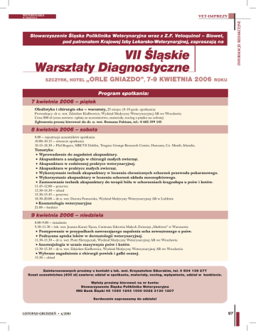 WETERYNARIA INFORMACJE REDAKCYJNE VET-IMPREZY W PRAKTYCE Stowarzyszenie Śląska Poliklinika Weterynaryjna wraz z Z.F. Vetoquinol – Biowet, pod patronatem Krajowej Izby Lekarsko-Weterynaryjnej, zapraszają na VII Śląskie Warsztaty Diagnostyczne SZCZYRK, HOTEL „ORLE GNIAZDO”, 7-9 KWIETNIA 2006 ROKU Program spotkania: 7 kwietnia 2006 – piątek Okulistyka i chirurgia oka – warsztaty, 25 miejsc (8-10 godz. spotkania) Prowadzący: dr n. wet. Zdzisław Kiełbowicz, Wydział Medycyny Weterynaryjnej AR we Wrocławiu Cena 800 zł (cena zawiera: opłatę za uczestnictwo, materiały, nocleg z piątku na sobotę) Zgłoszenia proszę kierować do dr. n. wet. Romana Fabisza, tel.: 0 602 399 145 8 kwietnia 2006 – sobota 8.00 – rejestracja uczestników spotkania 10.00-10.15 – otwarcie spotkania 10.15-18.30 – Phil Rogers, MRCVS Dublin, Teagasc Grange Research Centre, Dunsany, Co. Meath, Irlandia. Tematyka: • Wprowadzenie do zagadnień akupunktury. • Akupunktura a analgezja w chirurgii małych zwierząt. • Akupunktura w codziennej praktyce weterynaryjnej. • Akupunktura w praktyce małych zwierząt. • Wykorzystanie technik akupunktury w leczeniu chronicznych schorzeń przewodu pokarmowego. • Wykorzystanie akupunktury w leczeniu schorzeń układu moczopłciowego. • Zastosowanie technik akupunktury do terapii bólu w schorzeniach kręgosłupa u psów i kotów. 11.45-12.00 – przerwa 13.30-14.30 – obiad 15.30-15.45 – przerwa 18.30-20.00 – dr n. wet. Dorota Pomorska, Wydział Medycyny Weterynaryjnej AR w Lublinie • Kosmetologia weterynaryjna 21.00 – bankiet 9 kwietnia 2006 – niedziela 8.00-9.00 – śniadanie 9.30-11.30 – lek. wet. Joanna Karaś-Tęcza, Centrum Zdrowia Małych Zwierząt „Multiwet” w Warszawie • Postępowanie w przypadkach nawracającego zapalenia ucha zewnętrznego u psów. • Podręczna apteka leków w dermatologii weterynaryjnej. 11.30-13.30 – dr n. wet. Piotr Skrzypczak, Wydział Medycyny Weterynaryjnej AR we Wrocławiu • Anestezjologia w urazie masywnym psów i kotów. 13.30-15.30 – dr n. wet. Zdzisław Kiełbowicz, Wydział Medycyny Weterynaryjnej AR we Wrocławiu • Wybrane zagadnienia z chirurgii powiek i gałki ocznej. 15.30 – obiad Zainteresowanych prosimy o kontakt z lek. wet. Krzysztofem Sikorskim, tel. 0 604 139 277 Koszt uczestnictwa (400 zł) zawiera: udział w spotkaniu, materiały, nocleg, wyżywienie, udział w bankiecie. Wpłaty prosimy kierować na nr konta: Stowarzyszenie Śląska Poliklinika Weterynaryjna ING Bank Śląski 45 1050 1243 1000 0022 3130 1207 Serdecznie zapraszamy do udziału! LISTOPAD-GRUDZIEŃ • 6/2005 97