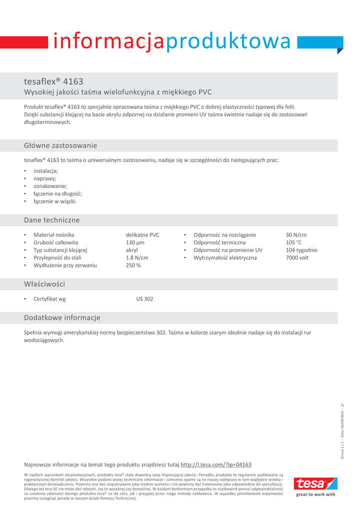 informacjaproduktowa tesaflex® 4163 Wysokiej jakości taśma wielofunkcyjna z miękkiego PVC Produkt tesaflex® 4163 to specjalnie opracowana taśma z miękkiego PVC o dobrej elastyczności typowej dla folii. Dzięki substancji klejącej na bazie akrylu odpornej na działanie promieni UV taśma świetnie nadaje się do zastosowań długoterminowych. Główne zastosowanie tesaflex® 4163 to taśma o uniwersalnym zastosowaniu, nadaje się w szczególności do następujących prac: ▪ ▪ ▪ ▪ ▪ instalacja; naprawy; oznakowanie; łączenie na długość; łączenie w wiązki. Dane techniczne ▪ ▪ ▪ ▪ ▪ Materiał nośnika Grubość całkowita Typ substancji klejącej Przylepność do stali Wydłużenie przy zerwaniu delikatne PVC 130 µm akryl 1.8 N/cm 250 % ▪ ▪ ▪ ▪ Odporność na rozciąganie Odporność termiczna Odporność na promienie UV Wytrzymałość elektryczna 30 N/cm 105 °C 104 tygodnie 7000 volt Właściwości ▪ Certyfikat wg US 302 Dodatkowe informacje Strona 1 z 1 - Data: 05/08/2016 - pl Spełnia wymogi amerykańskiej normy bezpieczeństwa 302. Taśma w kolorze szarym idealnie nadaje się do instalacji rur wodociągowych. Najnowsze informacje na temat tego produktu znajdziesz tutaj http://l.tesa.com/?ip=04163 W ciężkich warunkach eksploatacyjnych, produkty tesa® stale dowodzą swej imponującej jakości. Ponadto, produkty te regularnie poddawane są rygorystycznej kontroli jakości. Wszystkie podane wyżej techniczne informacje i zalecenia oparte są na naszej najlepszej w tym względzie wiedzy i praktycznym doświadczeniu. Powinny one być rozpatrywane jako średnie wartości i nie powinny być traktowane jako odpowiednie do specyfikacji. Dlatego też tesa SE nie może dać rękojmi, czy to wyraźnej czy domyślnej. W każdym konkretnym przypadku to użytkownik ponosi odpowiedzialność za ustalenie zdatności danego produktu tesa® co do celu, jak i przyjętej przez niego metody nakładania. W wypadku jakichkolwiek wątpliwości prosimy zasięgnąć porady w naszym dziale Pomocy Technicznej.
