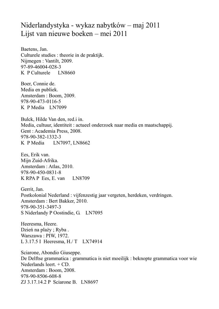 Niderlandystyka - wykaz nabytków – maj 2011 Lijst van nieuwe