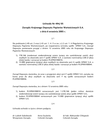 Uchwała Nr 494/ 05 Zarządu Krajowego Depozytu Papierów Wartościowych S.A. z dnia 6 września 2005 r. §1 Na podstawie § 40 ust. 2 oraz § 43 ust. 1, 4 i 5 w zw. z § 2 ust. 1 i 4 Regulaminu Krajowego Depozytu Papierów Wartościowych, po rozpatrzeniu wniosku spółki SPRAY S.A., Zarząd Depozytu postanawia przyjąć z dniem 12 września 2005 roku do Krajowego Depozytu Papierów Wartościowych: 1) 778.166 (siedemset siedemdziesiąt osiem tysięcy sto sześćdziesiąt sześć) akcji zwykłych na okaziciela serii F spółki SPRAY S.A. o wartości nominalnej 2.00 zł (dwa złote) każda i oznaczyć je kodem PLSPRAY00010; 2) 15.000 (piętnaście tysięcy) akcji zwykłych na okaziciela serii G spółki SPRAY S.A. o wartości nominalnej 2.00 zł (dwa złote) każda i oznaczyć je kodem PLSPRAY00044. §2 Zarząd Depozytu stwierdza, że wraz z przyjęciem akcji serii F spółki SPRAY S.A. zamyka się konta praw do akcji zwykłych na okaziciela serii F tej spółki oznaczonych kodem PLSPRAY00036. §3 Zarząd Depozytu stwierdza, że z dniem 12 września 2005 roku: 1) kodem PLSPRAY00010 oznaczonych jest 1.278.166 (jeden milion dwieście siedemdziesiąt osiem tysięcy sto sześćdziesiąt sześć) akcji spółki SPRAY S.A.; 2) kodem PLSPRAY00044 oznaczonych jest 15.000 (piętnaście tysięcy) akcji spółki SPRAY S.A. §4 Uchwała wchodzi w życie z dniem podjęcia. dr Ludwik Sobolewski Wiceprezes Zarządu Anna Szulecka Członek Zarządu dr hab. Aleksander Chłopecki Członek Zarządu