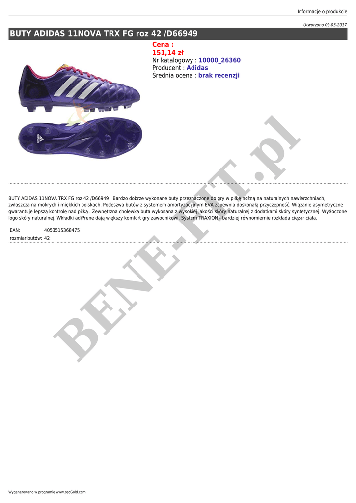 Informacje o produkcie Utworzono 09-03-2017 BUTY ADIDAS 11NOVA TRX FG roz 42 /D66949 Cena : 151,14 zł FI T .p l Nr katalogowy : 10000_26360 Producent : Adidas Średnia ocena : brak recenzji BUTY ADIDAS 11NOVA TRX FG roz 42 /D66949 Bardzo dobrze wykonane buty przeznaczone do gry w piłkę nożną na naturalnych nawierzchniach, zwłaszcza na mokrych i miękkich boiskach. Podeszwa butów z systemem amortyzacyjnym EVA zapewnia doskonałą przyczepność. Wiązanie asymetryczne gwarantuje lepszą kontrolę nad piłką . Zewnętrzna cholewka buta wykonana z wysokiej jakości skóry naturalnej z dodatkami skóry syntetycznej. Wytłoczone logo skóry naturalnej. Wkładki adiPrene dają większy komfort gry zawodnikowi. System TRAXION - bardziej równomiernie rozkłada ciężar ciała. EAN: 4053515368475 B EN E- rozmiar butów: 42 Wygenerowano w programie www.oscGold.com