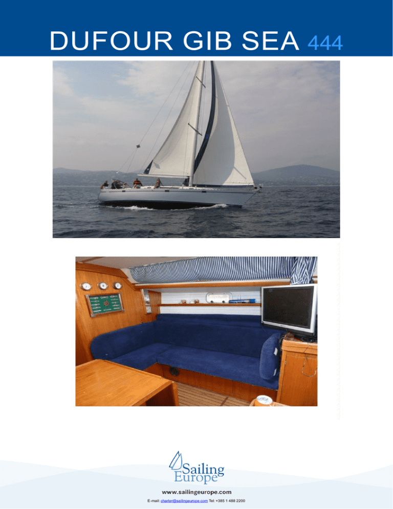 DUFOUR GIB SEA 444 E-mail: [email protected] Tel: +385 1 488 2200 DUFOUR GIB SEA 444 E-mail: [email protected] Tel: +385 1 488 2200 DUFOUR GIB SEA 444 Tehnical data Tutaj znajdziesz podstawowe informacje na temat naszych łodzi typu Dufour Gib Sea 444. Inne specyficzne parametry łodzi, jak typ ŻĄGLI i wyposażenie są zmienne w zależności od typu łodzi. Z tego powodu radzimy szukać konkretnej łodzi Dufour Gib Sea 444 w naszym katalogu, zgodnie z waszymi upodobaniami oraz miejscami, które planujecie odwiedzić. kabin Składane łóżko dodatkowe Długość Szerokość pokładu Zanurzenie Pojemność wodna Pojemność silnika Silnik Toalety 4 8+2 13,90 m 4,05 m 2,20 m 800,00 l 240,00 l 48 HP 2 Szczegóły wyglądu zewnętrznego łodzi, jej wyposażenia wewnątrz i układu kabin mogą w niektórych przypadkach różnić się od szczegółów przedstawionych na fotografiach. E-mail: [email protected] Tel: +385 1 488 2200