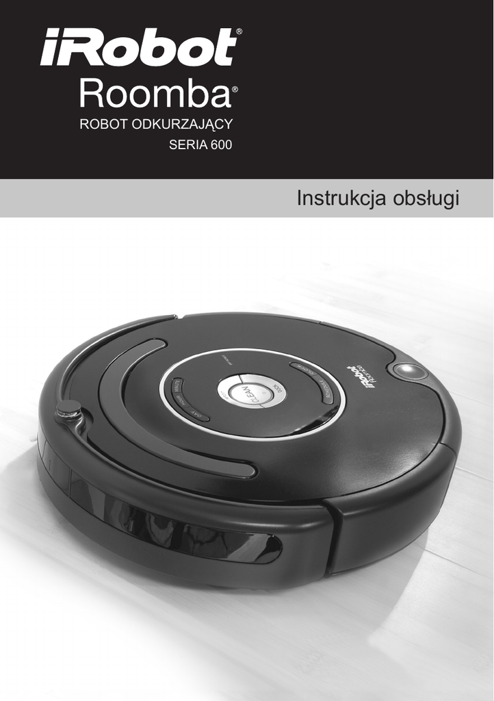 ROBOT ODKURZAJĄCY SERIA 600 Instrukcja obsługi Edycja 201210 © DLF Sp. z o.o. Szanowny posiadaczu iRobota Roomba, Dziękujemy za wybór robota odkurzającego iRobot Roomba. Stając się jego użytkownikiem, dołączyłeś do milionów osób, które do sprzątania używają robotów - inteligentnego sposobu na czystość. Prosimy o poświęcenie kilku chwil na przeczytanie niniejszej instrukcji obsługi oraz zapoznanie się z robotem Roomba, by optymalnie wykorzystywać jego działanie. Jeśli masz jakiekolwiek pytania zapraszamy do odwiedzenia naszej strony internetowej www.irobot.pl w celu uzyskania informacji. Zachęcamy do zarejestrowania swojego robota, by cieszyć się dodatkowymi korzyściami: • Zyskaj więcej dzięki profesjonalnej obsłudze klienta Uzyskaj wsparcie odpowiednie do specyfiki robota, włączając w to odpowiedzi, wskazówki użytkowania, filmy demonstracyjne oraz wiele więcej. • Pobieraj aktualizacje oraz inne cenne informacje Bądź wśród pierwszych, którzy dowiedzą się o nowych robotach, wyjątkowych obniżkach oraz specjalnych promocjach. Po dokonaniu rejestracji możesz także podzielić się z nami swoim doświadczeniem w Twoim robotem Roomba. iRobot z uwagą wysłuchuje swoich klientów i wprowadza ulepszenia w oparciu o ich cenne uwagi. Będziemy wdzięczni za kontakt. W imieniu całego zespołu, dziękując za wybór produktu marki iRobot, Oto robot, który zmieni Twoją rzeczywistość! Mniej obowiązków i więcej życia, Serdecznie pozdrawiam Colin Angle Współtwórca Dyrektor Generalny iRobot Corporation Spis treści Ważne wskazówki przed pierwszym uruchomieniem............. 5 Budowa iRobota Roomba.............................................. 6 Sposób sprzątania...................................................... 7 Metody sprzątania...................................................... 8 System sprzątania...................................................... 9 Obsługa akumulatora................................................. 10 Wirtualna Ściana (Virtual Wall®)..................................... 12 Pierścień Wirtualnej Ściany ......................................... 13 Stacja dokująca (Home Base®)....................................... 14 Pilot..................................................................... 15 Programowanie iRobota Roomba.................................... 16 Czyszczenie i konserwacja........................................... 18 Ustawianie języka komunikatów głosowych....................... 21 Wykrywanie i usuwanie usterek..................................... 22 Moduły wymienne..................................................... 24 Zdejmowanie pokrywy górnej....................................... 25 Wyjmowanie akumulatora............................................ 27 Często zadawane pytania (FAQ)..................................... 29 Ważne instrukcje bezpieczeństwa.................................. 30 Deklaracja zgodności z normami Unii Europejskiej............... 31 4 iRobot Roomba Seria 600 Ważne wskazówki przed pierwszym uruchomieniem Usuń zabezpieczenie akumulatora Zanim użyjesz iRobota Roomba musisz najpierw go uaktywnić. W tym celu odwróć robota i wyjmij wkładkę zabezpieczającą pojemnika akumulatora. Jeśli napotkasz trudność z wyjęciem zabezpieczenia akumulatora poluźnij śruby pokrywy akumulatora. Pociągnij za taśmę zabezpieczającą. Po wyciągnięciu zabezpieczenia, śruby należy dokręcić. Pierwsze uruchomienie iRobota Roomba Przy pierwszym użyciu bez względu na początkowy poziom naładowania akumulatora należy go rozładować poprzez uruchomienie robota w cyklu sprzątania, aż do uzyskania czerwonego podświetlenia kontrolki akumulatora i samoistnego zatrzymania się, o którym Roomba poinformuje emitując odpowiedni dźwięk. Następnie należy rozpocząć ładowanie robota podłączonego bezpośrednio do zasilacza (z pominięciem Stacji dokującej) przez całą noc (minimum 12 godzin). Żywotność akumulatora Aby przedłużyć żywotność akumulatora, iRobot zaleca ciągłe utrzymywanie robota podłączonego do zasilania (ładowarki lub Stacji dokującej) w czasie gdy nie sprząta. Spowoduje to, że iRobot Roomba będzie zawsze gotów do pracy i nie dojdzie do uszkodzenia akumulatora przez jego głębokie rozładowanie. Włączanie i wyłączanie iRobota Roomba • Roomba nie posiada typowego przycisku „ON-OFF” lub „POWER”. • Aby uruchomić robota, naciśnij przycisk CLEAN. Usłyszysz dźwięk informujący o gotowości do pracy, a przycisk CLEAN będzie podświetlony. • Aby rozpocząć cykl sprzątający, naciśnij przycisk CLEAN jeszcze raz. Robot zacznie sprzątać. • Aby przerwać pracę robota, naciśnij przycisk CLEAN. • Aby wznowić pracę robota, naciśnij ponownie przycisk CLEAN. • Aby całkowicie wyłączyć robota, naciśnij przycisk CLEAN i przytrzymaj do czasu aż kontrolki zgasną. Dla lepszej wydajności • Robot sprzątający Roomba jest bardzo skuteczny w zbieraniu włosów. Sprawdzaj stopień zabrudzenia szczotek i czyść je po każdym sprzątaniu. • Opróżniaj pojemnik na brud oraz czyść filtr po każdym sprzątaniu. • Zastosuj wirtualne ściany, aby utrzymać iRobota Roomba w miejscach, w których chcesz, aby sprzątał. • iRobot Roomba osiąga najwyższą wydajność, gdy jest często używany. iRobot Roomba zawiera części elektroniczne. Czyść go wyłącznie suchą tkaniną. Nie polewaj robota wodą ani nie używaj płynów lub rozpylaczy do jego czyszczenia. Chroń iRobota Roomba przed zalaniem. www.irobot.pl 5 Budowa iRobota Roomba Czujnik Wirtualnej Ściany i Stacji dokującej Pokrywa górna Przycisk zwalniania pojemnika na brud Gniazdo ładowarki akumulatora Pojemnik na brud Przyciski i kontrolki (Modele 620 i 630) (Modele 650 i 660) Kontrolka rozwiązywania problemów Przycisk funkcji sprzątania miejscowego (SPOT) Przycisk funkcji sprzątania miejscowego Kontrolka (SPOT) Programowanie