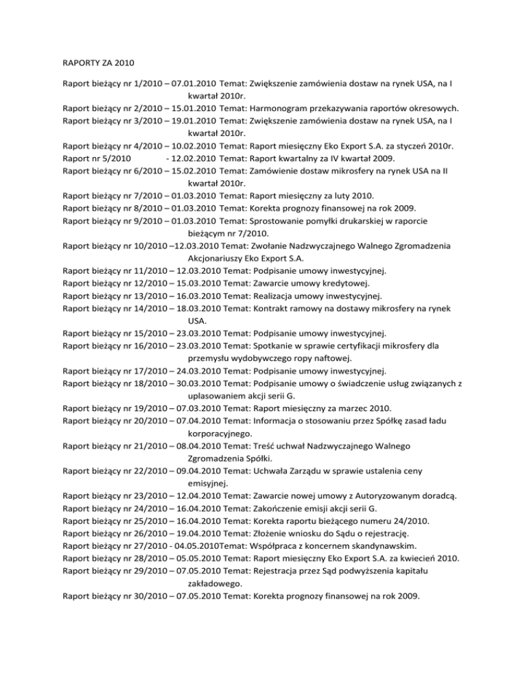 RAPORTY ZA 2010 Raport bieżący nr 1/2010 – 07.01.2010 Temat: Zwiększenie zamówienia dostaw na rynek USA, na I kwartał 2010r. Raport bieżący nr 2/2010 – 15.01.2010 Temat: Harmonogram przekazywania raportów okresowych. Raport bieżący nr 3/2010 – 19.01.2010 Temat: Zwiększenie zamówienia dostaw na rynek USA, na I kwartał 2010r. Raport bieżący nr 4/2010 – 10.02.2010 Temat: Raport miesięczny Eko Export S.A. za styczeń 2010r. Raport nr 5/2010 - 12.02.2010 Temat: Raport kwartalny za IV kwartał 2009. Raport bieżący nr 6/2010 – 15.02.2010 Temat: Zamówienie dostaw mikrosfery na rynek USA na II kwartał 2010r. Raport bieżący nr 7/2010 – 01.03.2010 Temat: Raport miesięczny za luty 2010. Raport bieżący nr 8/2010 – 01.03.2010 Temat: Korekta prognozy finansowej na rok 2009. Raport bieżący nr 9/2010 – 01.03.2010 Temat: Sprostowanie pomyłki drukarskiej w raporcie bieżącym nr 7/2010. Raport bieżący nr 10/2010 –12.03.2010 Temat: Zwołanie Nadzwyczajnego Walnego Zgromadzenia Akcjonariuszy Eko Export S.A. Raport bieżący nr 11/2010 – 12.03.2010 Temat: Podpisanie umowy inwestycyjnej. Raport bieżący nr 12/2010 – 15.03.2010 Temat: Zawarcie umowy kredytowej. Raport bieżący nr 13/2010 – 16.03.2010 Temat: Realizacja umowy inwestycyjnej. Raport bieżący nr 14/2010 – 18.03.2010 Temat: Kontrakt ramowy na dostawy mikrosfery na rynek USA. Raport bieżący nr 15/2010 – 23.03.2010 Temat: Podpisanie umowy inwestycyjnej. Raport bieżący nr 16/2010 – 23.03.2010 Temat: Spotkanie w sprawie certyfikacji mikrosfery dla przemysłu wydobywczego ropy naftowej. Raport bieżący nr 17/2010 – 24.03.2010 Temat: Podpisanie umowy inwestycyjnej. Raport bieżący nr 18/2010 – 30.03.2010 Temat: Podpisanie umowy o świadczenie usług związanych z uplasowaniem akcji serii G. Raport bieżący nr 19/2010 – 07.03.2010 Temat: Raport miesięczny za marzec 2010. Raport bieżący nr 20/2010 – 07.04.2010 Temat: Informacja o stosowaniu przez Spółkę zasad ładu korporacyjnego. Raport bieżący nr 21/2010 – 08.04.2010 Temat: Treść uchwał Nadzwyczajnego Walnego Zgromadzenia Spółki. Raport bieżący nr 22/2010 – 09.04.2010 Temat: Uchwała Zarządu w sprawie ustalenia ceny emisyjnej. Raport bieżący nr 23/2010 – 12.04.2010 Temat: Zawarcie nowej umowy z Autoryzowanym doradcą. Raport bieżący nr 24/2010 – 16.04.2010 Temat: Zakończenie emisji akcji serii G. Raport bieżący nr 25/2010 – 16.04.2010 Temat: Korekta raportu bieżącego numeru 24/2010. Raport bieżący nr 26/2010 – 19.04.2010 Temat: Złożenie wniosku do Sądu o rejestrację. Raport bieżący nr 27/2010 - 04.05.2010Temat: Współpraca z koncernem skandynawskim. Raport bieżący nr 28/2010 – 05.05.2010 Temat: Raport miesięczny Eko Export S.A. za kwiecień 2010. Raport bieżący nr 29/2010 – 07.05.2010 Temat: Rejestracja przez Sąd podwyższenia kapitału zakładowego. Raport bieżący nr 30/2010 – 07.05.2010 Temat: Korekta prognozy finansowej na rok 2009. Raport bieżący nr 31/2010 – 10.05.2010 Temat: Podjęcie uchwały w sprawie podwyższenia kapitału zakładowego Spółki w drodze nowej emisji akcji zwykłych na okaziciela serii H z prawem poboru. Raport nr 32/2010 – 12.05.2010 Temat: Raport okresowy za I kwartał 2010r. Raport bieżący nr 33/2010 – 13.05.2010 Temat: Zwołanie Zwyczajnego Walnego Zgromadzenia Akcjonariuszy Eko Export S.A. Raport bieżący nr 34/2010 – 14.05.2010 Temat: Zmiana terminu publikacji raportu rocznego za rok 2009r. Raport nr 35/2010 – 19.05.2010 Temat: Raport roczny za 2009r. Raport bieżący nr 36/2010 – 21.05.2010 Temat: Podpisanie krótkoterminowego zamówienia na dostawy mikrosfery dla Partnera handlowego z UE. Raport bieżący nr 37/2010 – 21.05.2010 Temat: Kolejne zamówienie od koncernu OMYA. Raport bieżący nr 38/2010 – 38.05.2010 Temat: Podpisanie długoterminowego kontraktu ramowego na dostawy mikrosfery dla przemysłu wydobywczego ropy naftowej. Raport bieżący nr 39/2010 – 24.05.2010 Temat: Publikacja informacji dot. Subskrypcji i zasad przydziału akcji serii H. Raport bieżący nr 40/2010 – 24.05.2010 Temat: Korekta pomyłki drukarskiej. Raport bieżący nr 41/2010 – 26.05.2010 Temat: Uzgodnienie długoterminowego kontraktu ramowego z Parterem Amerykańskim na dostawy mikrosfery. Raport bieżący nr 42/2010 – 27.05.2010 Temat: Zmiana prognozy przychodów i zysków na 2010r. Raport bieżący nr 43/2010 – 01.06.2010 Temat: Raport miesięczny Eko Export S.A. za maj 2010. Raport bieżący nr 44/2010 – 02.06.2010 Temat: Rejestracja jednostkowych praw poboru akcji zwykłych na okaziciela serii H. Raport bieżący nr 45/2010 – 07.06.2010 Temat: Publikacja ogłoszenia w MSiG w sprawie emisji akcji serii H. Raport bieżący nr 46/2010 – 08.06.2010 Temat: Rejestracja akcji zwykłych na okaziciela serii G. Raport bieżący nr 47/2010 – 09.06.2010 Temat: Treść uchwał Zwyczajnego Walnego Zgromadzenia Spółki. Raport bieżący nr 48/2010 – 21.06.2010 Temat: Rejestracja praw do akcji zwykłych na okaziciela serii H i ich akcji. Raport bieżący nr 49/2010 – 22.06.2010 Temat: Wygaśnięcie czasowego ograniczenia zbywalności akcji. Raport bieżący nr 50/2010 – 25.06.2010 Temat: Złożenie wniosku o wprowadzenie akcji do alternatywnego systemu obrotu New Connect. Raport bieżący nr 51/2010 – 29.06.2010 Temat: Raport miesięczny za czerwiec 2010. Raport bieżący nr 52/2010 – 30.06.2010 Temat: Zwiększenie zamówienia na dostawy mikrosfery. Raport bieżący nr 53/2010 – 01.07.2010 Temat: Wprowadzenie do alternatywnego systemu obrotu akcji. Raport bieżący nr 54/2010 – 02.07.2010 Temat: Zaakceptowanie przez Partnera Amerykańskiego nowych cen na II półrocze 2010 i I kwartał 2011 i zaproponowanie nowych korzystnych warunków finansowych. Raport bieżący nr 55/2010 – 07.07.2010 Temat: Kontrakt ramowy na dostawy mikrosfery szarej, mokrej. Raport bieżący nr 56/2010 – 08.07.2010 Temat: Kontrakt ramowy n