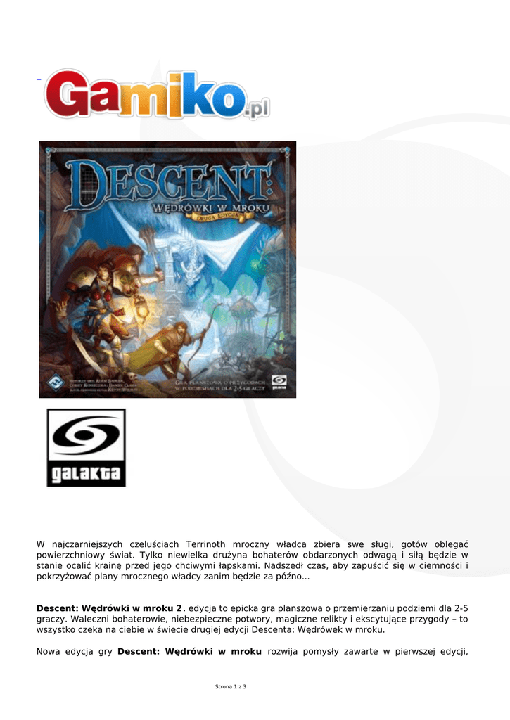 W najczarniejszych czeluściach Terrinoth mroczny władca zbiera swe sługi, gotów oblegać powierzchniowy świat. Tylko niewielka drużyna bohaterów obdarzonych odwagą i siłą będzie w stanie ocalić krainę przed jego chciwymi łapskami. Nadszedł czas, aby zapuścić się w ciemności i pokrzyżować plany mrocznego władcy zanim będzie za późno... Descent: Wędrówki w mroku 2 . edycja to epicka gra planszowa o przemierzaniu podziemi dla 2-5 graczy. Waleczni bohaterowie, niebezpieczne potwory, magiczne relikty i ekscytujące przygody – to wszystko czeka na ciebie w świecie drugiej edycji Descenta: Wędrówek w mroku. Nowa edycja gry Descent: Wędrówki w mroku rozwija pomysły zawarte w pierwszej edycji, Strona 1 z 3 wprowadza nowy system epickich kampanii i przystępne zasady dynamicznej, taktycznej walki. Bohaterowie będą musieli zdobyć moc i doświadczenie podczas serii wciągających fabularnych przygód, aby przygotować się na ostateczne starcie z przebiegłym mrocznym władcą. Gracze mogą też rozegrać każdą ze znajdujących się tutaj przygód osobno. Descent: Wędrówki w mroku 2. Edycja zawiera 39 plastikowych figurek, ponad 200 kart, niemal 50 kafelków planszy i wiele, wiele więcej. To idealna brama do niekończących się przygód! Zawartość pudełka: 24-stronicowa instrukcja 44-stronicowa Księga Przygód 8 plastikowych figurek bohaterów 31 plastikowych figurek potworów 9 specjalnych kości 7 plastikowych podstawek 8 arkuszy bohaterów 1 notes kampanii 84 karty klasy 34 karty przedmiotów sklepowych 16 kart stanów 12 kart przeszukiwania 6 kart reliktów 40 kart mrocznego władcy 18 kart potworów 12 kart popleczników 10 kart wydarzeń podróży 4 karty aktywacji 48 kafelków planszy 45 żetonów obrażeń 35 żetonów zmęczenia 7 drzwi 16 żetonów bohaterów 9 żetonów przeszukiwania 6 żetonów popleczników 10 żetonów celów 8 żetonów postaci 20 żetonów stanów 1 żeton chowańca Ożywieńca Producent: Wiek: Liczba Graczy: Projektant: Czas Gry: Instrukcja: Wydanie: Projektant: Galakta 14+ 2 - 5 graczy Corey Konieczka 120 minut Polska Polskie Kevin Wilson Wiek Strona 2 z 3 14+ Liczba graczy 2-5 graczy Czas gry 120 minut Instrukcja polska Wydanie polskie Producent Galakta Projektant Kevin Wilson Strona 3 z 3