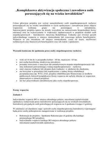 „Kompleksowa aktywizacja społeczna i zawodowa osób poruszających się na wózku inwalidzkim” Celem głównym projektu jest wzrost samodzielności osób niepełnosprawnych ruchowo poruszających się na wózku inwalidzkim w życiu społecznym i zawodowym przez objęcie wsparciem wybranej grupy nie pozostającej w zatrudnieniu. Innowacyjność projektu opiera się przede wszystkim na zastosowaniu bezpośredniej formy rekrutacji oraz na wykorzystaniu w większości zaplanowanych w projekcie działań osób niepełnosprawnych – Instruktorów Aktywnej Rehabilitacji. Unikalny jest również sposób indywidualnego wsparcia w miejscu zamieszkanie lub czasowego pobytu beneficjentów. Wsparcie to jest niezależne od miejsca zamieszkania, czasu od urazu, możliwości technicznych oraz finansowych beneficjentów oraz ich rodzin i opiekunów. Warunki konieczne do spełnienia przez osoby niepełnosprawne ruchowo: wiek od 16 lat do w przypadku kobiet – 60 lat, mężczyzn - 65 lat; jest osobą bezrobotną, nieaktywną zawodowo; posiadać orzeczenie o znacznym lub umiarkowanym stopniu niepełnosprawności lub inny dokument potwierdzający rodzaj niepełnosprawności – ruchowa; mieć znaczne trudności lub skrajnie duże trudności w zdolności do chodzenia; nie korzystać w przeszłości lub współcześnie z żadnej formy rehabilitacji pozamedycznej (np. WTZ, ZAZ, projekty rehabilitacyjne finansowane ze środków publicznych, których kompleksowe formy wsparcia nie są/były zbieżne ze wsparciem planowanym w ramach projektu); nie być pracownikami zatrudnionymi jako osoby niepełnosprawne. Formy wsparcia: Zadanie I Indywidualne wsparcie BO w miejscu aktualnego pobytu: mieszkanie/szpital/ośrodek opiekuńczy realizowane przez instruktorów poruszających się na wózkach inwalidzkich. Instruktorzy przyjadą do osób potrzebujących wsparcia na 4 spotkania trwające 4 godziny. W zależności od charakteru zajęć i potrzeb osoby niepełnosprawnej Instruktorzy wspomagani będą przez osoby pełnosprawne zaangażowane w realizację projektu. Rekrutacja do projektu - Spotkanie Rekrutacyjne (4 godziny dla każdego potencjalnego BO projektu). Indywidualne wsparcie każdego BO miejscu aktualnego pobytu: mieszkanie/szpital/ośrodek opiekuńczy. Działania na tym etapie skierowane są na zmotywowanie osoby niepełnosprawnej do podjęcia starań zmierzających do osiągnięcie optymalnego poziomu niezależności oraz nadanie sensu nowej sytuacji w jakiej znalazł się on i jego najbliższe otoczenie. Udzielone wsparcia będzie miało charakter psychospołecznym, przekazana wiedza dotyczyć będzie wszystkich aspektów niepełnosprawności. Treści spotkań będą indywidualne dobierane do potrzeb osoby niepełnosprawnej. Zadanie II Indywidualne oraz grupowe wsparcie prowadzone w postaci trzech równorzędnych form wsparcia: Obozy Aktywnej Rehabilitacji – „Warsztaty Kompetencji Funkcjonalnych i Społecznych” w tym 8 pełnych treningowych. Obóz Aktywnej Rehabilitacji przeznaczony jest dla osób na wózkach inwalidzkich z uszkodzeniem rdzenia kręgowego. Celem turnusu jest zwiększenie sprawności fizycznej i nauka samodzielności w wykonywaniu czynności dnia codziennego, takich jak: ubieranie się, przesiadanie się na wózek, pokonywanie na wózku barier architektonicznych i naturalnych w terenie (strome podjazdy, krawężniki, schody itp.). lub Warsztaty Aktywnej Rehabilitacji – 8 pełnych dni treningowych Ilość i zakres wsparcia odpowiada temu, jakie otrzymują osoby uczestniczące w Obozach Aktywnej Rehabilitacji, jednak mniejsza ilość uczestników biorących udział w warsztacie zapewnia dużą efektywność pracy i indywidualne podejście. Warsztaty będą odbywały się w każdym województwie, przez co przeprowadzone zostaną bliżej miejsca zamieszkania uczestnika. lub Indywidualne Spotkania/Sesje z Instruktorem Aktywnej Rehabilitacji – 5 sesji trwających 6h, w sumie 30h wsparcia dla każdego BO. Ilość i zakres wsparcia odpowiada temu jakie udzielane jest w trakcie Obozów AR i Warsztatów AR. Indywidualny styl pracy gwarantuje wysoką efektywność pracy, a zatem osiągnięcie wszystkich zamierzonych celów w czasie krótszym niż ten jaki mają do dyspozycji osoby niepełnosprawne w przedstawionych wyżej formach wsparcia. Szczegółowe informacje dotyczące uczestnictwa w projekcie można uzyskać w naszym biurze: Biuro Regionalne, FAR ul. Jagiellończyka 16, 14-200 Iława lub pod numerem tel: (89) 642 12 30. Osoba do kontaktu: Dawid Ostasz 602884077 Małgorzata Doborzyńska 501624669
