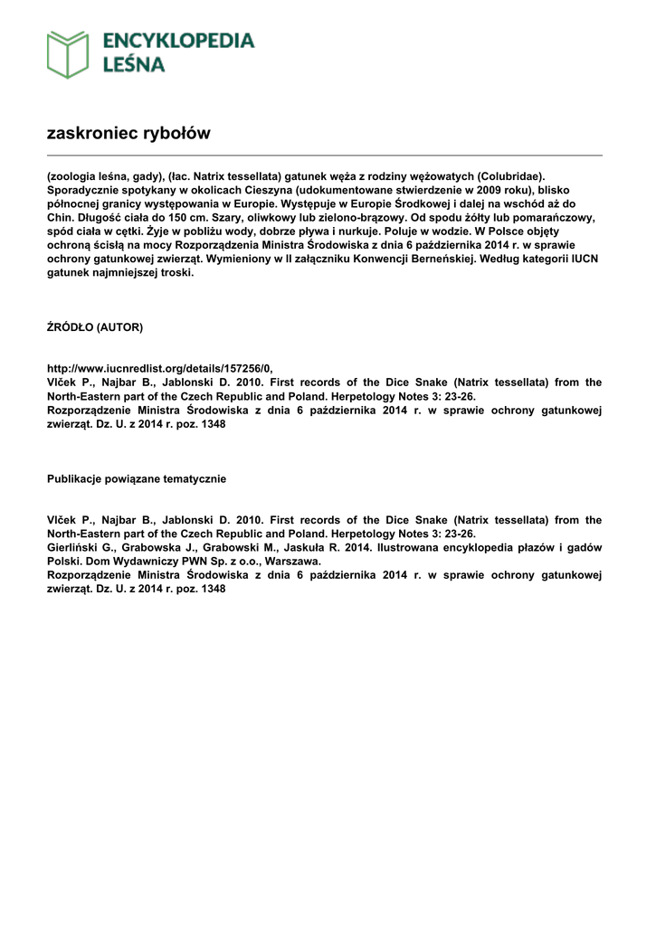 zaskroniec rybołów (zoologia leśna, gady), (łac. Natrix tessellata) gatunek węża z rodziny wężowatych (Colubridae). Sporadycznie spotykany w okolicach Cieszyna (udokumentowane stwierdzenie w 2009 roku), blisko północnej granicy występowania w Europie. Występuje w Europie Środkowej i dalej na wschód aż do Chin. Długość ciała do 150 cm. Szary, oliwkowy lub zielono-brązowy. Od spodu żółty lub pomarańczowy, spód ciała w cętki. Żyje w pobliżu wody, dobrze pływa i nurkuje. Poluje w wodzie. W Polsce objęty ochroną ścisłą na mocy Rozporządzenia Ministra Środowiska z dnia 6 października 2014 r. w sprawie ochrony gatunkowej zwierząt. Wymieniony w II załączniku Konwencji Berneńskiej. Według kategorii IUCN gatunek najmniejszej troski. ŹRÓDŁO (AUTOR) http://www.iucnredlist.org/details/157256/0, Vlček P., Najbar B., Jablonski D. 2010. First records of the Dice Snake (Natrix tessellata) from the North-Eastern part of the Czech Republic and Poland. Herpetology Notes 3: 23-26. Rozporządzenie Ministra Środowiska z dnia 6 października 2014 r. w sprawie ochrony gatunkowej zwierząt. Dz. U. z 2014 r. poz. 1348 Publikacje powiązane tematycznie Vlček P., Najbar B., Jablonski D. 2010. First records of the Dice Snake (Natrix tessellata) from the North-Eastern part of the Czech Republic and Poland. Herpetology Notes 3: 23-26. Gierliński G., Grabowska J., Grabowski M., Jaskuła R. 2014. Ilustrowana encyklopedia płazów i gadów Polski. Dom Wydawniczy PWN Sp. z o.o., Warszawa. Rozporządzenie Ministra Środowiska z dnia 6 października 2014 r. w sprawie ochrony gatunkowej zwierząt. Dz. U. z 2014 r. poz. 1348