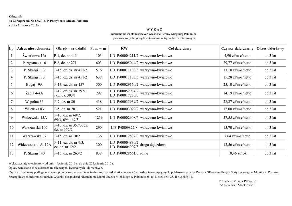Załącznik do Zarządzenia Nr 88/2016/ P Prezydenta Miasta Pabianic z dnia 31 marca 2016 r. WYKAZ nieruchomości stanowiących własność Gminy Miejskiej Pabianice przeznaczonych do wydzierżawienia w trybie bezprzetargowym Lp. Adres nieruchomości Obręb – nr działki Pow. w m2 KW Cel dzierżawy Czynsz dzierżawny Okres dzierżawy 1 Świerkowa 16a P-1, dz. nr 446 103 LD1P/00004211/7 warzywno-kwiatowe 4,90 zł/m-c/netto do 3 lat 2 Partyzancka 16 P-8, dz. nr 271 603 LD1P/00005044/2 warzywno-kwiatowe 29,77 zł/m-c/netto do 3 lat 3 P. Skargi 113 P-15, cz. dz. nr 451/2 516 LD1P/00011183/3 warzywno-kwiatowe 13,10 zł/m-c/netto do 3 lat 4 P. Skargi 113 P-15, cz. dz. nr 451/2 638 LD1P/00011183/3 warzywno-kwiatowe 15,28 zł/m-c/netto do 3 lat 5 Bugaj 19A P-13, cz. dz. nr 157 500 LD1P/00029150/2 warzywno-kwiatowe 25,10 zł/m-c/netto do 3 lat 6 Żabia 4-4A P-12, cz. dz. nr 392/1 i cz. dz. 393/1 292 LD1P/00052934/2 warzywno-kwiatowe LD1P/00017230/0 14,19 zł/m-c/netto do 3 lat 7 Wspólna 36 P-2, dz. nr 80 438 LD1P/00035939/2 warzywno-kwiatowe 28,37 zł/m-c/netto do 3 lat 8 Wileńska 83 P-5, dz. nr 201 521 LD1P/00003079/2 warzywno-kwiatowe 12,00 zł/m-c/netto do 3 lat 9 Widzewska 15A 1259 LD1P/00002908/6 warzywno-kwiatowe 57,55 zł/m-c/netto do 3 lat 10 Warszawska 100 290 LD1P/0009822/8 warzywno-kwiatowe 15,70 zł/m-c/netto do 3 lat 11 Warszawska 87 P-15, dz. nr 10/2 136 LD1P/00012837/0 warzywno-kwiatowe 7,64 zł/m-c/netto do 3 lat 12 Widzewska 11A, 12A P-11, cz. dz. nr 9/3, cz. dz. nr 12/2 300 LD1P/00004830/2 droga dojazdowa LD1P/00004907/3 12,56 zł/m-c/netto do 3 lat 13 P. Skargi 140 P-15, dz. nr 263/2 838 LD1P/00028661/0 rolne 10,46 zł/rok do 3 lat P-10, dz. nr 69/2, 69/3, 69/4, 69/5 P-10, dz. nr 352/3, cz. dz. nr 352/2 Wykaz zostaje wywieszony od dnia 4 kwietnia 2016 r. do dnia 25 kwietnia 2016 r. Opłaty wnoszone są w okresach miesięcznych, kwartalnych lub rocznych. Czynsz dzierżawny podlega waloryzacji corocznie w oparciu o średnioroczny wskaźnik cen towarów i usług konsumpcyjnych, publikowany przez Prezesa Głównego Urzędu Statystycznego w Monitorze Polskim. Szczegółowych informacji udziela Wydział Gospodarki Nieruchomościami Urzędu Miejskiego w Pabianicach, ul. Kościuszki 25, II p.,pokój 14. Prezydent Miasta Pabianic /-/ Grzegorz Mackiewicz