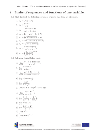 MATHEMATICS 2 levelling classes 2014/2015 (choice by Agnieszka Badeńska) 1 Limits of sequences and functions of one variable. 1.1 Find limits of the following sequences or prove that they are divergent. √ (a) an = n(−1)n ; (−2)n ; n 5n n3 − 5n + 13 = 2 ; 4n − 7 − 3n3 √ ! = n − n2 − 4n + 7 ; !√ = 3 n3 + 6n − 4 − n ; √ = n n · 7n − 4n + n2 · 3n ; p = n 3n2 + cos(n!); (b) an = (c) an (d) an (e) an (f) an (g) an n arctan (nn ) ; n2 + n + 1 3n−2 6n + 5 (i) an = 6n + 1 (h) an = 1.2 Calculate limits if they exist. x2 − x + 2 arctan x ; x→∞ x − x2 1 − cos x lim ; x→0 x sin x √ x2 + 3x − 1 − x √ ; lim x→∞ x − x2 − 2x + 3 1 lim |x| arctan ; x→0 x tan πx √ ; lim x→1 x − x ! lim 2 ln x − ln(x2 + 2x + 3) ; x→∞ 2x x−1 lim ; x→−∞ x+3 1 1 lim ; − x→1 x − 1 ln x (a) lim (b) (c) (d) (e) (f) (g) (h) (i) lim x2 ln(4x); x→0 2 · 2x − 4x ; x→1 x−1 (k) lim+ xsin x ; (j) lim x→0 (l) lim+ (cot x)tan x . x→π Projekt współfinansowany ze środków Unii Europejskiej w ramach Europejskiego Funduszu Społecznego