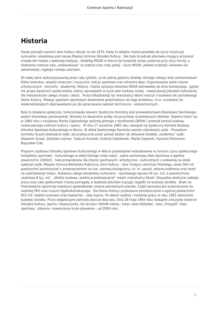 Centrum Sportu i Rekreacji Historia Swoje początki warecki dom kultury datuje na rok 1970, kiedy to władze miasta powołały do życia instytucję kulturalno -oświatową pod nazwą Miejsko Gminny Ośrodek Kultury . Nie była to jednak placówka mogąca przynosić chwałę dla miasta z wiekową tradycją . Siedzibą MGOK w Warce był budynek straży pożarnej przy ulicy Farnej, a dosłownie nieduża sala „widowiskowa” na piętrze oraz mały pokój – biuro MGOK. Jednak trudności lokalowe nie zahamowały ciągłego rozwoju placówki. W małej salce wykorzystywanej przez cały tydzień, co do jednej godziny działały różnego rodzaju koła zainteresowań; Kółka teatralne, zespoły taneczne i muzyczne, sekcje sportowe oraz orkiestra dęta. Organizowano wiele imprez artystycznych , koncerty , akademie, festyny. Ciężka sytuacja lokalowa MGOK potrwałaby do dnia dzisiejszego , gdyby nie grupa wareckich społeczników, którzy wprowadzili w życie plan budowy nowej , nowoczesnej placówki kulturalnej dla mieszkańców całego miasta i okolic . Przez kilkadziesiąt lat mieszkańcy Warki marzyli o budowie tak potrzebnego Domu Kultury. Mówiąc językiem sportowym dwukrotnie podchodzono do tego problemu, m.in. w połowie lat siedemdziesiątych doprowadzono już do opracowania założeń techniczno – ekonomicznych . Były to działania społeczne, funkcjonowały bowiem Społeczne Komitety pod przewodnictwem Bolesława Siwińskiego, potem Stanisławy Jakubowskiej. Niestety te dwukrotne próby nie przyniosły oczekiwanych efektów. Dopiero trzeci raz w 1984 roku z inicjatywy Marka Gajewskiego (póżniej jednego z dyrektorów OKSiW ) powstał zamysł budowy nowoczesnego centrum kultury i sportu . W dniu 27 września 1984 roku zawiązał się Społeczny Komitet Budowy Ośrodka Sportowo Kulturalnego w Warce. W skład Społecznego Komitetu weszło czterdzieści osób . Prezydium komitetu liczyło dwanaście osób, ale praktycznie przez ponad siedem lat aktywnie działała „siódemka” osób: Sławomir Susuk, Zdzisław Lejman, Tadeusz Kulawik, Andrzej Sobolewski, Marek Gajewski, Ryszard Piotrowski, Bogusław Ciak. Program użytkowy Ośrodka Sportowo Kulturalnego w Warce przewidywał wybudowanie w ramach czynu społecznego kompleksu sportowo – kulturalnego w skład którego miały wejść : pełno wymiarowa Hala Sportowa o ogólnej powierzchni 1500m2 , hala przewidziana dla imprez sportowych i artystyczno – kulturalnych z widownią na około sześćset osób, Miejsko Gminna Biblioteka Publiczna, Dom Kultury , Sala Tradycji Lotnictwa Polskiego, około 500 m2 powierzchni pomieszczeń z przeznaczeniem na tzw. odnowę biologiczną ( m. in. sauna), własna kotłownia oraz hotel na sześćdziesiąt miejsc. Kubatura całego kompleksu kulturalno – sportowego wynosi 44 tys. m2, a powierzchnia użytkowa 8 tys. m2 . „Wielka budowa, wielkie przedsięwzięcie” mówili mieszkańcy Warki. Wszystkie okoliczne zakłady pracy oraz cała społeczność miasta pomagały w budowie placówki kupując cegiełki na budowę ośrodka . Braki na finansowanie ogromnej inwestycji spowodowały zmianę pierwotnych planów. Część pomieszczeń przeznaczono na siedzibę PKO oraz Liceum Ogólnokształcącego . Dla Domu Kultury przekazano pomieszczenia o ogólnej powierzchni 653 m2: siedem pracowni oraz kawiarnię – salę imprez. Po latach ciężkiej i mozolnej pracy w roku 1991 ukończono budowę ośrodka. Prace adaptacyjne potrwały jeszcze dwa lata. Dnia 29 maja 1993 roku nastąpiło uroczyste otwarcie Ośrodka Kultury, Sportu i Wypoczynku. Do struktur OKSiW należą : hotel, dwie biblioteki , kino „Przyjaźń”,Hala sportowa , siłownia i nowoczesna kryta pływalnia – od 2000 roku. 1