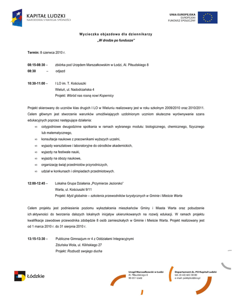 Wy cie czk a o b jaz d o wa d l a d z ien n i ka r zy „W drodze po fundusze” Termin: 8 czerwca 2010 r. 08:15-08:30 – 08:30 – 10:30-11:00 – zbiórka pod Urzędem Marszałkowskim w Łodzi, Al. Piłsudskiego 8 odjazd I LO im. T. Kościuszki Wieluń, ul. Nadodrzańska 4 Projekt: Wśród nas rosną nowi Kopernicy Projekt skierowany do uczniów klas drugich I LO w Wieluniu realizowany jest w roku szkolnym 2009/2010 oraz 2010/2011. Celem głównym jest stworzenie warunków umoŜliwiających uzdolnionym uczniom skuteczne wyrównywanie szans edukacyjnych poprzez następujące działania: • cotygodniowe dwugodzinne spotkania w ramach wybranego modułu: biologicznego, chemicznego, fizycznego lub matematycznego, • konsultacje naukowe z pracownikami wyŜszych uczelni, • wyjazdy warsztatowe i laboratoryjne do ośrodków akademickich, • wyjazdy na festiwale nauki, • wyjazdy na obozy naukowe, • organizację świąt przedmiotów przyrodniczych, • udział w konkursach i olimpiadach przedmiotowych. 12:00-12:45 – Lokalna Grupa Działania „Przymierze Jeziorsko” Warta, ul. Kościuszki 9/11 Projekt: Myśl globalnie – szkolenia przewodników turystycznych w Gminie i Mieście Warta Celem projektu jest podniesienie poziomu wykształcenia mieszkańców Gminy i Miasta Warta oraz pobudzenie ich aktywności do tworzenia dalszych lokalnych inicjatyw ukierunkowanych na rozwój edukacji. W ramach projektu kwalifikacje zawodowe przewodnika zdobędzie 8 osób zamieszkałych w Gminie i Mieście Warta. Projekt realizowany jest od 1 marca 2010 r. do 31 sierpnia 2010 r. 13:15-13:30 – Publiczne Gimnazjum nr 4 z Oddziałami Integracyjnymi Zduńska Wola, ul. Kilińskiego 27 Projekt: Rozbudź swojego ducha Głównym celem projektu jest wyrównanie szans edukacyjnych uczniów szkoły poprzez rozszerzenie oferty edukacyjnej i wychowawczej. Grupę docelową stanowią uczniowie: zagroŜeni wypadnięciem z systemu oświaty, ze specjalnymi potrzebami edukacyjnymi (w tym – z orzeczeniami o niepełnosprawności), mający problemy z nauką i przystosowaniem społecznym, wyraŜający wolę rozwijania swojej wiedzy i umiejętności posługiwania się nią, pragnący rozwijać swoje zainteresowania i uzdolnienia, mający ograniczony dostęp do instytucji kulturalno-oświatowych i alternatywnych form spędzania czasu. W projekcie prowadzone są m.in.: • zajęcia usprawniające zaburzenia percepcyjno-motoryczne, • zajęcia usprawniające kompetencje matematyczne i usprawniające orientację przestrzenną, • zajęcia wyrównawcze z: jęz. angielskiego, chemii, matematyki, fizyki, • koło astronomiczne, • warsztaty polonistyczne, • warsztaty dziennikarskie – Etyka zawodowa i krytycyzm w pracy dziennikarza. Projekt realizowany jest w okresie od 17 sierpnia 2009 r. do 31 lipca 2011 r. 13:30-13:45 – Szkoła Podstawowa nr 9 z Oddziałami Integracyjnymi Zduńska Wola, ul. Kilińskiego 27 Projekt: Inny nie znaczy gorszy Celem ogólnym projektu jest kompleksowe wyrównywanie szans edukacyjnych, zmniejszenie dysproporcji w osiągnięciach edukacyjnych w nauczaniu integracyjnym oraz podniesienie poziomu jakości procesu kształcenia uczniów Szkoły Podstawowej nr 9 z Oddziałami Integracyjnymi w Zduńskiej Woli. W projekcie są prowadzone m.in.: zajęcia wyrównawcze dla uczniów nauczania początkowego, a takŜe dla uczniów kl. IV – VI z języka polskiego, matematyki, przyrody i języka angielskiego, zajęcia muzykoterapii, biblioterapii i plastykoterapii oraz nauka języka migowego. Projekt realizowany jest w okresie od 1 września 2009 roku do 31 sierpnia 2011 roku. 13:45-14:15 – obiad w Szkole Podstawowej nr 9 w Zduńskiej Woli 15:15-15:45 – Gminne Centrum Informacji w Konstantynowie Łódzkim Konstantynów Łódzki, Pl. Kościuszki 8 Projekt: Konstantynowska Szkoła Rodzenia Celem projektu jest umoŜliwienie bezpłatnego uczestnictwa w szkole rodzenia na terenie gminy Konstantynów Łódzki. Trzy sześciotygodniowe cykle (od lutego 2010 r. do października 2010 r.) obejmują: • zajęcia wykładowe (raz w tygodniu po 2 godziny dydaktyczne) prowadzone przez lekarza ginekologa – połoŜnika, lekarza pediatrę, połoŜnika, prawnika, psychologa, • zajęcia ćwiczeniowe (takŜe raz w tygodniu po 2 godziny dydaktyczne), które mają na celu m.in.: przygotowanie do porodu, naukę łagodzenia bólu porodowego, ćwiczenia fizyczne i relaksujące przygotowujące do porodu oraz naukę opieki i pielęgnacji noworodka). 16:15-16:45 – Inkubator Technologiczny Arterion Łódź, ul. Rewolucji 1905 r. nr 82 pok. 38/39 Projekt: Szkoła kaskaderów Szkolenie odbywa się w 11 miesięcznym cyklu (od października 2009 r. do września 2010 r.), w ramach którego przeprowadzony zostanie 6 miesięczny kurs podstawowy i 5 miesięczny kurs specjalistyczny. Zajęcia odbywają się w weekendy. Do udziału w projekcie dopuszczono 30 kandydatów. Kolejnych 30 kandydatów tworzy listę rezerwową. Kurs podstawowy obejmuje zajęcia z języka angielskiego, szermierkę, sztuki walki, gimnastykę i akrobatykę, skoki i upadki z wysokości, techniki zabezpieczeń, jazdę samochodem i technikę gry aktorskiej. W ramach Kursu Specjalistycznego odbywa się kurs alpinistyczny, kurs pracy na wysokościach, kurs kierowcy wyścigowego, kurs nurkowania, kurs skoków spadochronowych, kurs jazdy konnej, kurs instruktora samoobrony, skoki z duŜych wysokości, techniki kaskaderskie, szkolenie przeprowadzone przez kaskaderów z USA. 16:45-17:00 – Zakończenie: Łódź, Al. Piłsudskiego 8
