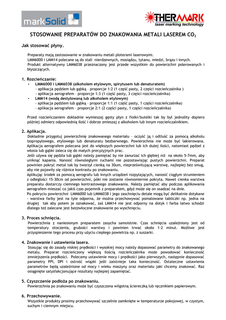 STOSOWANIE PREPARATÓW DO ZNAKOWANIA METALI LASEREM CO2 Jak stosować płyny. Preparaty mają zastosowanie w znakowaniu metali ploterami laserowymi. LMM6000 i LMM14 polecane są do stali nierdzewnych, mosiądzu, tytanu, miedzi, brązu i innych. Produkt alternatywny LMM6038 przeznaczony jest przede wszystkim do powierzchni polerowanych i błyszczących. 1. Rozcieńczanie: • • LMM6000 i LMM6038 (alkoholem etylowym, spirytusem lub denaturatem) - aplikacja pędzlem lub gąbką – proporcje 1:2 (1 część pasty, 2 części rozcieńczalnika ) - aplikacja aerografem – proporcje 1:3 (1 część pasty, 3 części rozcieńczalnika) LMM14 (wodą destylowaną lub alkoholem etylowym) - aplikacja pędzlem lub gąbką – proporcje 1:1 (1 część pasty, 1 części rozcieńczalnika) - aplikacja aerografem – proporcje 2:1 (2 części pasty, 1 części rozcieńczalnika) Przed rozcieńczaniem dokładnie wymieszaj gęsty płyn z fiolki/butelki tak by był jednolity dopiero później odmierz odpowiednią ilość i dobrze zmieszaj z alkoholem lub innym rozcieńczalnikiem. 2. Aplikacja. Dokładnie przygotuj powierzchnię znakowanego materiału – oczyść ją i odtłuść za pomocą alkoholu izopropylowego, etylowego lub denaturatu bezbarwnego. Powierzchnia nie może być lakierowana. Aplikacja aerografem polecana jest do większych powierzchni lub ich dużej ilości, natomiast pędzel z włosia lub gąbki zaleca się do małych precyzyjnych prac. Jeśli używa się pędzla lub gąbki należy pamiętać by nie zanurzać ich głębiej niż na około 5-7mm, aby uniknąć kapania. Nanosić równoległymi ruchami nie pozostawiając pustych powierzchni. Preparat powinien pokryć metal tak by tworzył cienką na 30um, nieprześwitującą warstwę, najlepiej bez smug, aby nie pojawiły się różnice kontrastu po znakowaniu. Aplikując środek za pomocą aerografu lub innych urządzeń rozpylających, nanosić ciągłym strumieniem z odległości 15-30cm od powierzchni, póki nie zostanie równomiernie pokryta. Nawet cienka warstwa preparatu dostarczy ciemnego kontrastowego znakowania. Należy pamiętać aby podczas aplikowania aerografem mieszać co jakiś czas pojemnik z preparatem, gdyż może się on osadzać na dnie. Po pokryciu powierzchni LMM6000 lub LMM6038 i jego zaschnięciu detale mogą być delikatnie dotykane - warstwa farby jest na tyle odporna, że można przechowywać pomalowane tabliczki np. jedna na drugiej tak aby potem je oznakować, zaś LMM14 nie jest odporny na dotyk i farba łatwo schodzi dlatego też zalecane jest bezzwłoczne znakowanie po wyschnięciu. 3. Proces schnięcia. Powierzchnia z naniesionym preparatem zasycha samoistnie. Czas schnięcia uzależniony jest od temperatury otoczenia, grubości warstwy i powinien trwać około 1-2 minut. Możliwe jest przyspieszenie tego procesu przy użyciu ciepłego powietrza np. z suszarki. 4. Znakowanie i ustawienia lasera. Stosując się do zasady niskiej prędkości i wysokiej mocy należy dopasować parametry do znakowanego metalu. Preparat rozcieńczony większą ilością rozcieńczalnika może powodować konieczność zmniejszenia prędkości. Polecamy ustawienie mocy i prędkości jako pierwszych, następnie dopasować parametry PPI, DPI i ostrość wiązki jeśli zaistnieje taka konieczność. Ostateczne ustawienia parametrów będą uzależnione od mocy i wieku maszyny oraz materiału jaki chcemy znakować. Raz osiągnięte satysfakcjonujące rezultaty najlepiej zapamiętać. 5. Czyszczenie podłoża po znakowaniu. Powierzchnia po znakowaniu może być czyszczona wilgotną ściereczką lub ręcznikiem papierowym. 6. Przechowywanie. Wszystkie produkty prosimy przechowywać szczelnie zamknięte w temperaturze pokojowej, w czystym, suchym i ciemnym miejscu. Jak stosować aerozol. • • • • Aerozol jest wygodną alternatywą do znakowania większych powierzchni lub większej ilości detali, oraz gdy preparat do znakowania musi być gotowy natychmiast. Należy jednak pamiętać, że rozprysk z dysz powoduje, że nanoszenie preparatu jest mniej dokładne/ekonomiczne i może obejmować większą powierzchnię niż potrzebna do oznakowania w danej chwili. Efektem takiego nanoszenia jest mniejsza wydajność aerozolu w porównaniu z pastami. Przed użyciem pojemnik energicznie wstrząsnąć przez co najmniej 1-2 minuty, a po skończonej pracy odwrócić dnem do góry i przeczyścić dysze wypuszczając trochę gazu. Na obrabianą (znakowaną) odtłuszczoną powierzchnię nanieś aerozolem preparat trzymając pojemnik 15-30cm od detalu, tak by stworzyć jednorodną kryjącą warstwę bez prześwitów. Środek powinien dobrze przylegać do podłoża i mieć grubość minimum 30 um, taka grubość środka gwarantuje nam precyzyjne i kontrastowe znakowanie. Poczekać aż naniesiona warstwa preparatu wyschnie. Proces ten można przyspieszyć stosując suszarkę do włosów, dmuchawę gorącego powietrza lub promiennik podczerwony itp. (proszę zapoznać się również z punktami 2, 3, 4, 5, i 6). Jak stosować taśmę samoprzylepną. • • • • • • • Wybierz odpowiednią szerokość taśmy do powierzchni materiału jaki chcesz oznakować. Dokładnie przygotuj powierzchnię znakowanego materiału – oczyść ją i odtłuść za pomocą alkoholu izopropylowego, etylowego lub denaturatu bezbarwnego. Na obrabianą (znakowaną) powierzchnię naklej taśmę, tak aby dobrze przylegała do materiału na całej powierzchni. Umieść przygotowany detal z naklejoną taśmą w urządzeniu laserowym i poprawnie ustaw ogniskową lasera. Dobierz parametry pracy urządzenia laserowego. Ustaw odpowiedni strumień powietrza wspomagającego tak by nie zerwał taśmy z obrabianego materiału. Uruchom proces znakowania. Po zakończeniu znakowania wyjmij obrobiony materiał. Wyczyść oznakowany materiał z resztek taśmy odrywając je lub używając do tego celu odpowiedniego rozpuszczalnika (wody lub alkoholu). (proszę zapoznać się równie