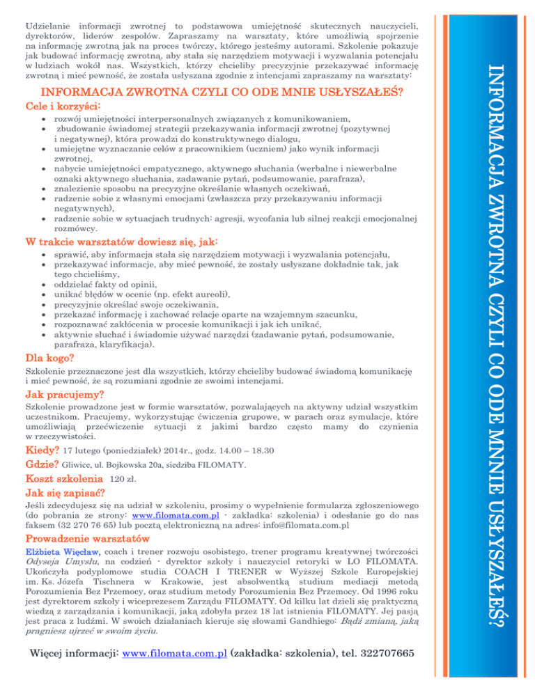 INFORMACJA ZWROTNA CZYLI CO ODE MNIE USŁYSZAŁEŚ? Cele i korzyści: rozwój umiejętności interpersonalnych związanych z komunikowaniem, zbudowanie świadomej strategii przekazywania informacji zwrotnej (pozytywnej i negatywnej), która prowadzi do konstruktywnego dialogu, umiejętne wyznaczanie celów z pracownikiem (uczniem) jako wynik informacji zwrotnej, nabycie umiejętności empatycznego, aktywnego słuchania (werbalne i niewerbalne oznaki aktywnego słuchania, zadawanie pytań, podsumowanie, parafraza), znalezienie sposobu na precyzyjne określanie własnych oczekiwań, radzenie sobie z własnymi emocjami (zwłaszcza przy przekazywaniu informacji negatywnych), radzenie sobie w sytuacjach trudnych: agresji, wycofania lub silnej reakcji emocjonalnej rozmówcy. W trakcie warsztatów dowiesz się, jak: sprawić, aby informacja stała się narzędziem motywacji i wyzwalania potencjału, przekazywać informacje, aby mieć pewność, że zostały usłyszane dokładnie tak, jak tego chcieliśmy, oddzielać fakty od opinii, unikać błędów w ocenie (np. efekt aureoli), precyzyjnie określać swoje oczekiwania, przekazać informację i zachować relacje oparte na wzajemnym szacunku, rozpoznawać zakłócenia w procesie komunikacji i jak ich unikać, aktywnie słuchać i świadomie używać narzędzi (zadawanie pytań, podsumowanie, parafraza, klaryfikacja). Dla kogo? Szkolenie przeznaczone jest dla wszystkich, którzy chcieliby budować świadomą komunikację i mieć pewność, że są rozumiani zgodnie ze swoimi intencjami. Jak pracujemy? Szkolenie prowadzone jest w formie warsztatów, pozwalających na aktywny udział wszystkim uczestnikom. Pracujemy, wykorzystując ćwiczenia grupowe, w parach oraz symulacje, które umożliwiają przećwiczenie sytuacji z jakimi bardzo często mamy do czynienia w rzeczywistości. Kiedy? 17 lutego (poniedziałek) 2014r., godz. 14.00 – 18.30 Gdzie? Gliwice, ul. Bojkowska 20a, siedziba FILOMATY. Koszt szkolenia 120 zł. Jak się zapisać? Jeśli zdecydujesz się na udział w szkoleniu, prosimy o wypełnienie formularza zgłoszeniowego (do pobrania ze strony: www.filomata.com.pl - zakładka: szkolenia) i odesłanie go do nas faksem (32 270 76 65) lub pocztą elektroniczną na adres: [email protected] Prowadzenie warsztatów Elżbieta Więcław, coach i trener rozwoju osobistego, trener programu kreatywnej twórczości Odyseja Umysłu, na codzień - dyrektor szkoły i nauczyciel retoryki w LO FILOMATA. Ukończyła podyplomowe studia COACH I TRENER w Wyższej Szkole Europejskiej im. Ks. Józefa Tischnera w Krakowie, jest absolwentką studium mediacji metodą Porozumienia Bez Przemocy, oraz studium metody Porozumienia Bez Przemocy. Od 1996 roku jest dyrektorem szkoły i wiceprezesem Zarządu FILOMATY. Od kilku lat dzieli się praktyczną wiedzą z zarządzania i komunikacji, jaką zdobyła przez 18 lat istnienia FILOMATY. Jej pasją jest praca z ludźmi. W swoich działaniach kieruje się słowami Gandhiego: Bądź zmianą, jaką pragniesz ujrzeć w swoim życiu. Więcej informacji: www.filomata.com.pl (zakładka: szkolenia), tel. 322707665 INFORMACJA ZWROTNA CZYLI CO ODE MNNIE USŁYSZAŁEŚ? Udzielanie informacji zwrotnej to podstawowa umiejętność skutecznych nauczycieli, dyrektorów, liderów zespołów. Zapraszamy na warsztaty, które umożliwią spojrzenie na informację zwrotną jak na proces twórczy, którego jesteśmy autorami. Szkolenie pokazuje jak budować informację zwrotną, aby stała się narzędziem motywacji i wyzwalania potencjału w ludziach wokół nas. Wszystkich, którzy chcieliby precyzyjnie przekazywać informację zwrotną i mieć pewność, że została usłyszana zgodnie z intencjami zapraszamy na warsztaty: