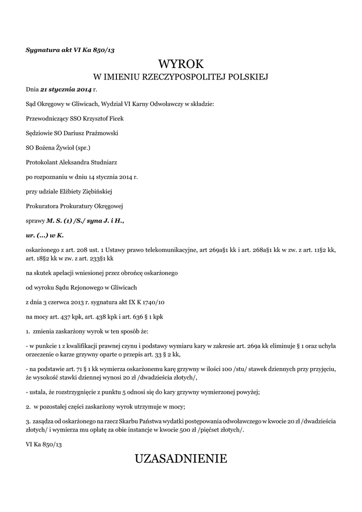 Sygnatura akt VI Ka 850/13 WYROK W IMIENIU RZECZYPOSPOLITEJ POLSKIEJ Dnia 21 stycznia 2014 r. Sąd Okręgowy w Gliwicach, Wydział VI Karny Odwoławczy w składzie: Przewodniczący SSO Krzysztof Ficek Sędziowie SO Dariusz Prażmowski SO Bożena Żywioł (spr.) Protokolant Aleksandra Studniarz po rozpoznaniu w dniu 14 stycznia 2014 r. przy udziale Elżbiety Ziębińskiej Prokuratora Prokuratury Okręgowej sprawy M. S. (1) /S./ syna J. i H., ur. (...) w K. oskarżonego z art. 208 ust. 1 Ustawy prawo telekomunikacyjne, art 269a§1 kk i art. 268a§1 kk w zw. z art. 11§2 kk, art. 18§2 kk w zw. z art. 233§1 kk na skutek apelacji wniesionej przez obrońcę oskarżonego od wyroku Sądu Rejonowego w Gliwicach z dnia 3 czerwca 2013 r. sygnatura akt IX K 1740/10 na mocy art. 437 kpk, art. 438 kpk i art. 636 § 1 kpk 1. zmienia zaskarżony wyrok w ten sposób że: - w punkcie 1 z kwalifikacji prawnej czynu i podstawy wymiaru kary w zakresie art. 269a kk eliminuje § 1 oraz uchyla orzeczenie o karze grzywny oparte o przepis art. 33 § 2 kk, - na podstawie art. 71 § 1 kk wymierza oskarżonemu karę grzywny w ilości 100 /stu/ stawek dziennych przy przyjęciu, że wysokość stawki dziennej wynosi 20 zł /dwadzieścia złotych/, - ustala, że rozstrzygnięcie z punktu 5 odnosi się do kary grzywny wymierzonej powyżej; 2. w pozostałej części zaskarżony wyrok utrzymuje w mocy; 3. zasądza od oskarżonego na rzecz Skarbu Państwa wydatki postępowania odwoławczego w kwocie 20 zł /dwadzieścia złotych/ i wymierza mu opłatę za obie instancje w kwocie 500 zł /pięćset złotych/. VI Ka 850/13 UZASADNIENIE Od wyroku Sądu Rejonowego w Gliwicach z dnia 3 czerwca 2013r., sygn.akt IX K 1740/10, apelację wniósł obrońca oskarżonego M. S. (1). Zaskarżył orzeczenie w całości zarzucając: 1.obrazę prawa procesowego, a to art. 2 § 2 kpk w zw. z art. 5 § 2 kpk w zw. z art. 7 kpk przez ich niezastosowanie, polegającą na przekroczeniu zasady swobodnej oceny dowodów oraz przyjęciu wniosków niewynikających z ustalonych przez Sąd Rejonowy przesłanek, prowadzącą w konsekwencji do błędu w ustaleniach faktycznych i uznania, że oskarżony popełnił przypisane mu w pkt 1 i 2 wyroku czyny zabronione, a w szczególności: -bezkrytycznej ocenie zeznań B. D. (1) niezgodnie z zasadami prawidłowego rozumowania oraz doświadczenia życiowego, przez nieuwzględnienie faktu, że świadek ten jest skonfliktowanym z oskarżonym byłym jego pracownikiem, w którego samochodzie znaleziono urządzenie nadawcze, a tym samym jest bezpośrednio zainteresowanym w wydaniu wyroku skazującego wobec oskarżonego, -pominięciu dowodu w postaci badań biologicznych – opinii z dnia 11.05.2009r., z której wynika, że w zaparkowanym pod Urzędem Gminy w R. samochodzie osobowym marki F. (...) nie ujawniono DNA oskarżonego, 2.błąd w ustaleniach faktycznych polegający na błędnym przyjęciu, że oskarżony dopuścił się przypisanych mu przestępstw, w szczególności: -bezpodstawnym ustaleniu, że oskarżony w zakresie objętych zarzutem, zaistniałych od 20 do 24 października 2008r. zakłóceń pracy sieci teleinformatycznej wyłącznie na terenie R. miał motyw, aby działać na szkodę przedsiębiorców świadczących na tym terenie swoje usługi, w sytuacji gdy podmioty te nie stanowiły dla siebie konkurencji w tym zakresie, gdyż oskarżony nie świadczył usług na terenie R., a co więcej – nie posiadał zezwolenia na tworzenie sieci teleinformacyjnej na terenie województwa (...), -bezpodstawnym ustaleniu, że oskarżony przyprowadził wskazany w zarzucie samochód marki F. (...) przed Urząd Gminy w R. i używał znajdującego się w nim urządzenia w sytuacji, gdy w pojeździe nie ujawniono śladów DNA oskarżonego, przy jednoczesnym niewykazaniu w postępowaniu, w jakich okolicznościach, kiedy i jak długo przedmiotowy samochód miał być zaparkowany we wskazanym miejscu, a także nie przeprowadzeniu badania w kierunku występowania śladów biologicznych na samym urządzeniu zakłócającym i jego osprzęcie. W oparciu o takie zarzuty apelujący wniósł o zmianę zaskarżonego wyroku i uniewinnienie oskarżonego względnie uchylenie tego orzeczenia i przekazanie sprawy sądowi pierwszej instancji do ponownego rozpoznania. Sąd Okręgowy nie podzielił zarzutów i wniosków apelacji, jakkolwiek w wyniku kontroli zaskarżonego wyroku dokonał w nim zmian, które omówione zostaną w dalszej części niniejszego uzasadnienia. Sąd Okręgowy nie znalazł podstaw do kwestionowania prawidłowości przeprowadzonej przez sąd meriti oceny zgromadzonego materiału dowodowego. Przekonującej argumentacji podważającej wywody sądu zawarte w pisemnym uzasadnieniu zaskarżonego wyroku, apelujący bowiem nie powołał. Pozostaje faktem, że podstawowym dowodem obciążającym oskarżonego są zeznania świadka B. D. (1). Podkreślana przez apelującego okoliczność - a mianowicie, że świadek ten z tej racji, iż oskarżony, który swego czasu był pracodawcą świadka, zalega mu z wypłatą wynagrodzenia - sama przez się nie dowodzi, że istniał wystarczający powód, dla którego zeznania świadka należy ocenić, jako niewiarygodne. Podstawą możliwości przyjęcia, że M. S. (1) emitował sygnał zakłócający pracę sieci teleinformatycznych było przede wszystkim ustalenie, że to oskarżony dysponował samochodem, /którego przecież nie był właścicielem/w którym znajdowało się urządzenie nadawcze, a nie dysponował nim w tamtym czasie świadek D.. B. D. zeznał, iż w okresie luty-marzec przekazał kluczyki do swego niesprawnego i wymagającego wówczas remontu F. (...) oraz dokumenty związane z pojazdem oskarżonemu, który miał się postarać o nowy silnik do tego auta. Okres dysponowania autem przez oskarżonego przedłużał się, jednak świadek to tolerował, gdyż samochód w tamtym czasie nie był mu potrzebny. Ową istotną dla sprawy okoliczność korespondującą