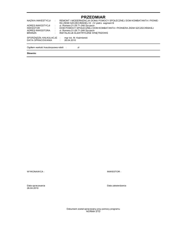 PRZEDMIAR NAZWA INWESTYCJI : ADRES INWESTYCJI INWESTOR ADRES INWESTORA BRANŻA : : : : SPORZĄDZIŁ KALKULACJE DATA OPRACOWANIA REMONT I MODERNIZACJA DOMU POMOCY SPOŁECZNEJ DOM KOMBATANTA I PIONIERA ZIEMI SZCZECIŃSKIEJ III i IV pietro segment B ul. Romera 21-29 71-246 Szczecin DOM POMOCY SPOŁECZNEJ DOM KOMBATANTA I PIONIERA ZIEMI SZCZECIŃSKIEJ ul. Romera 21-29 71-246 Szczecin INSTALACJE ELEKTRYCZNE WNĘTRZOWE : : Ogółem wartość kosztorysowa robót mgr inż. M. Kaźmierski 26.04.2010 : zł Słownie: WYKONAWCA : INWESTOR : Data opracowania 26.04.2010 Data zatwierdzenia Dokument został opracowany przy pomocy programu NORMA STD romera wersja3.ath Lp. 1 1 d.1 KSIĄŻKA PRZEDMIARÓW Podstawa Opis i wyliczenia WLZ i rozdzielnice KNNR 5 Tablice rozdzielcze GTR+GTA 0404-02 1 2 KNNR 5 d.1 0404-01 3 KNNR 5 d.1 0404-03 4 KNNR 5 d.1 0405-01 5 KNNR 5 d.1 0103-08 6 KNNR 5 d.1 0713-06 7 KNNR 5 d.1 1207-15 8 KNNR 5 d.1 0101-08 9 KNNR 5 d.1 0201-09 10 KNNR 5 d.1 0201-06 11 KNNR 5 d.1 0203-01 12 KNNR 5 d.1 0201-04 13 KNNR 5 d.1 0201-05 14 KNNR 5 d.1 1207-01 15 KNNR 5 d.1 0205-01 16 KNNR 5 d.1 0205-03 17 KNNR 5 d.1 0205-03 18 KNNR 5 d.1 0205-02 j.m. szt. szt. 18 szt. Tablice rozdzielcze o masie do 30 kg Tablica TR-TV szt. 1 szt. Montaż głównego wyłącznika prądu szt. 1 szt. Rury winidurowe o śr.do 110 mm układane n.t. na podłożu innym niż beton m 42 m Układanie kabli YKXs 4x95 mm2 wrurach, pustakach lub kanałach zamknię- m tych 32 m Wykucie bruzd dla rur RS47 w cegle m 64 m Rury winidurowe o śr.do 47 mm układane p.t. w gotowych bruzdach w pod- m łożu innym niż beton 64 m Przewody LGy 95 mm2 wciągane do rur m 35 m Przewody LgY 25 mm2 wciągane do rur m 125 m Przewody kabelkowe NKGS 2x1,5 mm2 wciągane do rur m 60 m Przewody LGs 10 mm2 wciągane do rur m 75 m Przewody LGs16 mm2 wciągane do rur m 1015 m Wykucie bruzd dla przewodów wtynkowych w cegle m 105 m Przewody NKGs 3x1,5 mm2 układane p.t. w gotowych bruzdach w podłożu m innym niż betonowe 90 m Przewody kabelkowe oLgY 16 mm2 układane p.t. w gotowych bruzdach w podłożu innym niż betonowe 275 m Przewody LgY 70 mm2 układane p.t. w gotowych bruzdach w podłożu innym niż betonowe 10 m Przewody YDY 3x4 mm2 układane p.t. w gotowych bruzdach w podłożu innym niż betonowe m Norma STD Wersja 4.11 Licencja: 2096 dla Elektroplan Razem szt. Tablice rozdzielcze o masie do 10 kg-Tablica TM -2- Poszcz m m 1.000 RAZEM 1.000 18.000 RAZEM 18.000 1.000 RAZEM 1.000 1.000 RAZEM 1.000 42.000 RAZEM 42.000 32.000 RAZEM 32.000 64.000 RAZEM 64.000 64.000 RAZEM 64.000 35.000 RAZEM 35.000 125.000 RAZEM 125.000 60.000 RAZEM 60.000 75.000 RAZEM 75.000 1015.000 RAZEM 1015.000 105.000 RAZEM 105.000 90.000 RAZEM 90.000 275.000 RAZEM 275.000 10.000 RAZEM 10.000 romera wersja3.ath Lp. KSIĄŻKA PRZEDMIARÓW Podstawa Opis i wyliczenia 60 19 KNNR 5 d.1 0726-11 20 KNNR 5 d.1 0726-03 21 KNNR 5 d.1 0726-03 22 KNNR 5 d.1 0726-02 23 KNNR 5 d.1 0726-01 24 KNNR 5 d.1 0726-01 25 KNNR 5 d.1 1302-03 26 KNNR 5 d.1 1301-02 27 KNNR 5 d.1 1301-01 j.m. m Zarobienie na sucho końca kabla 4-żyłowego o przekroju żył do 95 mm2 na szt. napięcie do 1 kV o izolacji i powłoce z tworzyw sztucznych 2 szt. Zarobienie na sucho końca kabla 1-żyłowego o przekroju żył do 95 mm2 na szt. napięcie do 1 kV o izolacji i powłoce z tworzyw sztucznych 2 szt. Zarobienie na sucho końca kabla 1-żyłowego o przekroju żył do 70 mm2 na szt. napięcie do 1 kV o izolacji i powłoce z tworzyw sztucznych 2 szt. Zarobienie na sucho końca kabla 1-żyłowego o przekroju żył do 25 mm2 na szt. napięcie do 1 kV o izolacji i powłoce z tworzyw sztucznych 12 szt. Zarobienie na sucho końca kabla 1-żyłowego o przekroju żył do 10 mm2 na szt. napięcie do 1 kV o izolacji i powłoce z tworzyw sztucznych 10 szt. Zarobienie na sucho końca kabla 1-żyłowego o przekroju żył do 16 mm2 na szt. napięcie do 1 kV o izolacji i powłoce z tworzyw sztucznych 32 szt. Badanie linii kablowej N.N.- kabel 4-żyłowy odc. 2 odc. Sprawdzenie i pomiar 3-fazowego obwodu elektrycznego niskiego napięcia pomiar 5 pomiar Sprawdzenie i pomiar 1-fazowego obwodu elektrycznego niskiego napięcia pomiar 16 pomiar 2 Instalacje administracyjne 28 KNNR 5 Oprawy oświetleniowe przykręcane (zwykłe) - Oprawa RUBIN 2x36W PRM kpl. d.2 0502-03 4 kpl. 29 KNNR 5 d.2 0502-02 30 KNNR 5 d.2 0502-02 31 KNNR 5 d.2 0501-01 32 KNNR 5 d.2 0406-01 33 KNNR 5 d.2 1207-01 34 KNNR 5 d.2 0205-01 35 KNNR 5 d.2 0205-01 Poszcz 60.000 RAZEM Razem 60.000 2.000 RAZEM 2.000 2.000 RAZEM 2.000 2.000 RAZEM 2.000 12.000 RAZEM 12.000 10.000 RAZEM 10.000 32.000 RAZEM 32.000 2.000 RAZEM 2.000 5.000 RAZEM 5.000 16.000 RAZEM 16.000 4.000 RAZEM 4.000 34.000 RAZEM 34.000 4.000 RAZEM 4.000 2.000 RAZEM 2.000 16.000 RAZEM 16.000 2150.000 RAZEM 2150.000 610.000 RAZEM 610.000 630.000 RAZEM 630.000 Oprawy oświetleniowe przykręcane (zwykłe) -Oprawa RUBIN 2x18W PRM kpl. 34 kpl. Oprawy oświetleniowe przykręcane (zwykłe) - Oprawa MONITOR 1 kpl. 4 kpl. Oprawy oświetleniowe zawieszane (zwykłe) -Oprawa MONITOR 2 kpl. 2 kpl. Analogia - montaż modułów awaryjnychw oprawach oświetleniowych szt. 16 szt. Wykucie bruzd dla przewodów wtynkowych w cegle m 2150 m Przewody kabelkowe YDY 3x1,5 układane p.t. w gotowych bruzdach w pod- m łożu innym niż betonowe 610 m Przewody kabelkowe YDY 3x2,5 układane p.t. w gotowych bruzdach w pod- m łożu innym niż betonowe 630 m -3- Norma STD Wersja 4.11 Licencja: 2096 dla Elektroplan romera wersja3.ath KSIĄŻKA PRZEDMIARÓW Lp. Podstawa Opis i wyliczenia j.m. 36 KNNR 5 Przewody kabelkowe YDY 2x1,5 układane p.t. w gotowych bruzdach w pod- m d.2 0205-01 łożu innym niż betonowe 215 m 37 KNNR 5 d.2 0205-01 38 KNNR 5 d.2 0205-01 39 KNNR 5 d.2 1301-01 Przewody kabelkowe YDY 4x1,5 mm2 układane p.t. w gotowych bruzdach w m podłożu innym niż betonowe 215 m Przewody kabelkowe YsTY 4x0,5 mm2 układane p.t. w gotowych bruzdach w podłożu innym niż betonowe 360 m Sprawdzenie i pomiar 1-fazowego obwodu elektrycznego 