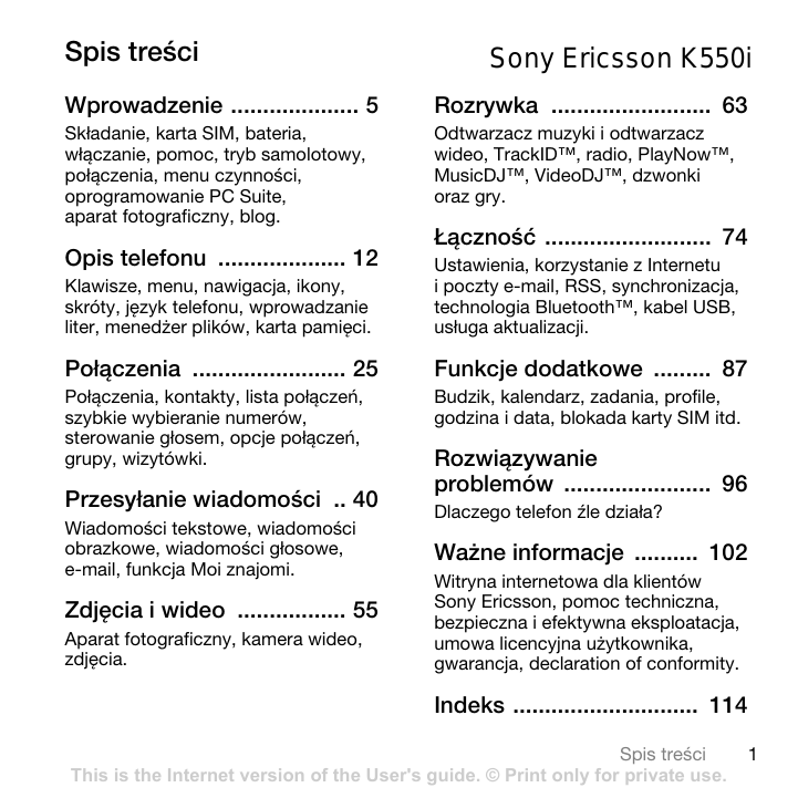 Spis treści Sony Ericsson K550i Wprowadzenie .................... 5 Rozrywka ......................... 63 Składanie, karta SIM, bateria, włączanie, pomoc, tryb samolotowy, połączenia, menu czynności, oprogramowanie PC Suite, aparat fotograficzny, blog. Odtwarzacz muzyki i odtwarzacz wideo, TrackID™, radio, PlayNow™, MusicDJ™, VideoDJ™, dzwonki oraz gry. Opis telefonu .................... 12 Łączność .......................... 74 Klawisze, menu, nawigacja, ikony, skróty, język telefonu, wprowadzanie liter, menedżer plików, karta pamięci. Ustawienia, korzystanie z Internetu i poczty e-mail, RSS, synchronizacja, technologia Bluetooth™, kabel USB, usługa aktualizacji. Połączenia ........................ 25 Funkcje dodatkowe ......... 87 Połączenia, kontakty, lista połączeń, szybkie wybieranie numerów, sterowanie głosem, opcje połączeń, grupy, wizytówki. Budzik, kalendarz, zadania, profile, godzina i data, blokada karty SIM itd. Przesyłanie wiadomości .. 40 Wiadomości tekstowe, wiadomości obrazkowe, wiadomości głosowe, e-mail, funkcja Moi znajomi. Zdjęcia i wideo ................. 55 Aparat fotograficzny, kamera wideo, zdjęcia. Rozwiązywanie problemów ....................... 96 Dlaczego telefon źle działa? Ważne informacje .......... 102 Witryna internetowa dla klientów Sony Ericsson, pomoc techniczna, bezpieczna i efektywna eksploatacja, umowa licencyjna użytkownika, gwarancja, declaration of conformity. Indeks ............................. 114 Spis treści This is the Internet version of the User's guide. © Print only for private use. 1 Sony Ericsson GSM 850/900/1800/1900 Niniejsza instrukcja obsługi została opublikowana przez firmę Sony Ericsson Mobile Communications AB bez żadnych gwarancji. W dowolnym momencie i bez uprzedzenia firma Sony Ericsson Mobile Communications AB może wprowadzać ulepszenia i zmiany wynikające z błędów typograficznych, niedokładności aktualnych informacji czy udoskonaleń programów lub sprzętu. Zmiany te będą uwzględniane w następnych wydaniach tej instrukcji obsługi. Wszelkie prawa zastrzeżone. ©Sony Ericsson Mobile Communications AB, 2006 Numer publikacji: PL/LZT 108 8997 R2A Prosimy zwrócić uwagę, że: Niektóre usługi opisane w tej instrukcji obsługi nie są dostępne we wszystkich sieciach. Dotyczy to także międzynarodowego numeru alarmowego GSM 112. W przypadku wątpliwości, czy dana usługa jest dostępna czy nie, należy kontaktować się z operatorem sieci lub usługodawcą. Przed użyciem telefonu komórkowego prosimy przeczytać rozdziały Zasady bezpiecznej i efektywnej eksploatacji oraz Gwarancja. 2 Ten telefon komórkowy umożliwia pobieranie, zapisywanie i przekazywanie zawartości dodatkowej, na przykład dzwonków. Korzystanie z takiej zawartości może być ograniczone lub zabronione w związku z prawami osób trzecich, w tym w szczególności na skutek ograniczeń wynikających z odpowiednich przepisów o prawie autorskim. Pełną odpowiedzialność za zawartość dodatkową pobieraną do telefonu komórkowego lub przekazywaną z niego ponosi użytkownik, a nie firma Sony Ericsson. Przed skorzystaniem z jakiejkolwiek zawartości dodatkowej użytkownik powinien sprawdzić, czy ma właściwą licencję lub inne pozwolenie na zamierzony sposób wykorzystania. Firma Sony Ericsson nie gwarantuje dokładności, integralności ani jakości zawartości dodatkowej czy innej zawartości oferowanej przez inne podmioty. W żadnym przypadku firma Sony Ericsson nie ponosi jakiejkolwiek odpowiedzialności za niewłaściwe wykorzystanie zawartości dodatkowej lub innej zawartości oferowanej przez inne podmioty. Bluetooth™ jest znakiem towarowym lub zastrzeżonym znakiem towarowym firmy Bluetooth SIG Inc. PlayNow, MusicDJ, PhotoDJ, VideoDJ i Track ID są znakami towarowymi lub zarejestrowanymi znakami towarowymi firmy Sony Ericsson Mobile Communications AB. Spis treści This is the Internet version of the User's guide. © Print only for private use. Memory Stick Micro™ i M2™ są znakami towarowymi firmy Sony Corporation. Cyber-shot jest zarejestrowanym znakiem towarowym firmy Sony Corporation. Real jest znakiem towarowym lub zarejestrowanym znakiem towarowym firmy RealNetworks, Inc. Technologia RealPlayer® for Mobile została wykorzystana na licencji firmy RealNetworks, Inc. Copyright 1995–2004, RealNetworks, Inc. Wszelkie prawa zastrzeżone. Adobe™ Photoshop™ Album Starter Edition jest znakiem towarowym lub zarejestrowanym znakiem towarowym firmy Adobe Systems Incorporated. Microsoft, Windows i PowerPoint są zarejestrowanymi znakami towarowymi lub znakami towarowymi firmy Microsoft Corporation w Stanach Zjednoczonych i innych krajach. Metoda edycji T9™ jest znakiem towarowym lub zarejestrowanym znakiem towarowym firmy Tegic Communications. Metoda edycji T9™ jest licencjonowana na podstawie jednego lub kilku z następujących patentów: U.S. Pat. Nos. 5,818,437, 5,953,541, 5,187,480, 5,945,928 i 6,011,554; Canadian Pat. No. 1,331,057; United Kingdom Pat. No. 2238414B; Hong Kong Standard Pat. No. HK0940329; Republic of Singapore Pat. No. 51383; Euro. Pat. No. 0 842 463 (96927260.8) DE/DK, FI, FR, IT, NL, PT, ES, SE, GB; dodatkowe zgłoszenia patentowe są rozpatrywane na całym świecie. Java i wszystkie związane z nią znaki towarowe i logo są znakami towarowymi lub zastrzeżonymi znakami towarowymi firmy Sun Microsystems Inc. w Stanach Zjednoczonych i innych krajach. Umowa licencyjna użytkownika języka Sun™ Java™ J2ME™. 1 Ograniczenia: Oprogramowanie to poufny materiał chroniony prawem autorskim, należącym do firmy Sun. Tytuł własności wszystkich kopii pozostaje w posiadaniu firmy Sun i/lub jej licencjodawców. Klient nie może modyfikować, dekompilować, dezasemblować, deszyfrować, ekstrahować ani w inny sposób dokonywać odwrotnej inżynierii Oprogramowania. Oprogramowania nie wolno dzierżawić, przypisywać ani udzielać na niego lic