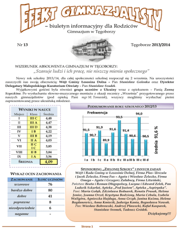 – biuletyn informacyjny dla Rodziców Gimnazjum w Tęgoborzy Nr 13 Tęgoborze 2013/2014 WIZERUNEK ABSOLWENTA GIMNAZJUM W TĘGOBORZY: „Szanuje ludzi i ich pracę, nie niszczy mienia społecznego” Nowy rok szkolny 2013/14, dla całej społeczności szkolnej rozpoczął się 2 września. Na uroczystości zaszczycili nas swoją obecnością: Wójt Gminy Łososina Dolna – Pan Stanisław Golonka oraz Dyrektor Delegatury Małopolskiego Kuratorium Oświaty – Pan Stanisław Szudek. Wyjątkowymi gośćmi była również grupa uczniów z Ukrainy wraz z opiekunem – Panią Żanną Szyszkina. Po wysłuchaniu słowno-muzycznego montażu z okazji rocznicy „Września” przygotowanego przez naszych gimnazjalistów (pod opieką Pani mgr M. Tomasiak), wszyscy mogliśmy wysłuchać pieśni zaprezentowanej przez ukraińską młodzież. Miejsce Klasa Średnia I II III IV V VI III C III A III D IB III B II A II C IC II B IA 4,48 4,47 4,38 4,22 4,19 4,03 VII VIII IX ŚREDNIA PODSUMOWANIE ROKU SZKOLNEGO 2012/13 Frekwencja 94,0 93,5 91,9 91,5 91,6 90,7 91,4 90,6 90,5 89,9 3,85 3,84 3,56 4,09 średnia 91,6 % WYNIKI W NAUCE I a I b I c II a II b II c III a III b III c III d SPONSORING „ZIELONEJ SZKOŁY” I INNYCH ZADAŃ WYKAZ OCEN ZACHOWANIA ZACHOWANIE ILOŚĆ UCZNIÓW wzorowe 76 bardzo dobre 80 dobre 41 poprawne 8 nieodpowiednie 6 naganne - Wójt i Rada Gminy w Łososinie Dolnej, Firma Plus- Urszula i Jacek Żelazko, Firma Fux – Agata i Wiesław Żelazko, Firma Omega – Agata i Grzegorz Załubscy, Firma Litwiński, Państwo: Beata i Roman Długopolscy, Lucyna i Edward Zelek, Pan Ludwik Szkarłat, Apteka „Pod Justem”, Apteka „Aspirynka”. Pani: Maria Gołąb, Zdzisława Bednarek, Renata Prusak, Helena Joniec, Joanna Orzeł, Krystyna Bodziony, Maria Cebula, Izabela Waligóra, Agnieszka Hajduga, Anna Grzyb, Janina Kuźma, Helena Bogdanowicz, Anna Kmiecik, Jadwiga Kania, Bogusława Nowak. Pan: Wiesław Bobrowski, Andrzej Pławecki, Rafał Kasparek, Stanisław Sromek, Tadeusz Gródek. Dziękujemy!!! Strona 1 WYNIKI EGZAMINU GIMNAZJALNEGO J. polski Historia i WOS Przedmioty przyrodn. Poziom podst. Poziom rozsz. 100 % 33 Pkt 100 % 29 Pkt 100 % 28 Pkt 100 % 40 Pkt 100 % 40 Pkt 100 % III A III B III C III D 20,6 19,7 20,3 19,4 64 20,5 19,0 20,1 20,1 62 15,8 14,6 13,0 15,2 54 17,6 17,2 17,2 17,8 63 22,0 22,3 25,9 20,7 55 11,9 11,7 17,5 10,9 30 Szkoła Gmina Powiat Wojew. 20,0 19,7 19,7 20,5 63 20,0 18,9 19,2 19,9 61 14,6 14,3 14,2 14,9 50 17,5 17,3 17,1 17,6 63 22,8 22,7 23,2 25,7 57 13,0 13,5 14,8 18,0 33 62 63 61 62 62 64 2012/13 miejsce Nazwisko i imię I II III IV V Baran Mateusz Drogoś Wiktoria Śmietana Marcelina Bednarek Szymon Waligóra Łucja Orzeł Michał Wolak Angelika Rosiek Szymon Kosecki Dominik Ligęza Karol Krawczyk Stanisław Rosiek Magdalena Joniec Monika NAGRODA To już po raz czwarty, na uroczystości zakończenia przez klasy III edukacji w gimnazjum w czerwcu 2013r. została wręczona finansowa nagroda, ufundowana przez rodzinę ks. Juliana Juzy. W tym roku otrzymał ją uczeń kl. IIIb Mateusz Baran, który uzyskał najwyższy wynik z trzech części egz. gimnazjalnego. Uroczystość pożegnania klas III uświetniła swoją obecnością siostrzenica księdza Juzy – pani Jolanta Juza, która wraz z gratulacjami przekazała nagrodę zasłużonemu uczniowi. 58 61 61 57 58 60 50 45 52 49 49 51 UCZNIOWIE ZE 100% Z EGZAMINU GIMNAZJALNEGO VIII IX X Matemat. Języki obce - j. angielski 32 Pkt NAJWYŻSZE WYNIKI VI VII Część matematyczno przyrodnicza Część humanistyczna FREKWENCJĄ Klasa Nazwisko i imię Ia Płachta Justyna Serafin Ewelina Tomasiak Krystian Baran Anelika Burnagiel Maciej Sromek Jacek Witowska Oliwia Kościelniak Monika Koncewicz Marcelina Cepiga Beata Sromek Weronika Grzyb Joanna Serafin Sylwia Bocheńska Kinga Gołąb Katarzyna Jarosz Tomasz Zmarlak Marek - Ib Ic II a II b II c III a III b III c III d 61 61 64 62 61 63 56 65 52 57 58 64 29 44 27 34 37 45 Z ŻYCIA SZKOŁY … W roku szkolnym 2012/13 nasza młodzież wzięła udział w 27 różnych konkursach przedmiotowych i tematycznych. Mieliśmy czterech uczniów, którzy zostali finalistami pięciu Małopolskich Konkursów przedmiotowych. Byli to: Stanisław Krawczyk (matematyka i chemia), Dominik Kosecki (historia), Marcelina Koncewicz (j. polski), Michał Orzeł (geografia) Organizowaliśmy takie uroczystości szkolne i lokalne jak m.in.: akademia z okazji Dnia KEN Ślubowanie klas pierwszych spektakl wielkanocny „Wędrówka” misterium „Credo – znaczy żyć” jasełka audycje radiowe z okazji Dnia Ziemi i rocznic historycznych klasowe i szkolna „Wigilia” III Koncert Pieśni i Piosenki Patriotycznej Akademia z okazji uchwalenia Konstytucji III Maja i Święto Flagi Dzień Dziecka i sportu szkolnego. Zrealizowaliśmy 10 wycieczek – wyjazdów (m.in. "Zielona Szkoła” we Włoszech). Nasi gimnazjaliści odnosili też liczne sukcesy sportowe! Międzyszkolny Ośrodek Sportowy Powiatu Nowo-sądeckiego zorganizował 21 zawodów sportowych – „Mistrzostw Powiatu – dla szkół gimnazjalnych”. W rywalizacji wzięło udział 1728 uczestników, dziewcząt i chłopców z 50 szkół z całego powiatu. Nasze Gimnazjum znalazło się na 6 miejscu!!! 16 maja 2013r. przeprowadziliśmy już X edycję Międzygminnego Konkursu „Moja Gmina – historia i środowisko”. Strona 2 UCZNIOWIE WYRÓŻNIENI średnia ≥ 4,75 IA IB IC II A II B II C III A III B III C III D Nazwisko i imię Stosur Dorota Oleksy Marlena Krzyżak Gabriela Płachta Justyna Serafin Ewelina Sarata Maria Sołtys Katarzyna Maziarz Mateusz Pajor Joanna Kuźma Iwona Kmiecik Dorota Witowska Oliwia Orzeł Tomasz Cyrulik Mariusz Ptak Ewa Zawiślan Dawid Wolak Natalia Jaśkiewicz Dariusz Wolak Agata Hajduga Karolina Baczyński Damian Koncewicz Marcelina Potoczek Dawid Kościelniak Monika Czup Katarzyna Kuźma Karolina Wolak Angelika Gródek Aneta Cepiga Beata Sromek Weronika Joniec Monika Waligóra Łucja Zelek Jakub Serafin Sylwia Sarata