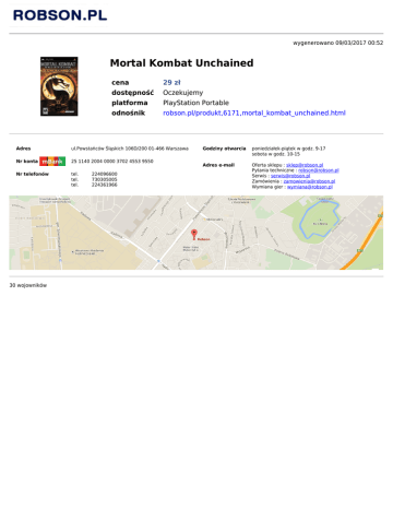 wygenerowano 09/03/2017 00:52 Mortal Kombat Unchained cena 29 zł dostępność Oczekujemy platforma PlayStation Portable odnośnik robson.pl/produkt,6171,mortal_kombat_unchained.html Adres ul.Powstańców Śląskich 106D/200 01-466 Warszawa Nr konta 25 1140 2004 0000 3702 4553 9550 Nr telefonów tel. 224096600 tel. 730305005 tel. 224361966 30 wojowników Godziny otwarcia poniedziałek-piątek w godz. 9-17 sobota w godz. 10-15 Adres e-mail Oferta sklepu : [email protected] Pytania techniczne : [email protected] Serwis : [email protected] Zamówienia : [email protected] Wymiana gier : [email protected]