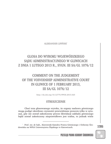 Aleksander Lipiński* Glosa do Wyroku Wojewódzkiego Sądu Administracyjnego w Gliwicach z dnia 1 lutego 2013 r., sygn. III SA/Gl 1076/12 Comment on the Judgement of the Voivodship Administrative Court in Gliwice of 1 February 2013, III SA/Gl 1076/12 http://dx.doi.org/10.12775/PPOS.2015.025 Streszczenie Choć teza głosowanego wyroku, że organy nadzoru górniczego mogą podjąć określone czynności przewidziane prawem tylko w sytuacji, gdy nie został zakończony proces likwidacji zakładu górniczego bądź został zakończony nieprawidłowo jest trafna, to jednak wiele * Prof. zw. dr hab., Kierownik Katedry Prawa Górniczego i Ochrony Środowiska na WPiA Uniwersytetu Śląskiego w Katowicach. Przegląd prawa ochrony środowiska 2/2015 274 Aleksander Lipiński okoliczności dotyczących stanu faktycznego, przyjętego jako podstawa wspomnianego orzeczenia, nie zostało wyjaśnionych. Spółdzielnia mieszkaniowa domagała się zabezpieczenia szybu górniczego, który dawno temu został zlikwidowany. Zdaniem organu nadzoru górniczego likwidacja ta została wykonana prawidłowo. Nie wiadomo jednak od kogo spółdzielnia mieszkaniowa żądała tego zabezpieczenia. Słowa kluczowe Nadzór górniczy; likwidacja zakładu górniczego; usunięcie zagrożenia. Abstract However the thesis of the above judgement, that the mining authority may perform the activity provided by law only if a mining plant had not been properly closed or had been closed improperly is correct, numerous circumstances referring to the facts on which the above judgement is based, are unclear. The housing association demanded the protection of an old mining shaft which was considered as closed down many years before. The mining authority declared that shaft as properly closed down. It is not clear from whom the housing association demanded the protection. Keywords Mining authority; closing closure of a mining plant; threat removal. Teza Organy nadzoru górniczego mogą podjąć określone czynności przewidziane prawem tylko w sytuacji, gdy proces likwidacji zakładu górniczego nie został zakończony, bądź został zakończony nieprawidłowo. 2/2015 Wojewódzki Sąd Administracyjny w Gliwicach po rozpoznaniu na rozprawie sprawy ze skargi Spółdzielni Mieszka- Przegląd prawa ochrony środowiska Glosa do Wyroku Wojewódzkiego Sądu Administracyjnego... niowej w Ś. na decyzję Prezesa Wyższego Urzędu Górniczego w przedmiocie ruchu i likwidacji zakładu górniczego (umorzenia postępowania w sprawie zabezpieczenia szybów oraz likwidacji szybu w byłym obszarze górniczym) oddala skargę. Z uzasadnienia: Prezes Wyższego Urzędu Górniczego (WUG) po rozpoznaniu odwołania Spółdzielni Mieszkaniowej (SM) w Ś., utrzymał decyzję Dyrektora Okręgowego Urzędu Górniczego (OUG) w G. umarzającą postępowanie w sprawie zabezpieczenia szybów I, II i „A” oraz likwidacji szybu III w byłym obszarze górniczym KWK „B” w Ś., w części dotyczącej zabezpieczenia szybów I, II i „A”. Z akt administracyjnych wynika, że Minister Spraw Wewnętrznych i Administracji (MSWiA) wyznaczył Dyrektora OUG w G., jako organ nadzoru górniczego właściwy rzeczowo w sprawie dotyczącej szybu nr III nieistniejącej kopalni w Ś. i zabezpieczenia pozostałych szybów. Działając na podstawie art. 105 k.p.a. organ I instancji umorzył postępowanie wskazując na brak podstaw do podjęcia dodatkowych działań zmierzających do poprawy istniejącego zabezpieczenia szybów I, II i „A”, bowiem nie występuje bezpośrednie zagrożenie bezpieczeństwa powszechnego (art. 81a ustawy z dnia 4 lutego 1994 r. – Prawo geologiczne i górnicze (Dz.U. z 2005 r. Nr 228, poz. 1947, ze zm., dalej: u.p.g.g.). Stwierdzone podczas wizji lokalnej zabezpieczenia tych szybów są wystarczające. Brak było podstaw do zobowiązania przedsiębiorcy do sprawdzenia prawidłowości rozwiązań technicznych zastosowanych przy likwidacji szybów I, II i „A” (art. 115 u.p.g.g.). W odniesieniu do szybu nr III w b. obszarze górniczym KWK „B” postępowanie administracyjne zostało zawieszone z uwagi na toczące się przed Sądem Okręgowym w K. postępowanie sądowe z powództwa Gminy Ś. przeciwko spółce akcyjnej o naprawienie szkody poprzez likwidację zapadliska tego szybu. SM wniosła o uchylenie tej decyzji i ponowne rozpatrzenie sprawy w części dotyczącej zabezpieczenia szybu „A”, bowiem nie zachodzą przesłanki wskazujące na bezprzedmiotowość postępowania. Z opinii i ekspertyz sporządzonych w tej sprawie, a pominiętych w decyzji w sposób jednoznaczny wynika, iż istnieje realne zagrożenie bezpieczeństwa powszechnego. Z uzasadnienia wyroku wynika, że Sąd Okręgowy w K. Przegląd prawa ochrony środowiska 275 2/2015 276 2/2015 Aleksander Lipiński nie wykluczył powstania szkody na „skutek odnowienia się poziomów wodonośnych i oddziaływania wody na materiał zasypowy”. Bezpieczeństwo mieszkańców determinuje konieczność pozytywnego rozstrzygnięcia sprawy. Prezes WUG utrzymał w mocy opisaną wyżej decyzję w mocy. Skarżąca wniosła o uchylenie zaskarżonej decyzji w części dotyczącej zabezpieczenia szybu „A”, zarzucając jej naruszenie art. 107 § 3 k.p.a., albowiem fakty uznane przez organ za udowodnione przeczą innym dowodom, którym odmówiono wiarygodności i mocy dowodowej. Jej zdaniem umorzenie postępowania podważa słuszność postanowienia MSWiA wyznaczającego organ nadzoru górniczego jako właściwy do orzekania w sprawie. W niniejszej sprawie chodzi o zapobieżenie szkodzie przez usunięcie zagrożeń, jakie nastąpiły wskutek źle przeprowadzonej likwidacji szybów na terenie byłej kopalni. Organ wniósł o oddalenie skargi podkreślając, że w zaskarżonej decyzji odniósł się zarówno do opinii wykonanej na zlecenie skarżącej, jak i opinii sporządzonej na zlecenie Sądu Okręgowego. Jego zdaniem organ I instancji rozpoczął merytoryczne rozpoznanie sprawy od przeprowad
