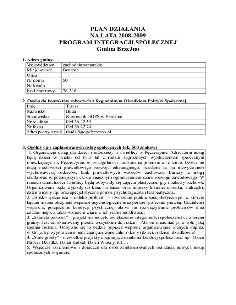 PLAN DZIAŁANIA NA LATA 2008-2009 PROGRAM INTEGRACJI SPOŁECZNEJ Gmina Brzeżno 1. Adres gminy Województwo Miejscowość Ulica Nr domu Nr lokalu Kod pocztowy zachodniopomorskie Brzeżno 50 78-316 2. Osoba do kontaktów roboczych z Regionalnym Ośrodkiem Polityki Społecznej Imię Teresa Nazwisko Buda Stanowisko Kierownik GOPS w Brzeżnie Nr telefonu 094 36 42 591 Nr faksu 094 36 42 741 Adres poczty e-mail [email protected] 3. Ogólny opis zaplanowanych usług społecznych (ok. 500 znaków) 1. Organizacja usług dla dzieci i młodzieży w świetlicy w Pęczerzynie. Adresatami usług będą dzieci w wieku od 6-13 lat z rodzin zagrożonych wykluczeniem społecznym mieszkających w Pęczerzynie, w szczególności narażone na przemoc w rodzinie. Dzieci nie mają możliwości prawidłowego rozwoju edukacyjnego, narażone są na niewydolność wychowawczą rodziców, brak prawidłowych wzorców zachowań. Bariery te mogą skutkować w późniejszym czasie znacznym ograniczeniem szans rozwoju zawodowego. W ramach działalności świetlicy będą odbywały się zajęcia plastyczne, gry i zabawy ruchowe. Organizowane będą wyjazdy do kina, na basen oraz imprezy lokalne: choinka, andrzejki, dzień wiosny itp. oraz specjalistyczna pomoc psychologiczna i terapeutyczna. 2. „Blisko specjalista – daleko problem” - stworzenie punktu specjalistycznego, w którym będzie można otrzymać wsparcie psychologiczne oraz pomoc społeczno-prawną. Udzielenie wsparcia, polepszenie kondycji psychicznej ułatwi im rozwiązywanie problemów dnia codziennego, a także wzmocni wiarę w ich realne możliwości. 3. „Sztafeta pokoleń” – projekt ma na celu zwiększenie integralności społeczeństwa z terenu gminy. Jest on skierowany przede wszystkim do rodzin. Ma on umacniać ją w roli, jaką spełnia rodzina. Odbywać się to będzie poprzez wspólne organizowanie różnych imprez, w których przygotowanie będą zaangażowane całe rodziny (dzieci, rodzice, dziadkowie) 4. „Małe granty” - niewielkie projekty obejmujące działania lokalnej społeczności np.: Dzień Babci i Dziadka, Dzień Kobiet, Dzień Wiosny, itd…. 5. Wsparcie szkoleniowe i doradcze dla osób zainteresowanych realizacją nowych usług społecznych w gminie. 4. Czy planowane usługi są zgodne z zapisami w planach strategicznych gminy (w tym w strategii rozwiązywania problemów społecznych, jeśli istnieje)? TAK Proszę zacytować odpowiednie zapisy: Planowane usługi są zgodne z zapisami Strategii Rozwiązywania Problemów Społecznych. Cel główny IV: Wzmacnianie trwałości rodziny i przeciwdziałanie niekorzystnym zjawiskom dezorganizującym życie rodziny Działania: pkt 3 Tworzenie warunków do powstawania i funkcjonowania świetlic środowiskowych pkt 5 Zorganizowanie zajęć wyrównawczych Cel główny III: Pomoc rodzinom w kryzysie i przeciwdziałanie przemocy w rodzinie Działania: pkt 1 Poradnictwo prawne, psychologiczne i socjalne pkt 3 Pomoc w rozwiązywaniu problemów rodzinie, indywidualne rozmowy pkt 5 Rozszerzenie form pomocy rodzinie NIE Jeśli NIE, proszę o wyjaśnienie rozbieżności: 5. Prognozowany harmonogram realizacji Planu Działania Główne etapy ROK 2008 realizacji Planu Działania Kwartały I II III IV ROK 2009 I II III IV Świetlica środowiskowa w Pęczerzynie Blisko specjalista – daleko problem Sztafeta pokoleń Małe granty Wsparcie szkoleniowe 6. Plan zapotrzebowania na środki finansowe Rodzaje usług zgodnie z Kwota (w złotych) podziałem w punkcie 3, np.: Świetlica środowiskowa w Pęczerzynie „Blisko specjalista – daleko problem” „Sztafeta pokoleń” „Małe granty” Wsparcie szkoleniowe (szkolenia, warsztaty, wizyty studyjne, itp) – do 10% alokacji Razem: % kwoty objętej Planem Działania 43 694,00 28,69 25 200,00 16,54 46 188,46 22 000,00 30,33 14,44 15 231, 38 10,00 152 313,84 100% kwoty objętej Planem Działania Kwota Podział kwot Kwota objęta Planem Działania Kwota pozostająca nadal w dyspozycji Gminy zł % 152 313.84 100 152 313.84 100 Kwota w rozbiciu na kwartały* ROK 2008 I 100% kwoty alokowanej na gminę 152 313,84 RAZEM II III IV ROK 2009 RAZEM I II III IV 41500,00 41731,38 34988,46 12600,00 Kwartały Kwota (w złotych) 21494,00 152313,84 * - szczegółowe dane dotyczące planowanych wydatków w rozbiciu na poszczególne miesiące będą przekazywane zgodnie z rozdziałem 3 Podręcznika Realizacji PIS 6. Oświadczam, że informacje zawarte w niniejszym opisie usług społecznych są zgodne z prawdą. Wyrażam zgodę na udostępnienie niniejszego planu innym instytucjom oraz ekspertom dokonującym ewaluacji i oceny. Imię i nazwisko osoby uprawnionej Stanowisko Miejsce i data Mieczysław Szeredy Wójt Gminy Brzeżno, 30.12.2008r. Podpis i pieczęć osoby uprawnionej 7. Weryfikacja planu (WYPEŁNIA ROPS / KONSULTANT REGIONALNY): Czy wszystkie pola zostały właściwie wypełnione przez gminę? Czy prognozowany koszt działań jest zgodny z kwotą alokowaną na daną gminę? Czy zakres planowanych usług jest zgodny z zapisami w planach strategicznych gminy, w tym w szczególności w strategii rozwiązywania problemów społecznych? PODPIS: ……………. DATA:…………………