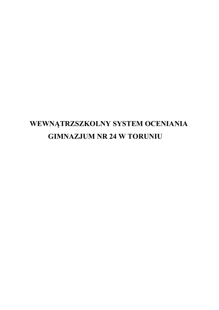 WEWNĄTRZSZKOLNY SYSTEM OCENIANIA GIMNAZJUM NR 24 W TORUNIU PODSTAWA PRAWNA: - Ustawa z dnia 7 września 1991 r. o systemie oświaty (Dz. U. Z 2004 r., Nr 256, poz. 2572, z późn. zm.) - Rozporządzenie MEN z dnia 10czerwca 2015 r. w sprawie warunków i sposobu oceniania, klasyfikowania i promowania uczniów i słuchaczy oraz przeprowadzania sprawdzianów i egzaminów w szkołach publicznych (Dz. U. 2015 r., poz. 843) - Rozporządzenie MEN z dnia 25 czerwca 2015 r. w sprawie szczegółowych warunków i sposobu przeprowadzania sprawdzianu, egzaminu gimnazjalnego i egzaminu maturalnego (Dz. U. z 2015r., poz. 959) - Rozporządzenie MEN z dnia 23grudnia 2008 r. w sprawie podstawy programowej wychowania przedszkolnego i kształcenia ogólnego w poszczególnych typach szkół (Dz. U. z 2009 r., Nr 4, poz. 17) - Rozporządzenie MEN z dnia 28 maja 2010 r. w sprawie świadectw, dyplomów państwowych i innych druków szkolnych (Dz. U. z 2010 r., Nr 97, poz. 624) - Rozporządzenie MEN z dnia 30 kwietnia 2013 r. w sprawie zasad udzielania i organizacji pomocy psychologiczno-pedagogicznej w publicznych przedszkolach, szkołach i placówkach (Dz. U. 2013 r., Nr 0, poz. 532) - Statut Gimnazjum nr 24 im. Szarych Szeregów w Toruniu 2 Spis treści: Rozdział I - Postanowienia ogólne. Rozdział II - Formy wyrażania wewnątrzszkolnej oceny. Rozdział III - Sposoby sprawdzania osiągnięć uczniów. Rozdział IV - Ogólne wymagania edukacyjne na poszczególne oceny edukacyjne. Rozdział V - Klasyfikowanie i promowanie uczniów. Rozdział VI - Egzamin klasyfikacyjny. Rozdział VII - Egzamin poprawkowy. Rozdział VIII - Procedury odwoławcze od ocen rocznych z zajęć edukacyjnych. Rozdział IX - Zasady oceniania zachowania. Rozdział X - Procedury odwoławcze od rocznej oceny zachowania. Rozdział XI - Pomoc uczniom mającym trudności w nauce. Rozdział XII - Rozwijanie zdolności i zainteresowań uczniów. Rozdział XIII - Pomoc psychologiczno – pedagogiczna udzielana uczniom. Rozdział XIV - Sposoby informowania uczniów i rodziców na temat wymagań edukacyjnych i zasad oceniania. Rozdział XV - Zasady usprawiedliwiania nieobecności ucznia na zajęciach edukacyjnych. Rozdział XVI – Wyróżnienia i nagrody. Rozdział XVII - Egzamin gimnazjalny. Rozdział XVIII - Zasady i warunki realizacji projektów edukacyjnych. Załączniki: Zasady oceniania zachowania: Nr 1 – Ogólne kryteria zachowania uczniów. Nr 2 – Opisowe kategorie zachowań uczniów. Nr 3 – Pochwała i nagana wychowawcy i dyrektora. Nr 4 – Karta oceny zachowania ucznia. Projekt edukacyjny: Nr 5 – Karta zgłoszenia projektu. Nr 6 – Karta projektu Nr 7 – Kontrakt Nr 8 – Karta oceny projektu Nr 9 – Karta samooceny ucznia Nr 10 – Karta oceny prezentacji Nr 11 – Karta zaliczenia projektu Metody i formy pracy z uczniem z dysleksją rozwojową: Nr 12 – język polski Nr 13 - języki obce Nr 13 – przedmioty matematyczno - przyrodnicze 3 Rozdział I POSTANOWNIENIA OGÓLNE 1. Ocenianie wewnątrzszkolne osiągnięć edukacyjnych ucznia polega na rozpoznawaniu przez nauczycieli poziomu i postępów w opanowaniu przez ucznia wiadomości i umiejętności w stosunku do wymagań edukacyjnych wynikających z podstawy programowej i realizowanych w szkole programów nauczania uwzględniających tę podstawę. 2. Ocenianie wewnątrzszkolne obejmuje również ustalenie sposobu i kryteriów oceny projektu edukacyjnego. 3. Oceny ucznia dokonują nauczyciele prowadzący poszczególne obowiązkowe i dodatkowe zajęcia edukacyjne, wychowawca klasy i inne osoby biorące udział w procesie kształcenia i wychowania oraz sami uczniowie (samoocena ucznia). 4. Ocenianiu podlegają: a) osiągnięcia edukacyjne ucznia; b) zachowanie. 5. Ocenianie osiągnięć edukacyjnych i zachowania ucznia odbywa się w ramach oceniania wewnątrzszkolnego i ma na celu: a) informowanie ucznia o poziomie jego osiągnięć edukacyjnych i jego zachowaniu oraz o postępach w tym zakresie; b) udzielenie uczniowi pomocy w nauce poprzez przekazanie mu informacji o tym, co zrobił dobrze i jak powinien się dalej uczyć, c) udzielenie wskazówek do samodzielnego planowania własnego rozwoju, d) motywowanie ucznia do dalszych postępów w nauce i zachowaniu; e) dostarczenie rodzicom (prawnym opiekunom) i nauczycielom informacji (opinii) o postępach i trudnościach w nauce i zachowaniu ucznia oraz o szczególnych uzdolnieniach ucznia; f) umożliwienie nauczycielom doskonalenia organizacji i metod pracy dydaktyczno – wychowawczej. 6. Ocenianie wewnątrzszkolne obejmuje: a) formułowanie przez nauczycieli wymagań edukacyjnych niezbędnych do otrzymania przez ucznia poszczególnych śródrocznych i rocznych ocen klasyfikacyjnych z obowiązkowych i dodatkowych zajęć edukacyjnych, b) ustalenie kryteriów oceniania zachowania, c) ustalenie ocen bieżących i śródrocznych ocen klasyfikacyjnych z obowiązkowych i dodatkowych zajęć edukacyjnych, d) przeprowadzanie egzaminów klasyfikacyjnych, e) ustalenie rocznych ocen klasyfikacyjnych z obowiązkowych i dodatkowych zajęć edukacyjnych oraz rocznej oceny klasyfikacyjnej zachowania, f) ustalenie warunków i trybu otrzymania wyższych niż przewidywane rocznych ocen klasyfikacyjnych z zajęć edukacyjnych oraz rocznej oceny klasyfikacyjnej zachowania, g) ustalenie warunków i sposobu przekazywania rodzicom informacji o postępach i trudnościach w nauce i zachowaniu ucznia oraz o szczególnych uzdolnieniach ucznia. 4 Rozdział II FORMY WYRAŻANIA WEWNĄTRZSZKOLNEJ OCENY 1. Ocena wiadomości i umiejętności wyrażana jest stopniem w skali sześciostopniowej: 6 – stopień celujący – „ cel.” 5 – stopień bardzo dobry – „ bdb” 4 – stopień dobry – „ db” 3 – stopień dostateczny – „ dst” 2 – stopień dopuszczający – „ dop.” 1 – stopień niedostateczny – „ ndst’’ 2. W ocenach cząstkowych można stosować znaki: plus (+) i minus (-); 3. Przy ustalaniu oceny śródrocznej 
