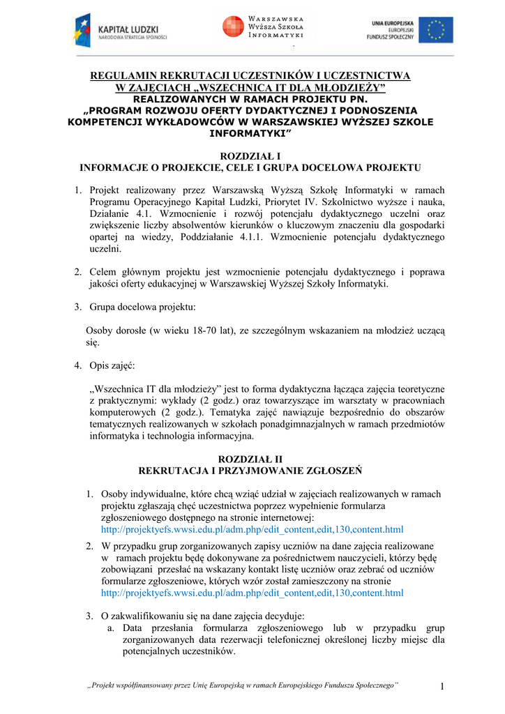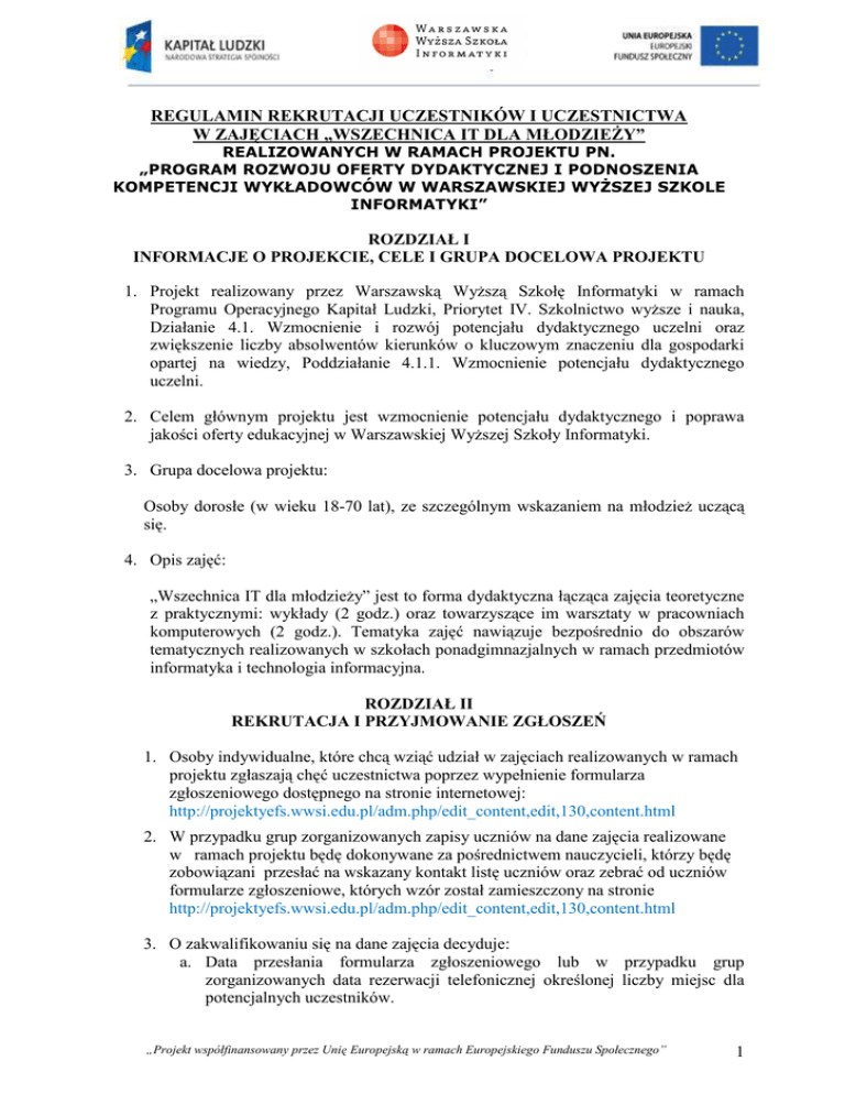 REGULAMIN REKRUTACJI UCZESTNIKÓW I UCZESTNICTWA W ZAJĘCIACH „WSZECHNICA IT DLA MŁODZIEŻY” REALIZOWANYCH W RAMACH PROJEKTU PN. „PROGRAM ROZWOJU OFERTY DYDAKTYCZNEJ I PODNOSZENIA KOMPETENCJI WYKŁADOWCÓW W WARSZAWSKIEJ WYŻSZEJ SZKOLE INFORMATYKI” ROZDZIAŁ I INFORMACJE O PROJEKCIE, CELE I GRUPA DOCELOWA PROJEKTU 1. Projekt realizowany przez Warszawską Wyższą Szkołę Informatyki w ramach Programu Operacyjnego Kapitał Ludzki, Priorytet IV. Szkolnictwo wyższe i nauka, Działanie 4.1. Wzmocnienie i rozwój potencjału dydaktycznego uczelni oraz zwiększenie liczby absolwentów kierunków o kluczowym znaczeniu dla gospodarki opartej na wiedzy, Poddziałanie 4.1.1. Wzmocnienie potencjału dydaktycznego uczelni. 2. Celem głównym projektu jest wzmocnienie potencjału dydaktycznego i poprawa jakości oferty edukacyjnej w Warszawskiej Wyższej Szkoły Informatyki. 3. Grupa docelowa projektu: Osoby dorosłe (w wieku 18-70 lat), ze szczególnym wskazaniem na młodzież uczącą się. 4. Opis zajęć: „Wszechnica IT dla młodzieży” jest to forma dydaktyczna łącząca zajęcia teoretyczne z praktycznymi: wykłady (2 godz.) oraz towarzyszące im warsztaty w pracowniach komputerowych (2 godz.). Tematyka zajęć nawiązuje bezpośrednio do obszarów tematycznych realizowanych w szkołach ponadgimnazjalnych w ramach przedmiotów informatyka i technologia informacyjna. ROZDZIAŁ II REKRUTACJA I PRZYJMOWANIE ZGŁOSZEŃ 1. Osoby indywidualne, które chcą wziąć udział w zajęciach realizowanych w ramach projektu zgłaszają chęć uczestnictwa poprzez wypełnienie formularza zgłoszeniowego dostępnego na stronie internetowej: http://projektyefs.wwsi.edu.pl/adm.php/edit_content,edit,130,content.html 2. W przypadku grup zorganizowanych zapisy uczniów na dane zajęcia realizowane w ramach projektu będę dokonywane za pośrednictwem nauczycieli, którzy będę zobowiązani przesłać na wskazany kontakt listę uczniów oraz zebrać od uczniów formularze zgłoszeniowe, których wzór został zamieszczony na stronie http://projektyefs.wwsi.edu.pl/adm.php/edit_content,edit,130,content.html 3. O zakwalifikowaniu się na dane zajęcia decyduje: a. Data przesłania formularza zgłoszeniowego lub w przypadku grup zorganizowanych data rezerwacji telefonicznej określonej liczby miejsc dla potencjalnych uczestników. „Projekt współfinansowany przez Unię Europejską w ramach Europejskiego Funduszu Społecznego” 1 b. Spełnienie kryterium dotyczącego statusu danego uczestnika. c. Dostępność miejsc na poszczególne zajęcia. 4. Warunkiem udziału w zajęciach jest złożenie i podpisanie w dniu zajęć Oświadczenia uczestnika o wyrażeniu zgody na przetwarzanie danych osobowych i deklaracji uczestnictwa w projekcie, którego wzór znajduje się na stronie internetowej http://projektyefs.wwsi.edu.pl/adm.php/edit_content,edit,130,content.html 5. W ramach projektu dla grup zorganizowanych (min. 40 osób, max. 48 osób), organizator zapewnia bezpłatny dojazd autokarem (dotyczy grup dojeżdżających z miejscowości oddalonych od Warszawy ponad 50 km). W przypadku grup zorganizowanych (w szczególności szkół) opiekun grupy ma prawo polecić firmę transportową z którą wcześniej współpracował o ile cena przejazdu nie odbiega od cen rynkowych. 6. Organizator nie zapewnia wyżywienia podczas zajęć. 7. Jedna osoba może uczestniczyć tylko w jednych wybranych przez siebie zajęciach. W przypadku grup zorganizowanych w tym szkół, jedna szkoła może zgłosić trzy różne grupy. 8. Rekrutację osób do uczestnictwa w zajęciach objętych projektem prowadzi pracownik Biura Projektu przypisany do tego zadania. 9. Proces rekrutacji rozpocznie się z dniem 16 września 2010 r. i trwać będzie do momentu zamknięcia list podstawowych oraz list rezerwowych na poszczególne zajęcia. 10. W przypadku rezygnacji danej osoby/grupy z uczestnictwa w zajęciach należy poinformować Biuro projektu nie później niż na dziesięć dni przed terminem ich realizacji. 11. Rekrutacja uwzględnia zasadę równych szans, w tym równości płci. ROZDZIAŁ III WARUNKI UCZESTNICTWA 1. Zajęcia będą odbywały się w siedzibie Warszawskiej Wyższej Szkoły Informatyki przy ul. Lewartowskiego 17 w Warszawie. 2. Uczestnik zobowiązuje się do uczestnictwa we wszystkich zajęciach, na które się zakwalifikował oraz do wypełniania w trakcie zajęć testów sprawdzających i ankiet ewaluacyjnych oraz potwierdzenia swojego uczestnictwa na liście obecności. 3. Uczestnik zobowiązany jest do udostępnienia swoich danych osobowych dla celów związanych z realizacją, monitoringiem i ewaluacją projektu w ramach, którego realizowane jest szkolenie. „Projekt współfinansowany przez Unię Europejską w ramach Europejskiego Funduszu Społecznego” 2 4. Warszawska Wyższa Szkoła Informatyki zastrzega sobie prawo do odwołania lub zmiany terminu zajęć z przyczyn losowych-informacja ta zostanie przekazana uczestnikom za pośrednictwem poczty elektronicznej i zamieszczona na stronie internetowej: http://projektyefs.wwsi.edu.pl/. ROZDZIAŁ IV PRAWA UCZESTNIKA SZKOLENIA Każdy uczestnik zajęć ma prawo do: 1. Bezpłatnego udziału w zajęciach, na które się zakwalifikował i w których uczestniczy zgodnie z warunkami uczestnictwa opisanymi w Rozdziale III niniejszego Regulaminu. 2. Zgłaszania uwag i oceny zajęć, w którym uczestniczy. 3. Otrzymania materiałów szkoleniowych w formie elektronicznej oraz zaświadczenia o uczestnictwie w zajęciach. ROZDZIAŁ V POSTANOWIENIA KOŃCOWE 1. Regulamin obowiązuje od dnia 16 września 2010 roku. 2. Aktualna treść Regulaminu dostępna jest w Biurze projektu oraz na stronie internetowej http://projektyefs.wwsi.edu.pl/. 3. Warszawska Wyższa Szkoła Informatyki zastrzega sobie prawo do zmiany niniejszego Regulaminu, o czym niezwłocznie poinformuje zainteresowanych. 4. Akceptacja zasad udziału w zajęciach, wynikających z niniejszego Regulaminu i podpi
