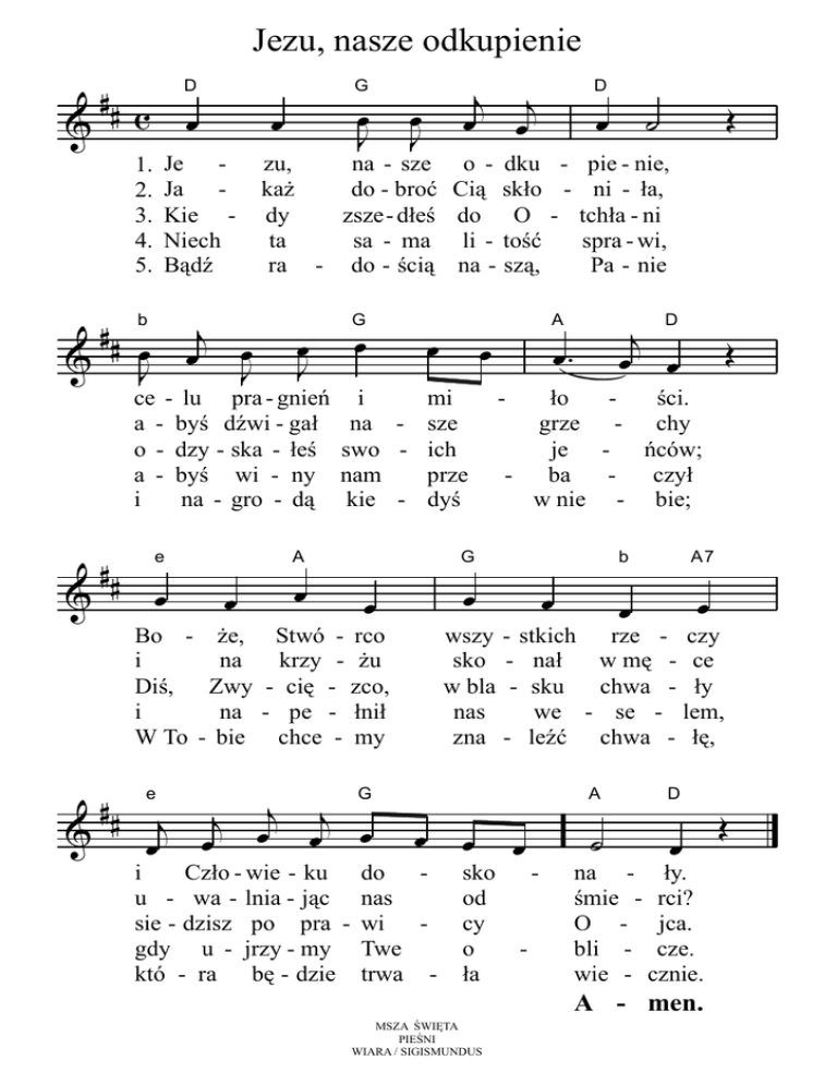 Jezu, nasze odkupienie & ## D c œ & ## j œ œJ b œ J œ J œ Je Ja Kie Niech Bądź 1. 2. 3. 4. 5. G & e œ œ J œ J œ G œ & Œ ˙ œ i Czło - wie - ku u - wa - lnia - jąc sie - dzisz po pra gdy u - jrzy - my któ - ra bę - dzie D œ. - œ wszy - stkich sko - nał w bla - sku nas we zna - leźć G œ œ do nas wi Twe trwa - sko od cy o ła Œ ło ści. grze - chy je - ńców; - ba czył w nie - bie; œ œ j j œj œj œ œ œ e j œ œ G Bo - Ŝe, Stwó - rco i na krzy - Ŝu Diś, Zwy - cię - zco, i na - pe - łnił W To - bie chce - my ## œ A œ i mi na - sze swo - ich nam prze kie - dyś A œ D zu, na - sze o - dku - pie - nie, kaŜ do - broć Cią skło - ni - ła, dy zsze - dłeś do O - tchła - ni spra - wi, ta sa - ma li - tość Pa - nie ra - do - ścią na - szą, ce - lu pra - gnień a - byś dźwi - gał o - dzy - ska - łeś a - byś wi - ny i na - gro - dą ## j j œ œ œ - - b A7 œ œ rze - czy w mę - ce chwa - ły - se - lem, chwa - łę, A D ˙ œ na - ły. śmie - rci? O - jca. bli - cze. wie - cznie. A - men. MSZA ŚWIĘTA PIEŚNI WIARA / SIGISMUNDUS Œ