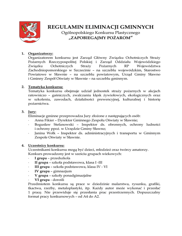 REGULAMIN ELIMINACJI GMINNYCH Ogólnopolskiego Konkursu Plastycznego „ZAPOBIEGAJMY POŻAROM” 1. Organizatorzy: Organizatorem konkursu jest Zarząd Główny Związku Ochotniczych Straży Pożarnych Rzeczypospolitej Polskiej i Zarząd Oddziału Wojewódzkiego Związku Ochotniczych Straży Pożarnych RP Województwa Zachodniopomorskiego w Szczecinie – na szczeblu wojewódzkim, Starostwo Powiatowe w Sławnie – na szczeblu powiatowym, Urząd Gminy Sławno i Gminny Zespół Oświaty w Sławnie – na szczeblu gminnym. 2. Tematyka konkursu: Tematyka konkursu obejmuje udział jednostek straży pożarnych w akcjach ratowniczo – gaśniczych, zwalczaniu klęsk żywiołowych, ekologicznych oraz w szkoleniu, zawodach, działalności prewencyjnej, kulturalnej i historię pożarnictwa. 3. Jury: Eliminacje gminne przeprowadza Jury złożone z następujących osób: ⋅ Anna Fikier – Dyrektor Gminnego Zespołu Oświaty w Sławnie; ⋅ Bogusław Stefanowski – Inspektor ds. obronnych, ochrony ludności i ochrony ppoż. w Urzędzie Gminy Sławno; ⋅ Janina Wołk – Inspektor ds. administracyjnych i transportu w Gminnym Zespole Oświaty w Sławnie. 4. Uczestnicy konkursu: Uczestnikami konkursu mogą być dzieci, młodzież oraz twórcy amatorzy. Konkurs prowadzony jest w sześciu grupach wiekowych: ⋅ I grupa – przedszkola ⋅ II grupa – szkoła podstawowa, klasa I -III ⋅ III grupa – szkoła podstawowa, klasa IV - VI ⋅ IV grupa – gimnazjum ⋅ V grupa – szkoły ponadgimazjalne ⋅ VI grupa - dorośli Przedmiotem konkursu są prace w dziedzinie malarstwa, rysunku, grafiki, tkactwa, rzeźby, metaloplastyki, itp. Każdy autor może wykonać i przesłać 1 pracę. Nie przewiduje się przesłania prac przestrzennych. Dopuszczalny format pracy konkursowych – od A4 do A2. 5. Termin nadsyłania prac i etapy eliminacji: Termin nadsyłania prac na eliminacje gminne konkursu upływa 12 grudnia 2014 r. Prace należy nadsyłać lub doręczyć na adres: Gminny Zespół Oświaty w Sławnie ul. M. C. Skłodowskiej 9 76-100 Sławno Każda praca powinna mieć przyklejoną metryczkę z danymi uczestnika (wg wzoru). Rozstrzygnięcie konkursu na etapie gminnym nastąpi do dnia 15 grudnia 2014 r. Najlepsze prace zostaną zakwalifikowane do etapu eliminacji powiatowych. Etap eliminacji powiatowych zakończy się najpóźniej w dniu 31 grudnia 2014 r. Etap wojewódzki zostanie rozstrzygnięty do 31 stycznia 2014 r. Prace przesłane po terminie nie będą brane pod uwagę w konkursie. 6. Postanowienia końcowe Prace nagrodzone na szczeblu gminnych zaprezentowane zostaną w formie wystawy. Wyniki konkursu eliminacji centralnych ogłaszane będą w czasopiśmie „Strażak” i na stronie internetowej Związku Ochotniczych Straży Pożarnych RP. Organizator konkursu zastrzega sobie prawo pozostawienia prac i wykorzystania ich do potrzeb wydawniczych i promocyjnych.