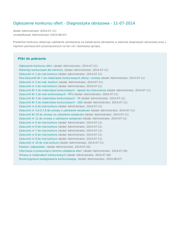 Ogłoszenie konkursu ofert - Diagnostyka obrazowa - 11-07-2014 dodał: Administrator (2014-07-11) zmodyfikował: Administrator (2014-08-07) Przedmiot konkursu obejmuje udzielenie zamówienia na świadczenia zdrowotne w zakresie diagnostyki obrazowej wraz z najmem pomieszczeń przeznaczonych na ten cel i dzierżawą sprzętu. Pliki do pobrania Ogłoszenie konkursu ofert. (dodał: Administrator, 2014-07-11) Materialy konkursowe dla oferenta. (dodał: Administrator, 2014-07-11) Zalacznik nr 1 do mat.konkurs (dodał: Administrator, 2014-07-11) 03a-Zalacznik Nr 1 do materialow konkursowych oferty i umowy (dodał: Administrator, 2014-07-11) Zalacznik nr 2 do mat. konkurs (dodał: Administrator, 2014-07-11) Zalacznik nr 3 do mat.konkurs (dodał: Administrator, 2014-07-11) Zalacznik Nr 3 do materialow konkursowych - Aparat do znieczulenia (dodał: Administrator, 2014-07-11) Zalacznik Nr 3 do mat konkursowych - RTG (dodał: Administrator, 2014-07-11) Zalacznik Nr 3 do materialow konkursowych - TK (dodał: Administrator, 2014-07-11) Zalacznik Nr 3 do materialow konkursowych - USG (dodał: Administrator, 2014-07-11) Zalacznik nr 4 do mat.konkurs (dodał: Administrator, 2014-07-11) Zalacznik nr 3,4,5,7,9 do umowy o udzielanie swiadczen (dodał: Administrator, 2014-07-11) Zalacznik Nr 10 do umowy na udzielanie swiadczen (dodał: Administrator, 2014-07-11) Zalacznik nr 11 do umowy o udzielanie swiadczen (dodał: Administrator, 2014-07-11) Zalacznik nr 5 do mat.konkurs (dodał: Administrator, 2014-07-11) Zalacznik nr 6 do mat.konkurs (dodał: Administrator, 2014-07-11) Zalacznik nr 7 do mat.konkurs (dodał: Administrator, 2014-07-11) Zalacznik nr 8 do mat.konkurs (dodał: Administrator, 2014-07-11) Zalacznik nr 9 do mat.konkurs (dodał: Administrator, 2014-07-11) Zalacznik nr 10 do mat.konkurs (dodał: Administrator, 2014-07-11) Pytania i odpowiedzi. (dodał: Administrator, 2014-07-25) Informacja o przesunięciu terminu składania ofert. (dodał: Administrator, 2014-07-29) Zmiany w materiałach konkursowych (dodał: Administrator, 2014-07-30) Rozstrzygnięcie postępowania konkursowego. (dodał: Administrator, 2014-08-07)