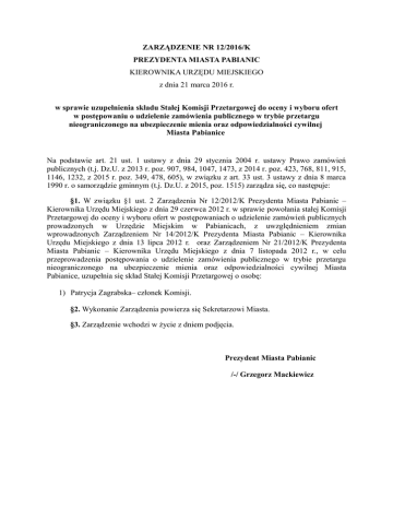 ZARZĄDZENIE NR 12/2016/K PREZYDENTA MIASTA PABIANIC KIEROWNIKA URZĘDU MIEJSKIEGO z dnia 21 marca 2016 r. w sprawie uzupełnienia składu Stałej Komisji Przetargowej do oceny i wyboru ofert w postępowaniu o udzielenie zamówienia publicznego w trybie przetargu nieograniczonego na ubezpieczenie mienia oraz odpowiedzialności cywilnej Miasta Pabianice Na podstawie art. 21 ust. 1 ustawy z dnia 29 stycznia 2004 r. ustawy Prawo zamówień publicznych (t.j. Dz.U. z 2013 r. poz. 907, 984, 1047, 1473, z 2014 r. poz. 423, 768, 811, 915, 1146, 1232, z 2015 r. poz. 349, 478, 605), w związku z art. 33 ust. 3 ustawy z dnia 8 marca 1990 r. o samorządzie gminnym (t.j. Dz.U. z 2015, poz. 1515) zarządza się, co następuje: §1. W związku §1 ust. 2 Zarządzenia Nr 12/2012/K Prezydenta Miasta Pabianic – Kierownika Urzędu Miejskiego z dnia 29 czerwca 2012 r. w sprawie powołania stałej Komisji Przetargowej do oceny i wyboru ofert w postępowaniach o udzielenie zamówień publicznych prowadzonych w Urzędzie Miejskim w Pabianicach, z uwzględnieniem zmian wprowadzonych Zarządzeniem Nr 14/2012/K Prezydenta Miasta Pabianic – Kierownika Urzędu Miejskiego z dnia 13 lipca 2012 r. oraz Zarządzeniem Nr 21/2012/K Prezydenta Miasta Pabianic – Kierownika Urzędu Miejskiego z dnia 7 listopada 2012 r., w celu przeprowadzenia postępowania o udzielenie zamówienia publicznego w trybie przetargu nieograniczonego na ubezpieczenie mienia oraz odpowiedzialności cywilnej Miasta Pabianice, uzupełnia się skład Stałej Komisji Przetargowej o osobę: 1) Patrycja Zagrabska– członek Komisji. §2. Wykonanie Zarządzenia powierza się Sekretarzowi Miasta. §3. Zarządzenie wchodzi w życie z dniem podjęcia. Prezydent Miasta Pabianic /-/ Grzegorz Mackiewicz