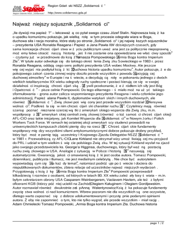 Region Gda ski NSZZ „Solidarno http://www.solidarnosc.gda.pl Najwa niejszy sojusznik „Solidarno ci „Ile dywizji ma papie ? ‒ lekcewa co pytał swego czasu Józef Stalin. Najnowsza ksi ka o upadku komunizmu pokazuje, jak wielk rol w tym procesie odegrała wiara w Boga, duchowa siła i racja moralna, które stały po stronie „Solidarno ci i jej najwi kszych sojuszników ‒ prezydenta USA Ronalda Reagana i Papie a Jana Pawła II.W dzisiejszych czasach, gdy sama koncepcja chrze cija stwa w yciu publicznym uwa ana jest za politycznie niepoprawn , mo emy łatwo straci nasz histori , je li nie zostanie ona opowiedziana we wła ciwy sposób ‒ czytamy ju w przedmowie do ksi Tomasza ki Pompowskiego „Armia Boga kontra Imperium Zła . W tytule autor odwołuje si do takiego okre lenia Zwi zku Sowieckiego w 1983 r. przez Ronalda Reagana, oddaj cego sens polityki prezydenta USA wobec Moskwy. Ale jeszcze wi cej wyja nia podtytuł ksi ki: „Duchowa historia upadku komunizmu . Autor pokazuje, e do pokojowego zako czenia zimnej wojny doszło przede wszystkim z powodu „sprzyjaj cej duchowej atmosfery w Europie i na wiecie, a decyduj c rol w pokonaniu jednego z dwóch wielkich totalitaryzmów XX wieku odegrały ruchy społeczne i postaci kieruj ce si w swojej działalno ci inspiracj chrze cija sk . „ ywili przekonanie, e ródłem ich siły jest Bóg i Opatrzno ‒ pisze celnie Pompowski. Do tego elitarnego ‒ miało mo na u y takiego sformułowania ‒ grona autor zalicza wspomnianego prezydenta Reagana i wielu członków jego administracji, Papie aJana Pawła II, dyplomatów watyka skich i innych duchownych, ale równie „Solidarno . Zwi zkowi po wi cony jest przede wszystkim rozdział „Ofensywa wolno ci . Podkre la si w nim chrze cija ski charakter ruchu „S . Czytelnicy maj równie szans pozna nieznane szerzej w tki z ameryka skiego wsparcia dla Zwi zku, m.in. współprac z „S ameryka skiej centrali zwi zkowej (równie o to samo ci chrze cija skiej) AFL-CIO oraz takie inicjatywy, jak Komitet Wsparcia dla „Solidarno ci w Nowym Jorku i Polish Workers Task Force. W ramach tej ostatniej akcji ameryka scy studenci prowadzili na uniwersyteckich kampusach zbiórki pieni dzy na rzecz „S . Chrze cija skie fundamenty współpracy mi dzy wszystkimi siłami antykomunistycznymi dobrze pokazuje drobny przykład, który by mo e pami taj uczestnicy I Krajowego Zjazdu Delegatów NSZZ „Solidarno w 1981 r. Przewodnicz cy AFL-CIOLane Kirkland nie otrzymał wizy umo liwiaj cej mu przyjazd do PRL i udział w tym wielkim wi cie polskiego Zwi zku. W tej sytuacji Kirkland wysłał na zjazd jako swojego przedstawiciela ks. George a Higginsa, duchownego, który był wa n postaci ruchu zwi zkowego w USA. Analogie z sytuacj w Polsce i histori „S nasuwaj si automatycznie. Gwarancj jako ci omawianej ksi ki jest osoba autora. Tomasz Pompowski, dziennikarz, publicysta i tłumacz, nie jest medialnym celebryt . Nie chce by autorytetem wypowiadaj cym si „na ka dy temat , natomiast podró uje po wiecie i dociera do niepublikowanych dokumentów, zbiera relacje od uczestników najwa niejszych wydarze . Przygotowuj c ksi k „Armia Boga kontra Imperium Zła Pompowski przeprowadził kilkadziesi t rozmów z osobami, od których w latach 80. XX wieku zale ały losy wiata ‒ m.in. byłym sekretarzem obrony USA Casparem Weinbergerem, Vaclavem Havlem, ale te z byłymi oficerami KGB (którzy pó niej uciekli na Zachód)Olegiem Kaługinem i Olegiem Gordijewskim. Autor rozmawiał równie dwukrotnie ze p.Ann Walentynowicz. Ksi ka pokazuje fundamenty zwyci stwa wolno ci nad komunizmem. Wbrew pozorom nie dla wszystkich s one oczywiste, dlatego warto zapozna si z dobrze udokumentowanymi i przyst pnie podanymi opiniami autora. eby nie zapomnie o tym, kto nie tylko wygrał, ale przede wszystkim ‒ miał racj . Adam Chmielecki Tomasz Pompowski, „Armia Boga kontra Imperium Zła. Duchowa historia page 1 / 2 Region Gda ski NSZZ „Solidarno http://www.solidarnosc.gda.pl upadku komunizmu , Dom Wydawniczy Rafael, Kraków 2012, okładka twarda, 292 s. page 2 / 2 Powered by TCPDF (www.tcpdf.org)