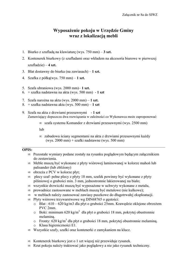 Załącznik nr 8a do SIWZ WyposaŜenie pokoju w Urzędzie Gminy wraz z lokalizacją mebli 1. Biurko z szufladą na klawiaturę (wys. 750 mm) – 3 szt. 2. Kontenerek biurkowy (z szufladami oraz wkładem na akcesoria biurowe w pierwszej szufladzie) – 4 szt. 3. Blat dostawny do biurka (na zawiasach) – 1 szt. 4. Szafka z półką(wys. 750 mm) – 1 szt. 5. Szafa ubraniowa (wys. 2000 mm)– 1 szt. 6. + szafka nadstawna na akta (wys. 500 mm) - 1 szt 7. Szafa naroŜna na akta (wys. 2000 mm) – 1 szt. 8. + szafka nadstawna akta (wys. 500 mm) – 1 szt 9. Szafa na akta z drzwiami przesuwnymi - 1 szt Zamawiający dopuszcza dwa rozwiązania w zaleŜności co Wykonawca moŜe zaproponować: • szafa systemu Komandor z drzwiami przesuwnymi (wys. 2500 mm) lub • zabudowa ściany segmentami na akta z drzwiami przesuwnymi kaŜdy (wys. 2000 mm) + szafki nadstawne (wys. 500 mm) OPIS: • Pozostałe wymiary podane zostały na rysunku poglądowym będącym załącznikiem do zestawienia. • Meble muszą być wykonane z płyty wiórowej laminowanej w kolorze mahoń lub palisander (lub zbliŜony) • obrzeŜa z PCV w kolorze płyt; • plecy szaf- pełne plecy z płyty 18 mm, szafek powinny być wykonane z płyty pilśniowej o grubości min. 3 mm, jednostronnie lakierowanej na biało; • wszystkie drzwiczki muszą być wyposaŜone w uchwyty wykonane z metalu, • prowadnice zastosowane w meblach muszą być metalowe (nie kulkowe); • w meblach naleŜy zastosować zawiasy puszkowe do długotrwałej eksploatacji. • Płyty wiórowe trzywarstwowe wg DIN68765 o gęstości: o Blat : 610 – 620 kg/m3 dla płyt o grubości 25mm. Krawędzie oklejone obrzeŜem PVC 2mm. o Boki: minimum 620 kg/m3 dla płyt o grubości 18 mm, pokrytej obustronnie melaminą. o Fronty: 620 kg/m3 dla płyt o grubości 18 mm, pokrytej obustronnie melaminą. o Klasa higieniczności E1. • Wszystkie szafy, szafki oraz kontenerki z zamykaniem na klucz. • Kontenerek biurkowy jest o 1 szt więcej niŜ przewiduje rysunek. • Rzut pokoju naleŜy traktować jako poglądowy a nie jako rysunek techniczny.